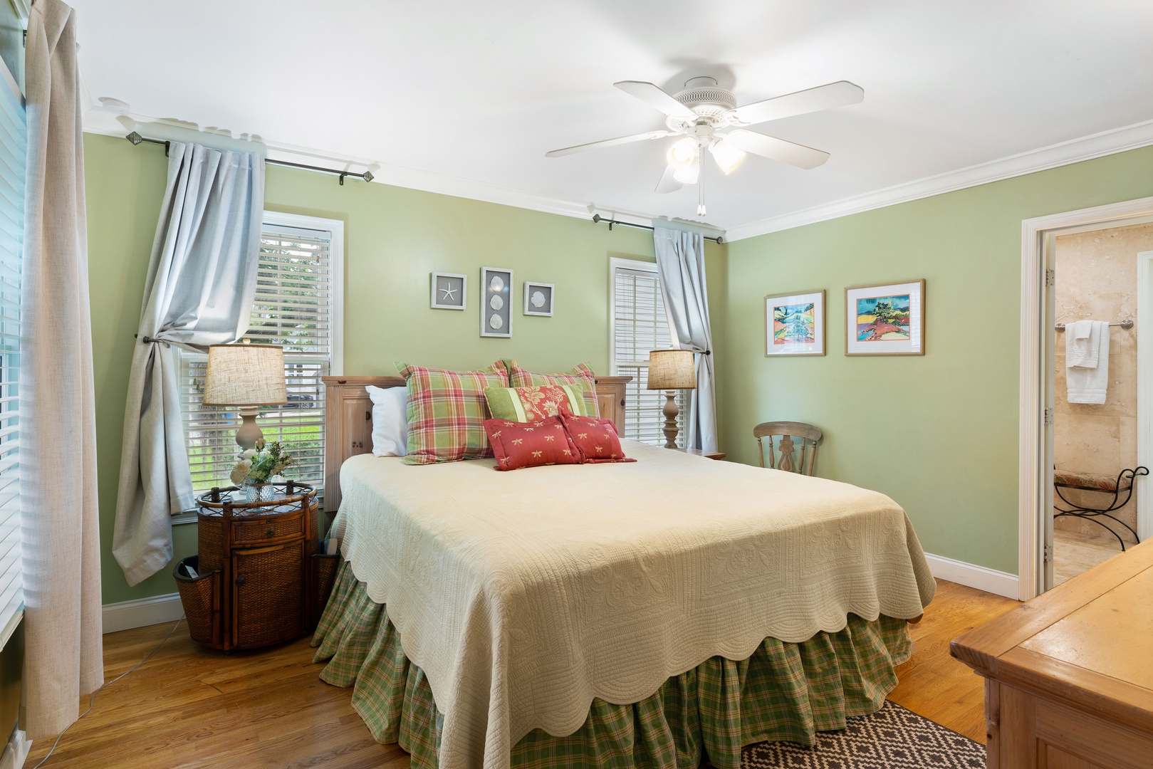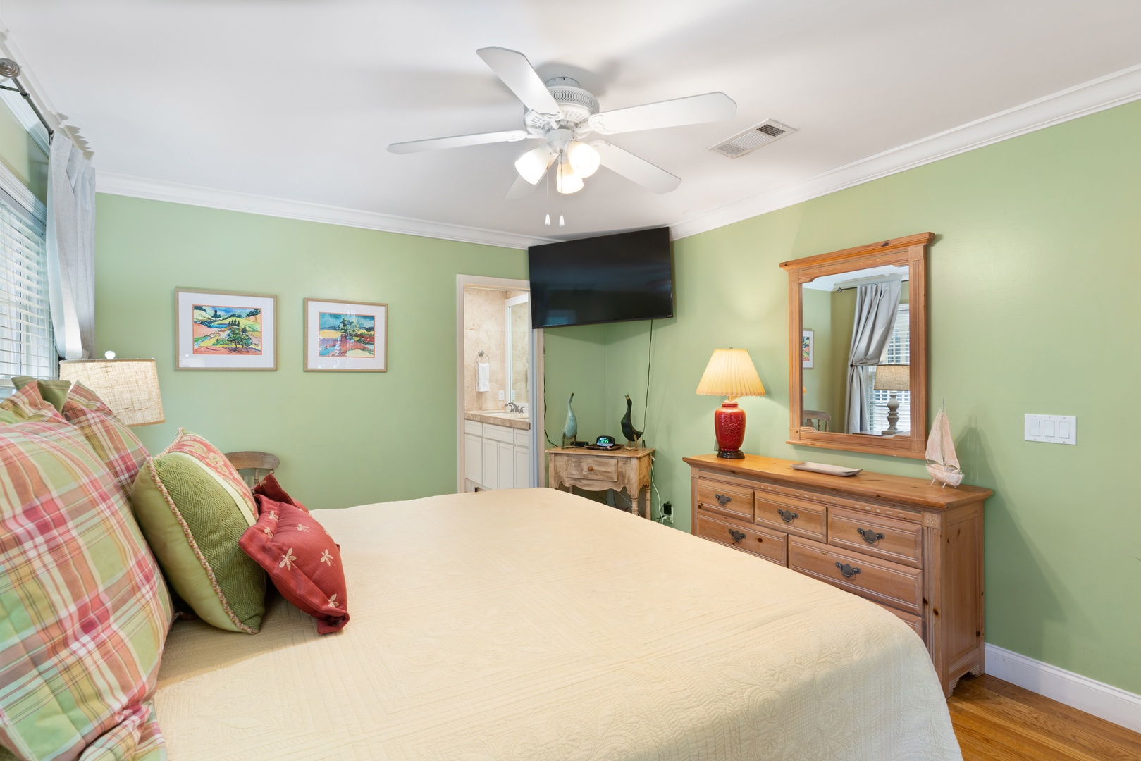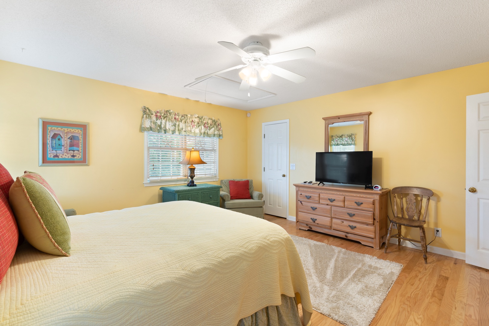 Master is on the main level with a king size bed, adjoining bath with double vanity, separate shower and tub. Two guest bedrooms are upstairs with a queen and a full size bed, which share a hall bathroom. Half bath downstairs off living space. Sleeper sofa located in the family room. There is an additional TV/Sunroom off the Kitchen.
