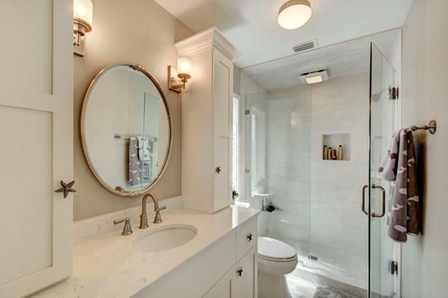 The downstairs includes 2 full baths - one with a shower/tub combo and the other with a shower.
