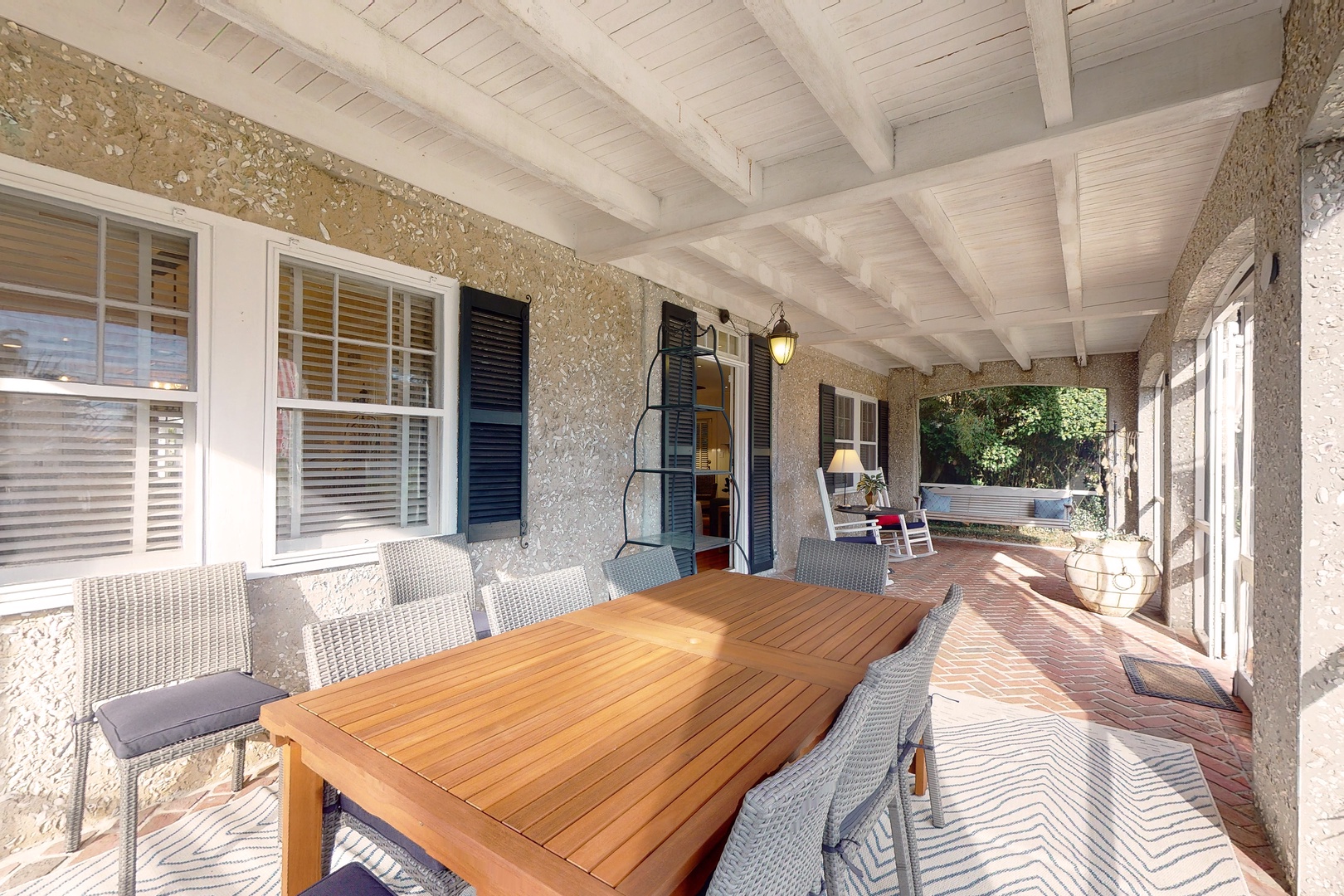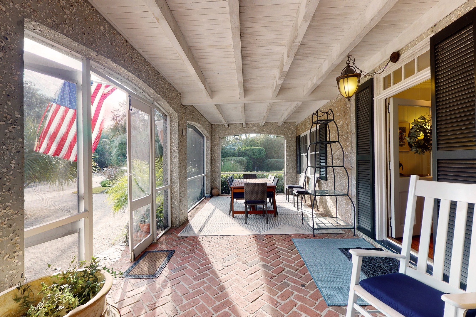 As you enter the home, you are greeted by a true southern style screened in porch with brick flooring and ocean views. There is plenty of outdoor seating with swing, dining table for 10 and a couple of rocking chairs. Once you enter the home into the family room, there is a comfortable space with a queen sleeper sofa for the early riser in your group, gas log fireplace for decoration only and a piano. Off the family room is an additional sitting area with wet bar. To the left of the family room is a large dining room with seating for 8 people, which opens into a fully equipped kitchen with Subzero refrigerator, gas stove, microwave, coffee maker, place setting for twelve guests. In the back of the home is another generous size sunroom with TV and games. Here you can access the private back yard with deck, hot and cold water outdoor shower, and gas grill. There is a washer and dryer for your use on the main level. Centrally located downstairs is a full bathroom.