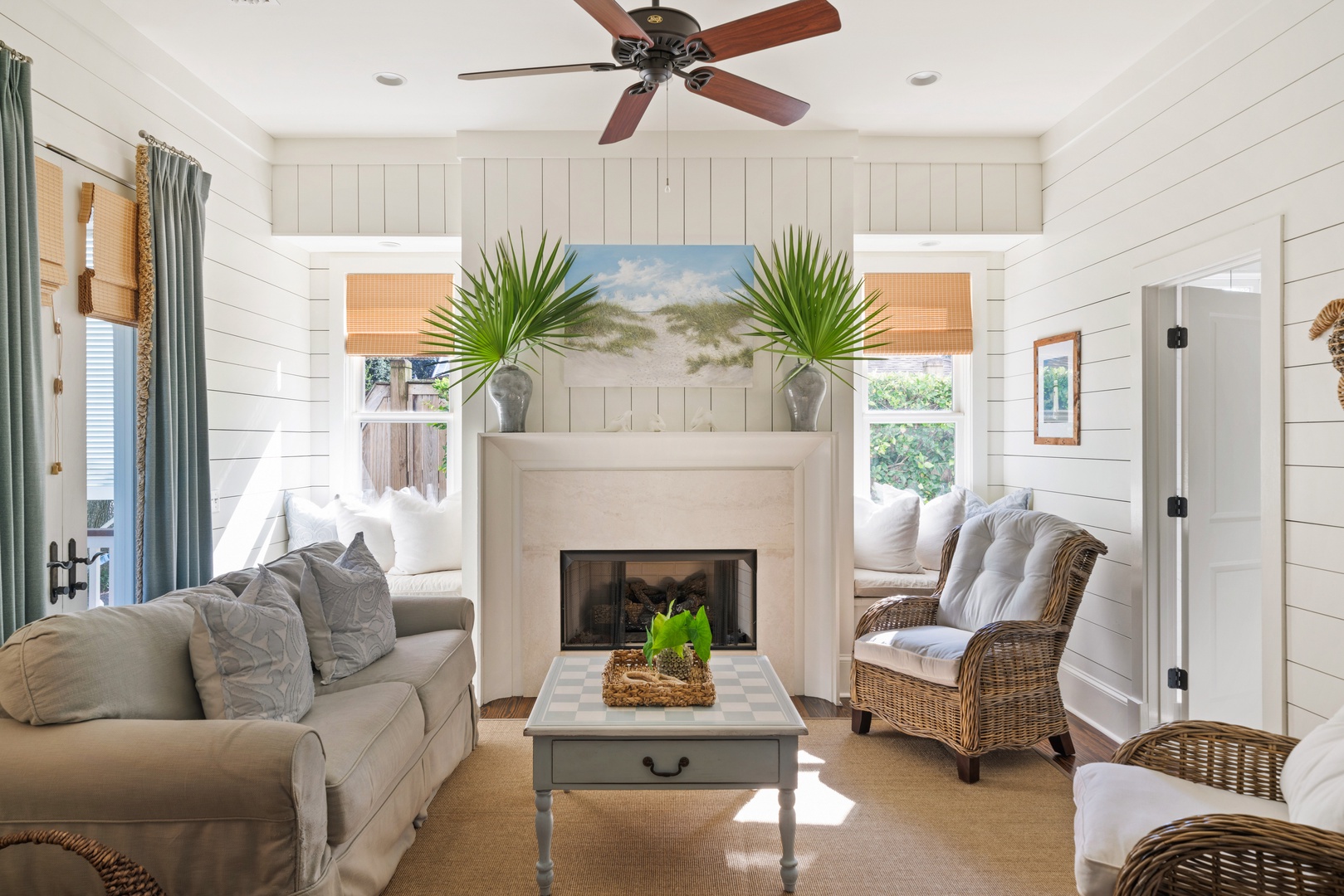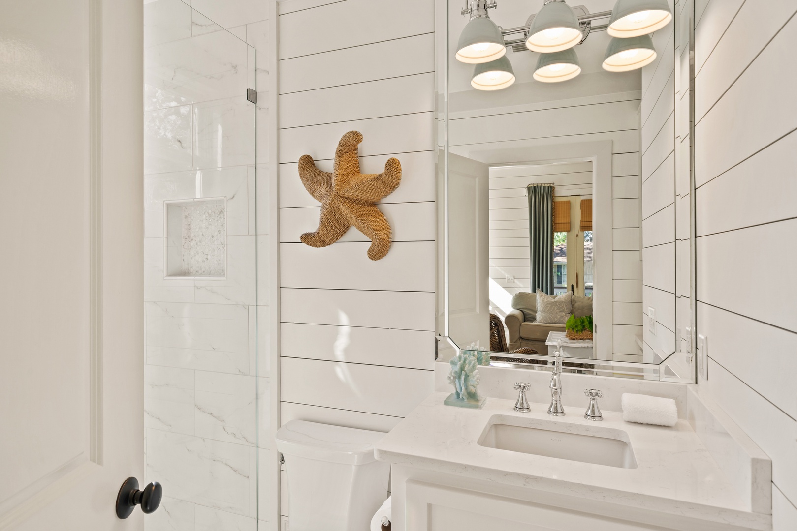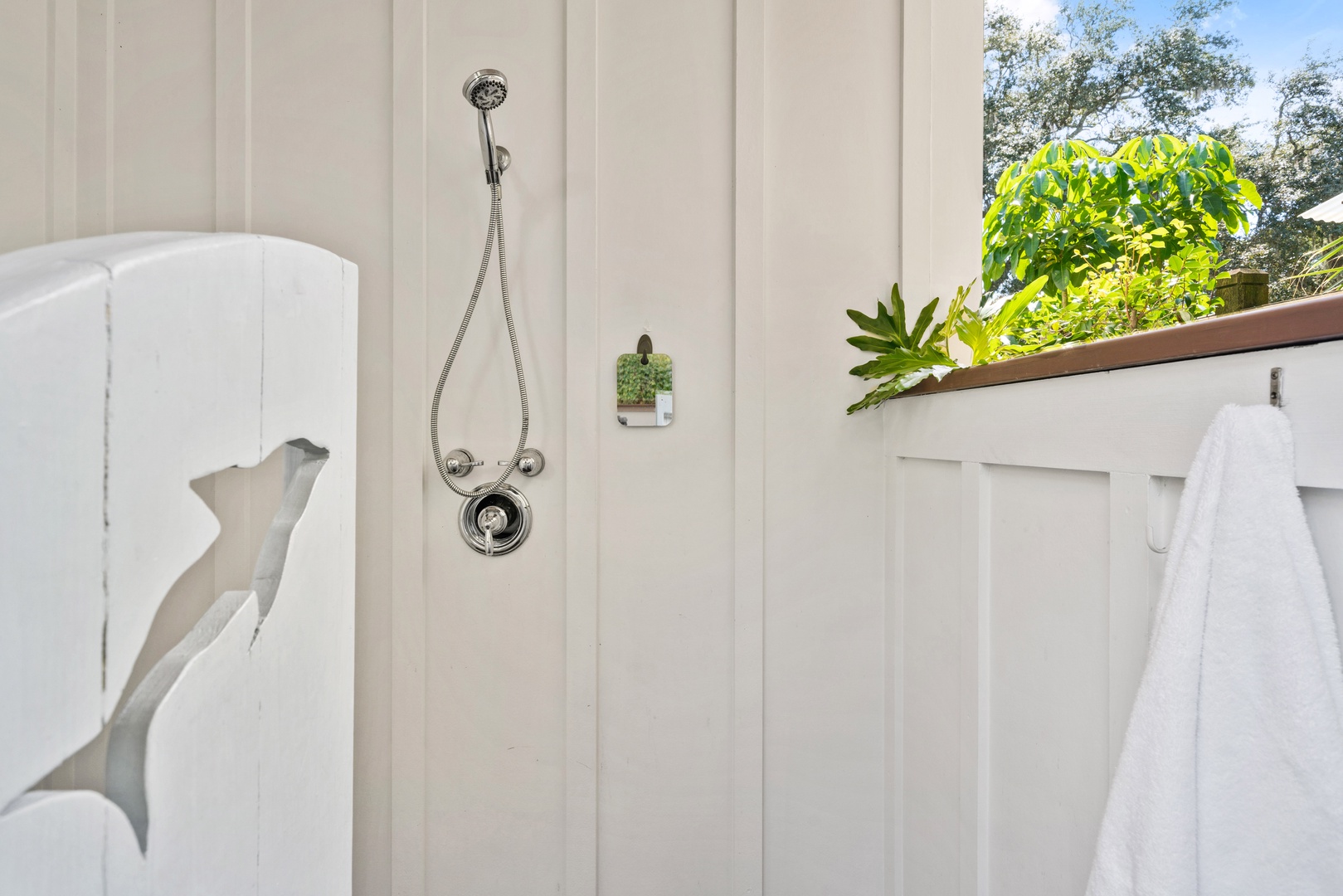 Connected to the kitchen through the back door is a large screened porch with an extra dining table for six as well as an outdoor living space with seating around a large fireplace. Want to rinse off after a day at the beach? The private outdoor shower is the perfect place to clean up before heading inside. The back outdoor courtyard is the perfect private escape for guest to enjoy their morning coffee or evening cocktails while grilling the fresh catch of the day on the custom built-in grill.