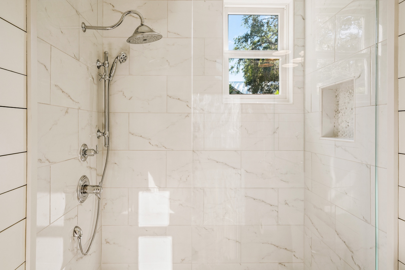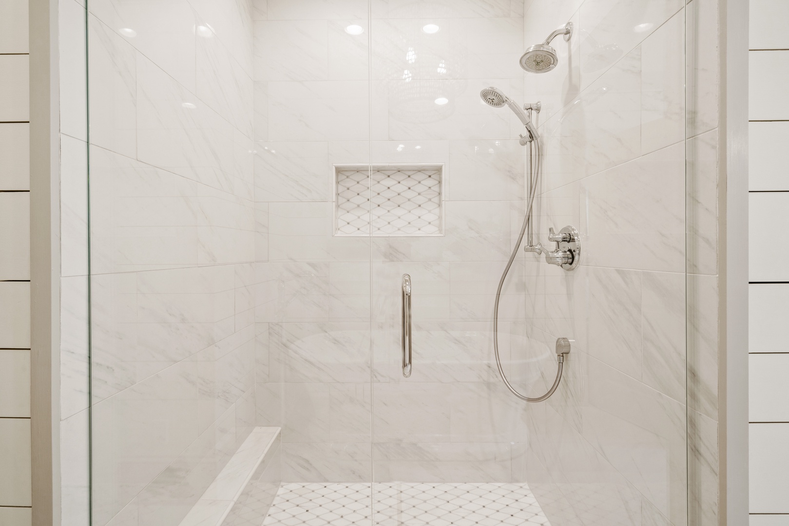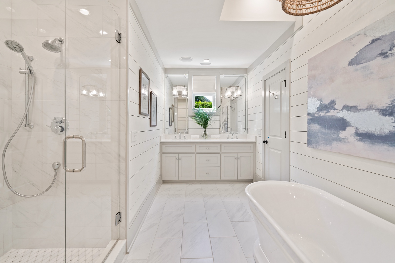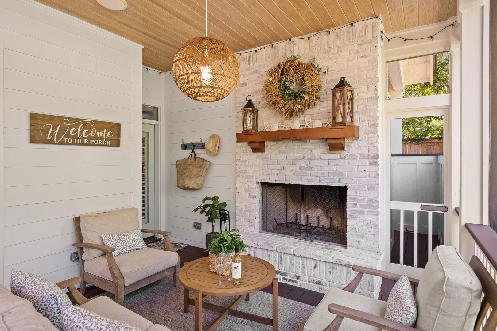 Connected to the kitchen through the back door is a large screened porch with an extra dining table for six as well as an outdoor living space with seating around a large fireplace. Want to rinse off after a day at the beach? The private outdoor shower is the perfect place to clean up before heading inside. The back outdoor courtyard is the perfect private escape for guest to enjoy their morning coffee or evening cocktails while grilling the fresh catch of the day on the custom built-in grill.
