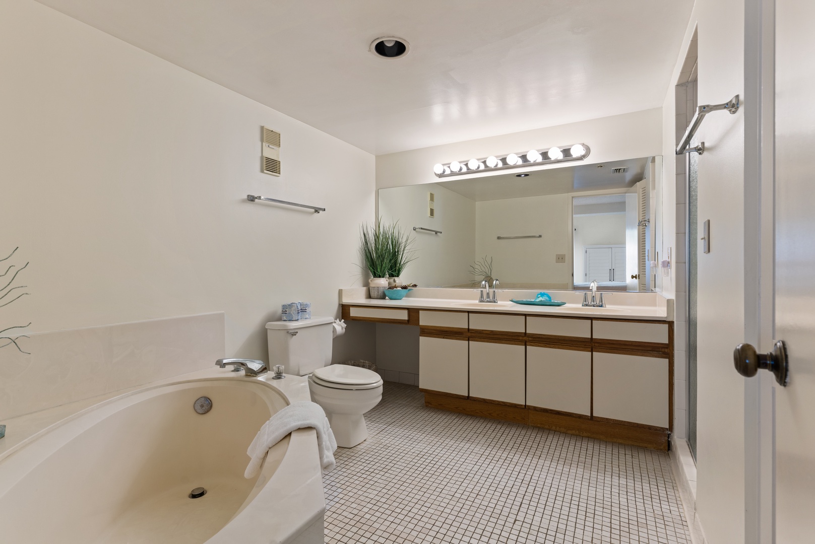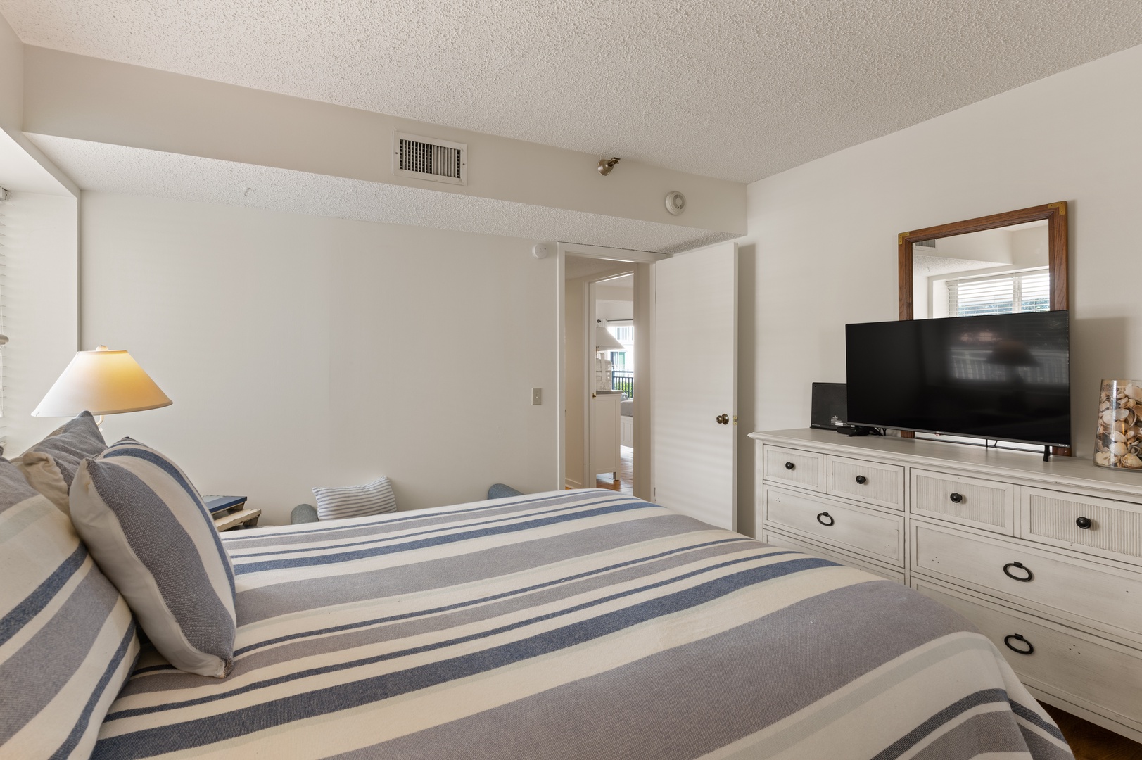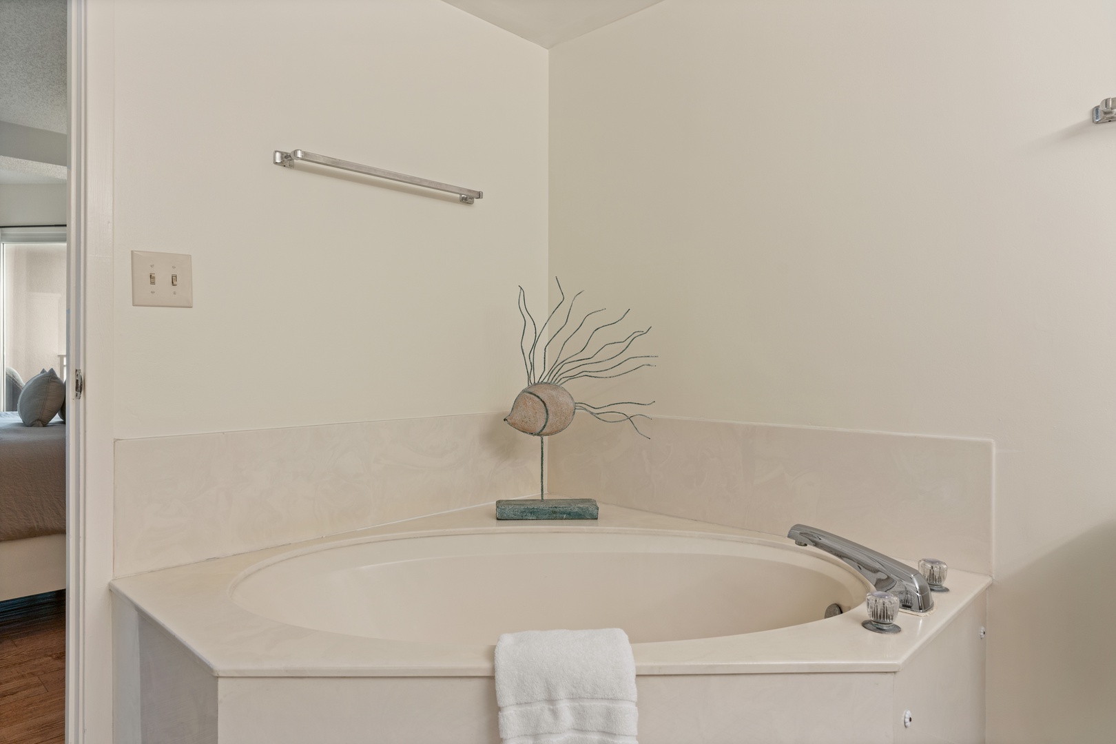 The master suite has a king bed, access to the balcony, TV, and a master bath with dual vanities and separate shower and garden tub.