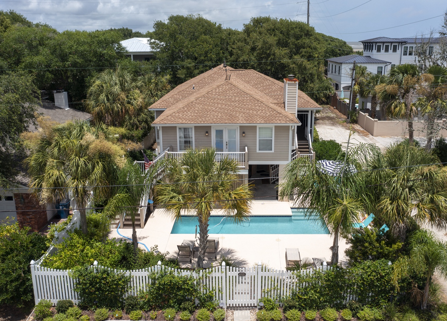 We are excited to offer Blue Star Bungalow for your next St. Simons Island vacation. This is a one level home, with the entrance upstairs through screened in front porch. As you enter the pool area, there is a covered patio area with a gas grill and outdoor bath with shower. Upstairs you enter into the well equipped kitchen and dining area. There is also a queen sleeper sofa in the family room. Master, 65" Smart TV and has a king bed with ensuite bathroom with double vanities and a shower. Guest bedroom, 24" TV and has a queen bed with walk in closet. Second Guest bedroom, 42" TV and has two single beds with a walk in closet. Guest bedrooms share a hall bathroom with combination tub/shower.