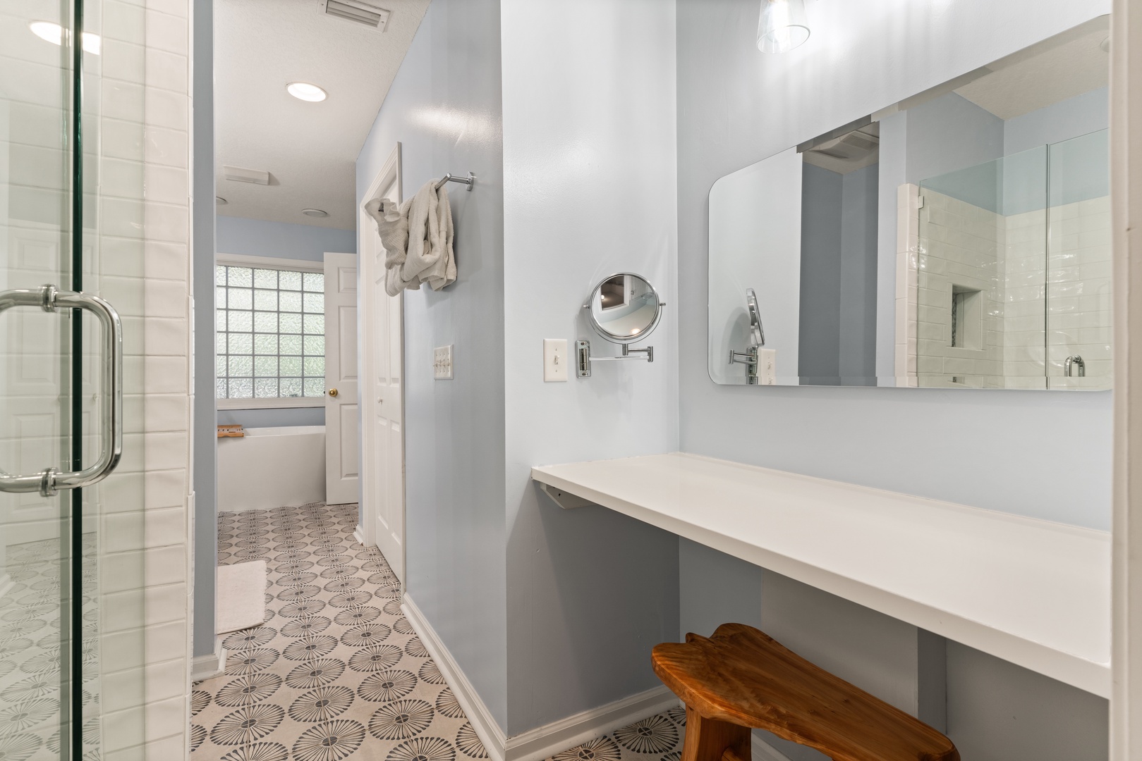 3rd level – Office/sleeper full size sleeper sofa, no TV in this room. End of hall is a bedroom with King size bed with access to a covered porch, TV and adjoining bathroom with a separate tub, shower and double sinks. Laundry Room located in the hall.