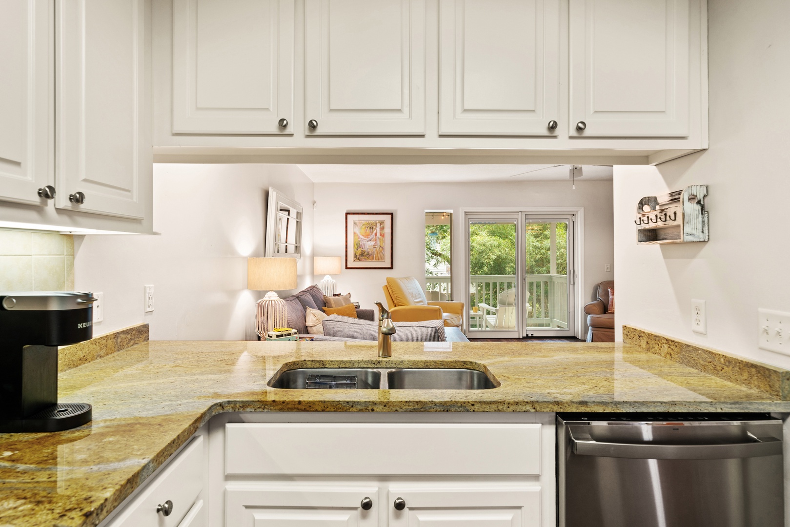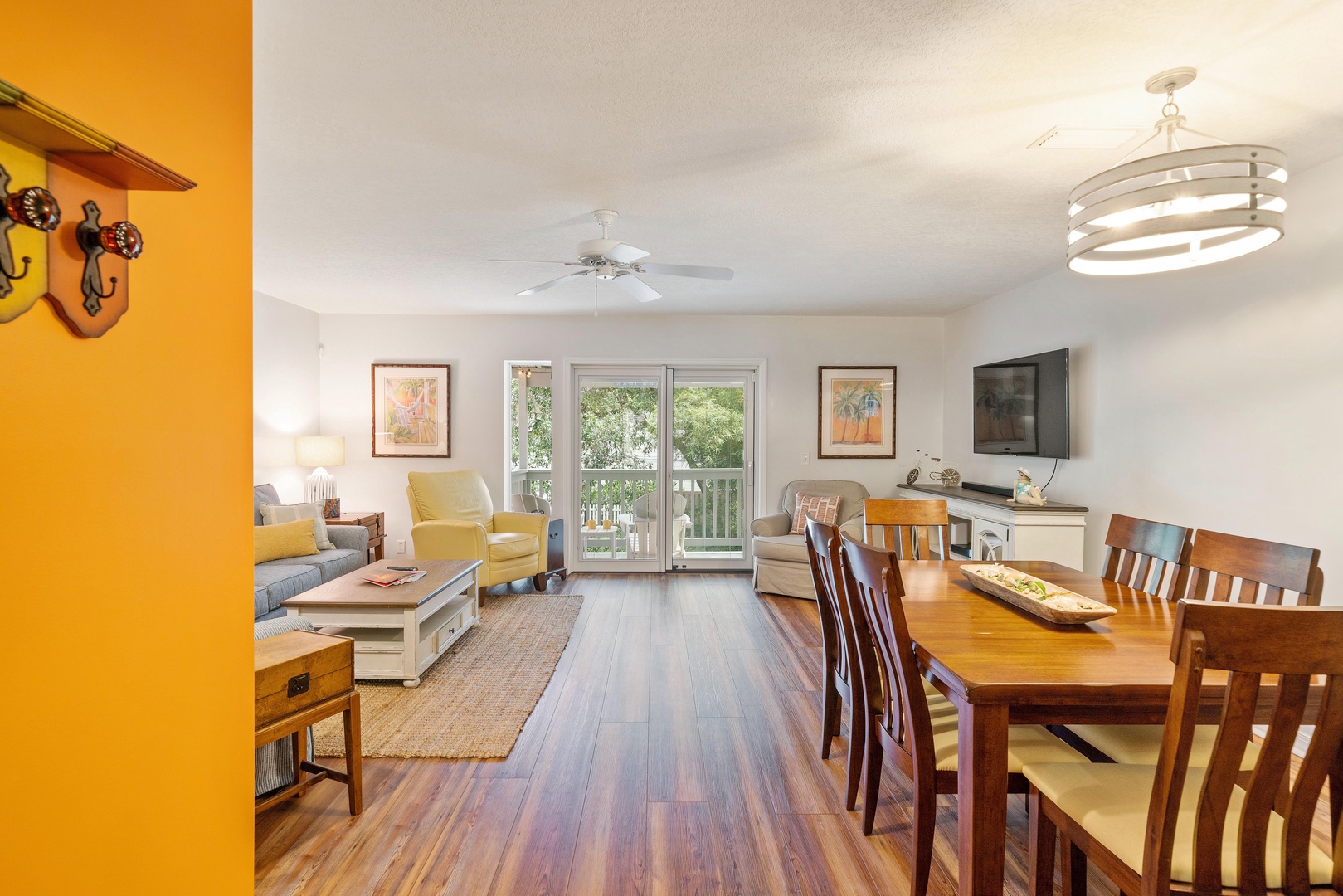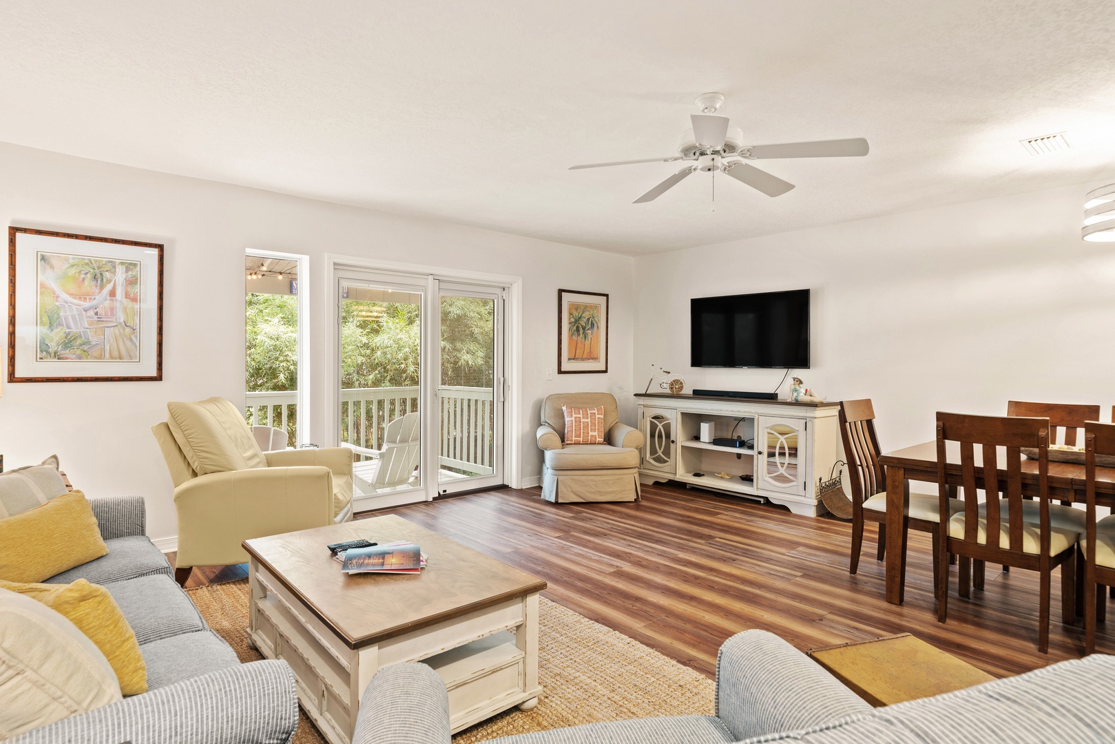 2nd level – 1/2 bath at entry, kitchen with a Keurig, open dining room with seating for 6, 2 bar stools at kitchen counter, Large TV in family room with access to covered porch. Elevator serves all floors.
