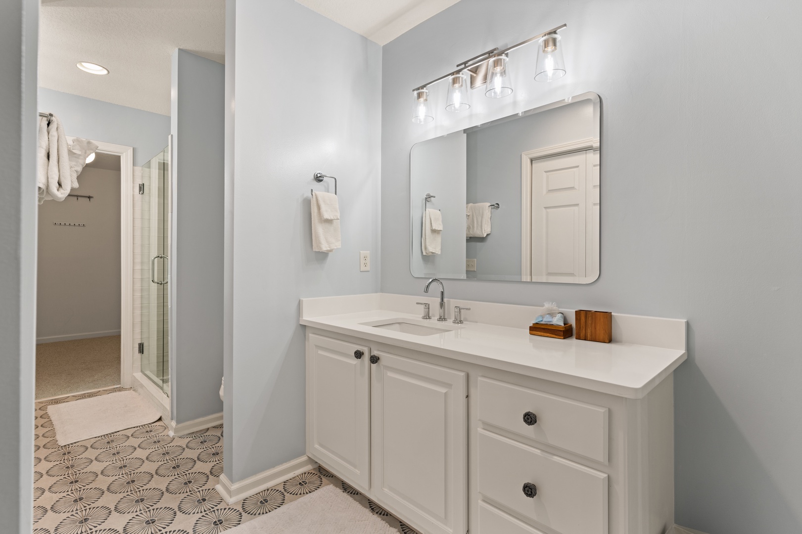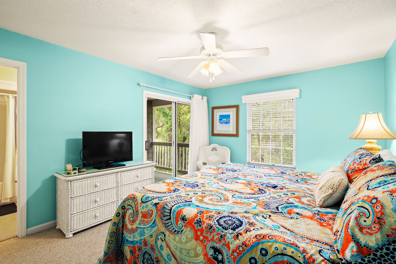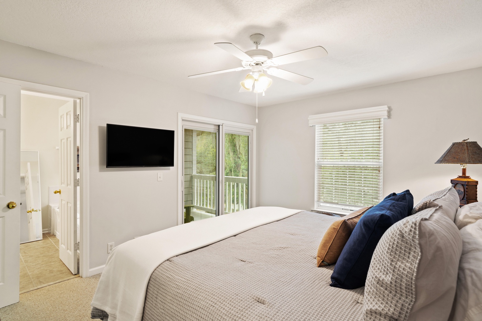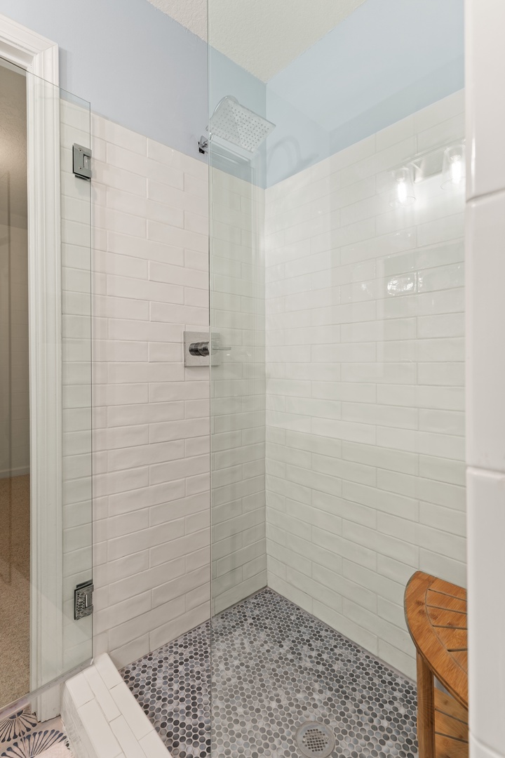 4th level – Guest bedroom has 2 single beds with access to a covered porch, small TV and adjoining bathroom with combination tub/shower. Guest bedroom at the end of the hall with a King size bed with access to a covered porch, TV and adjoining bathroom with a combo tub/shower.