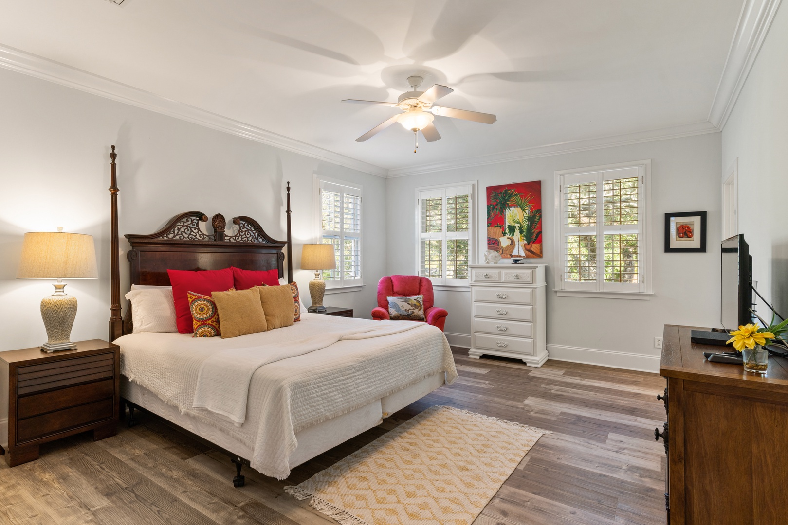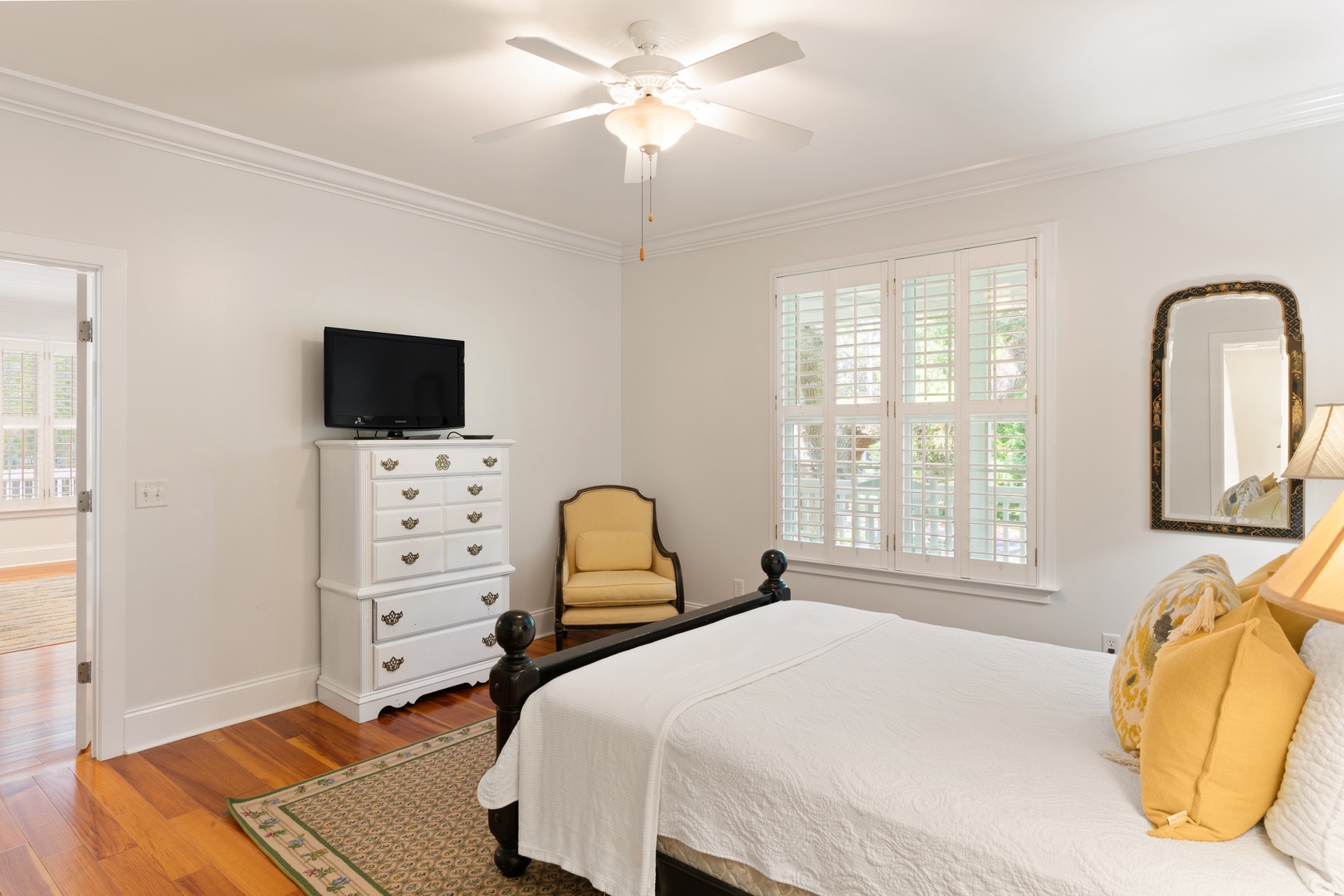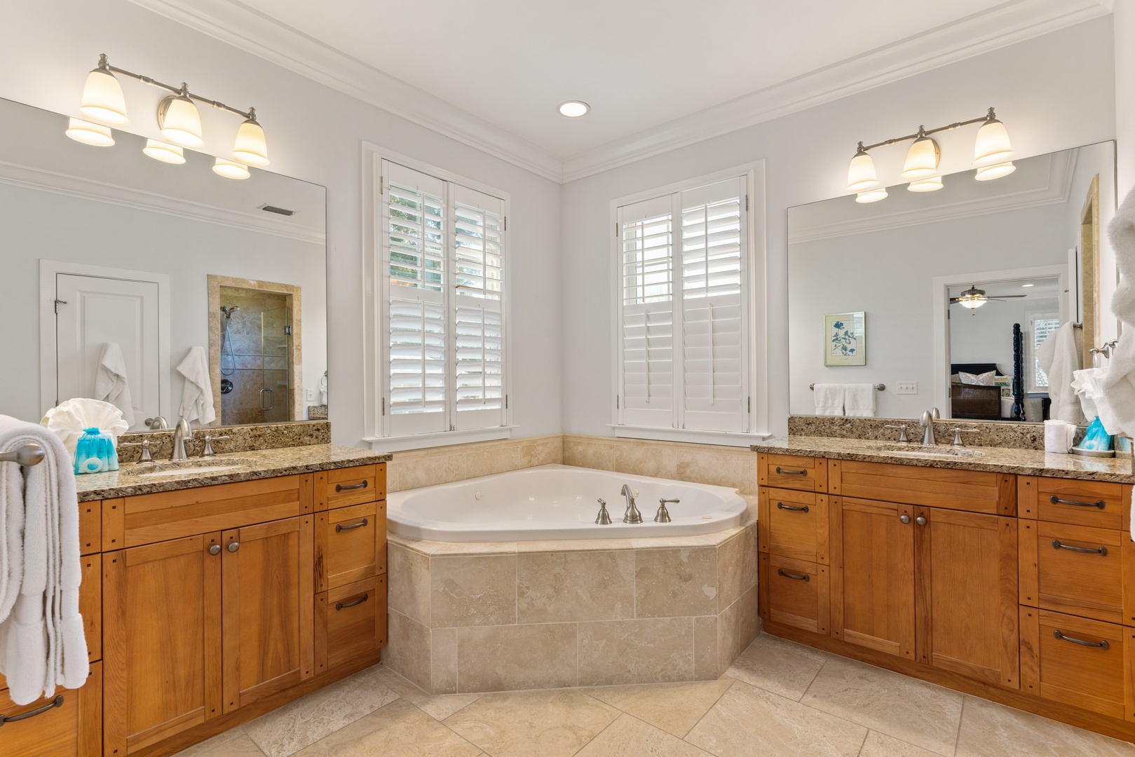 This fantastic home features 4-bedrooms in the main house, a guest suite pool side, and a queen sleeper sofa in the family room. Best of all - all the bedrooms have en-suite bathrooms. Bedroom layout is a queen on main level, master suite upstairs overlooking the pool with king, guest bedroom upstairs front left is a king, and guest bedroom upstairs front right is a queen. The guest suite above the garage is a queen bed. The kitchen is very spacious and open to the family, dining and den area for great family gatherings. TV's are in all bedrooms and family room.