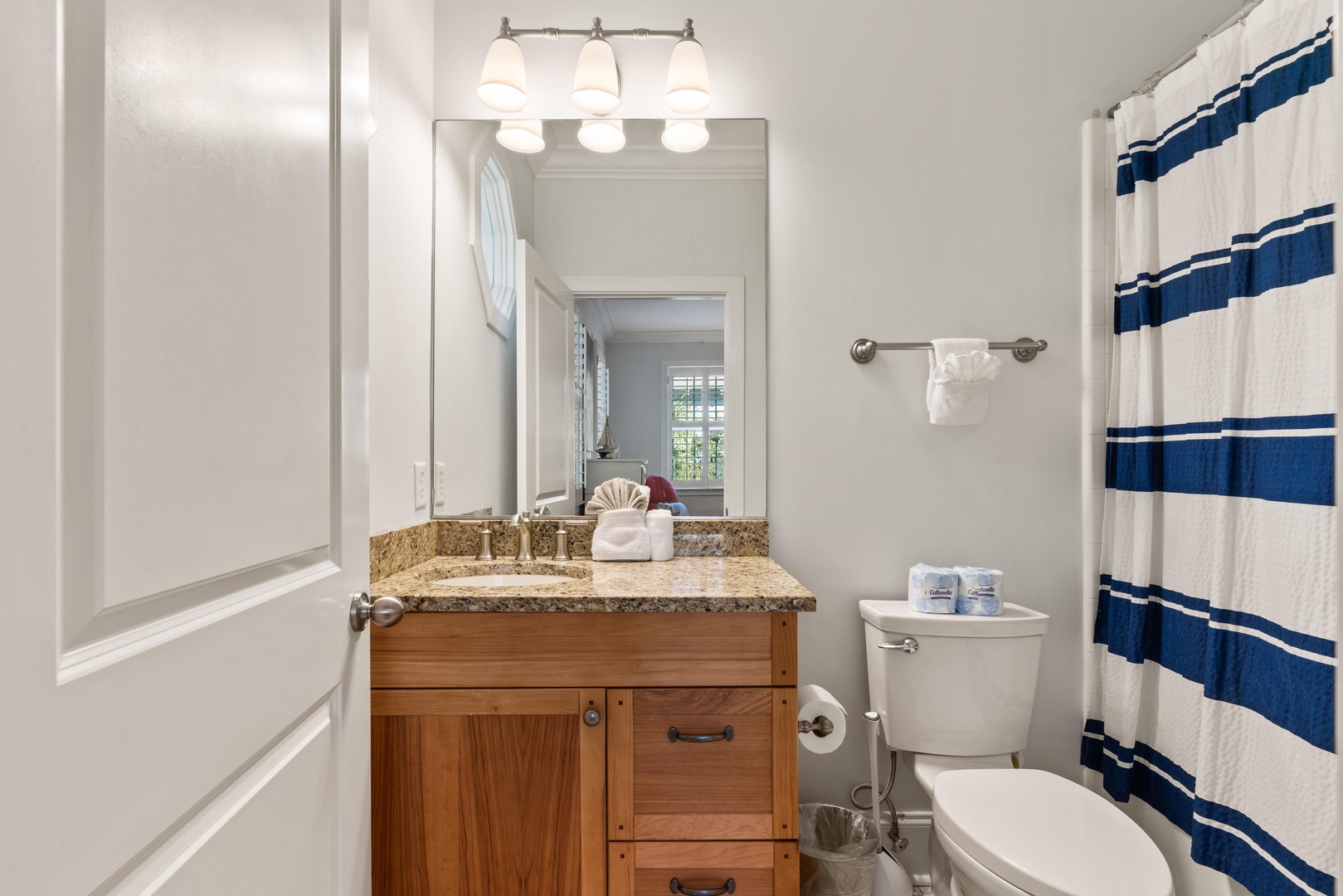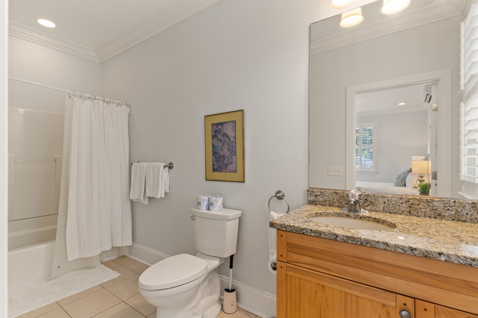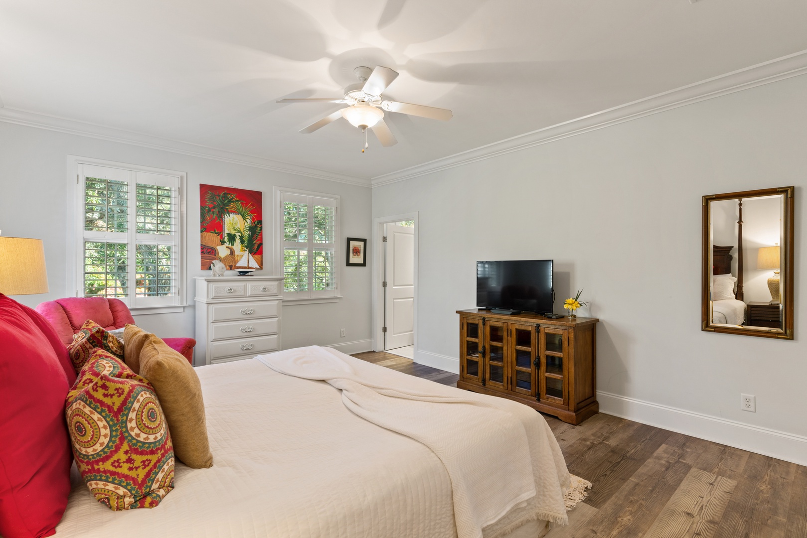 This fantastic home features 4-bedrooms in the main house, a guest suite pool side, and a queen sleeper sofa in the family room. Best of all - all the bedrooms have en-suite bathrooms. Bedroom layout is a queen on main level, master suite upstairs overlooking the pool with king, guest bedroom upstairs front left is a king, and guest bedroom upstairs front right is a queen. The guest suite above the garage is a queen bed. The kitchen is very spacious and open to the family, dining and den area for great family gatherings. TV's are in all bedrooms and family room.