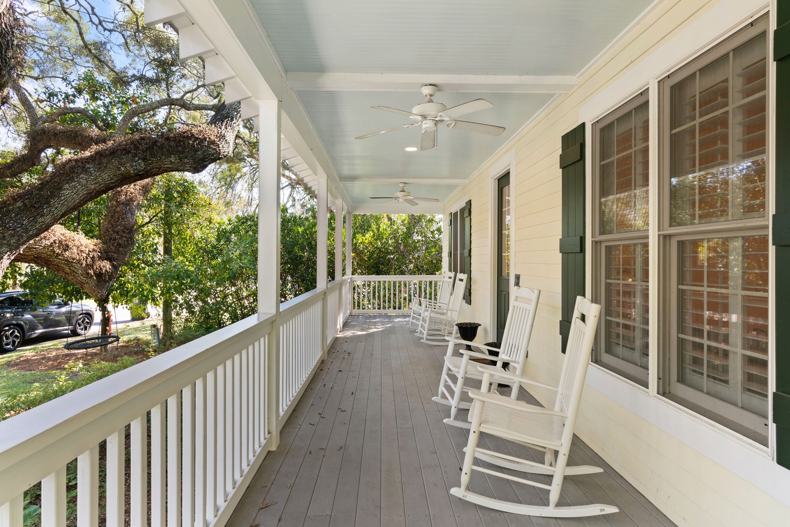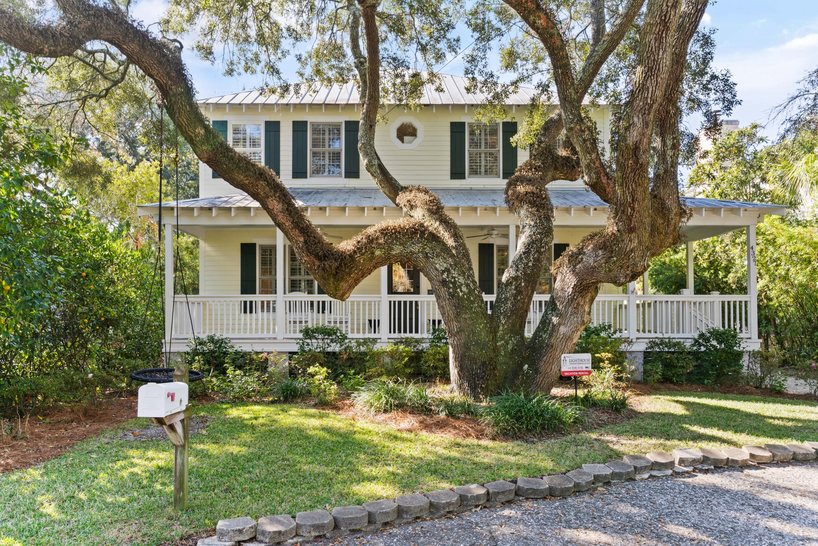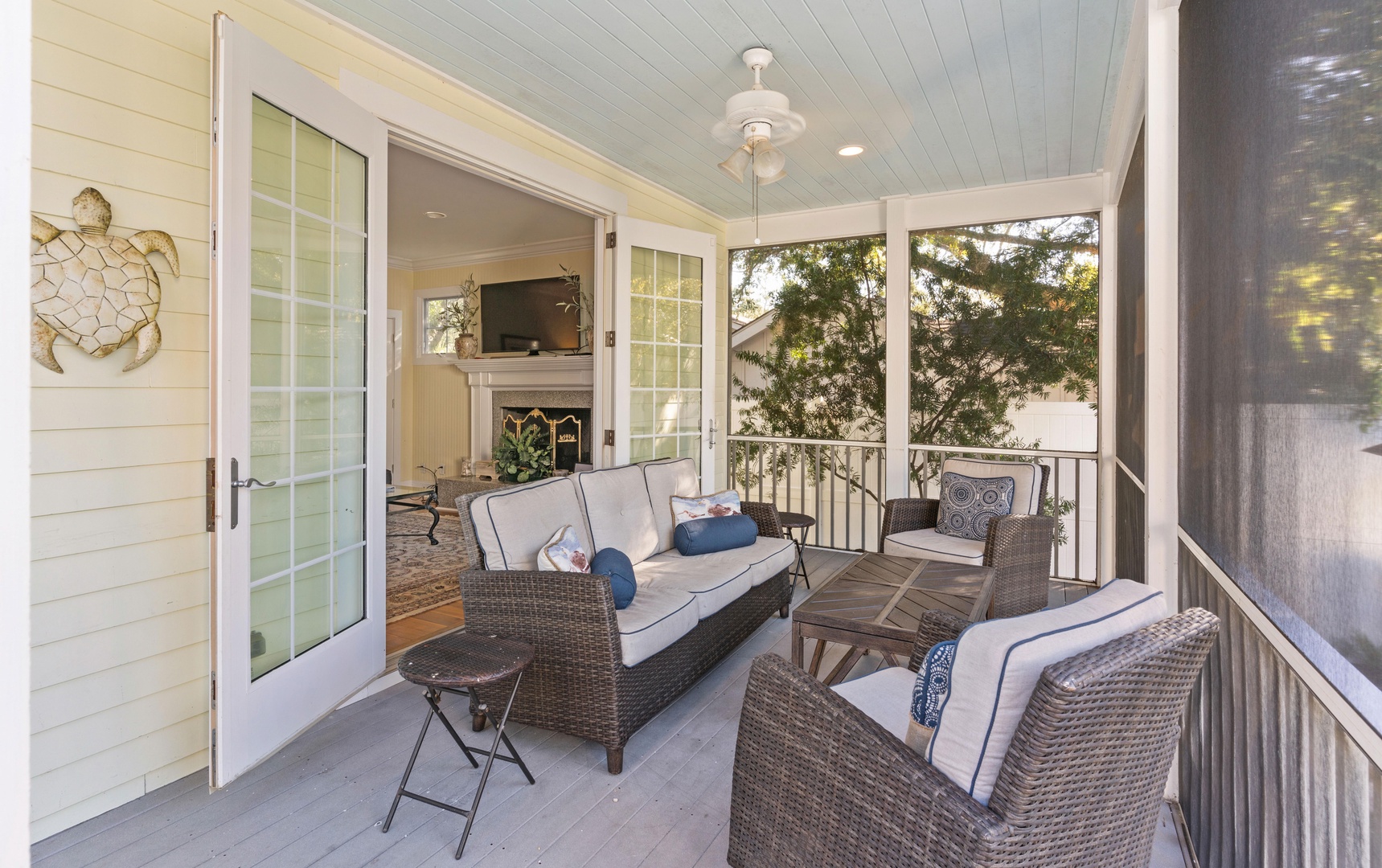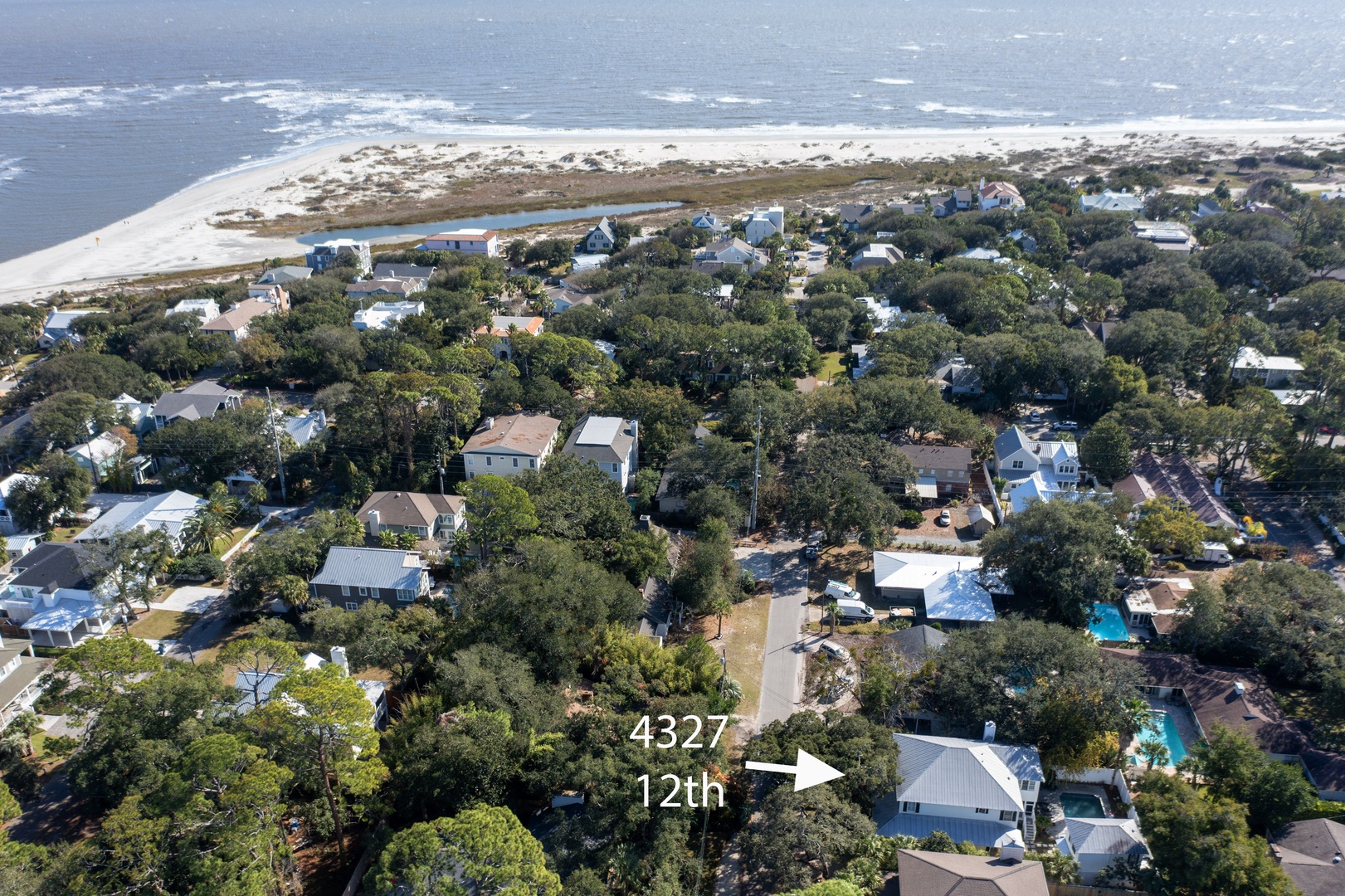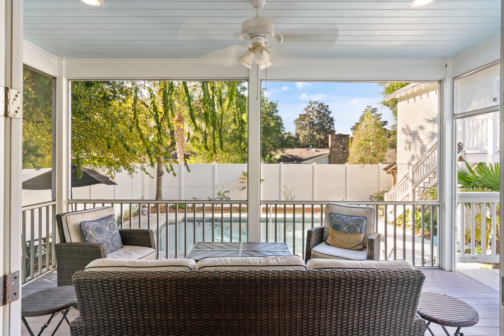 Outside, you can relax on the rocking chair front surrounded by the beauty of live oaks. If you prefer, you can chill out on the screened-in back porch overlooking the pool, or simply soak up the sun poolside. The beach entrances are within walking distance, or just a short drive to the Coast Guard Station beach entrance.
