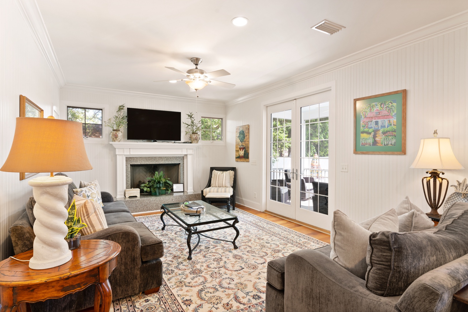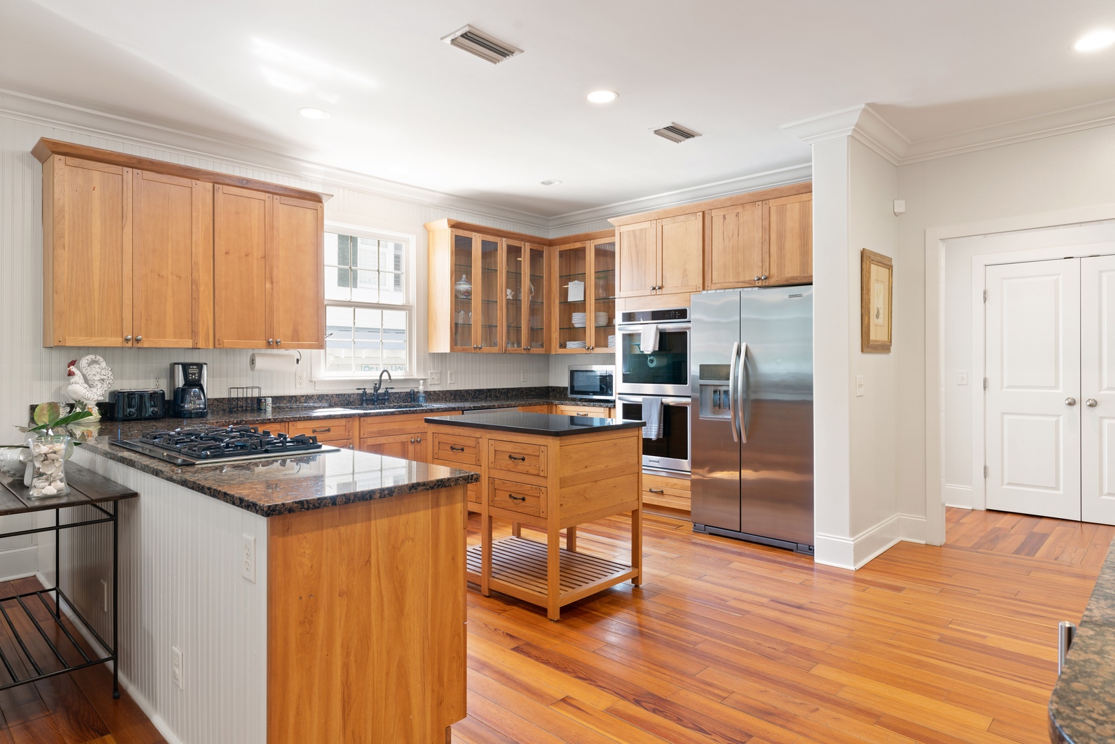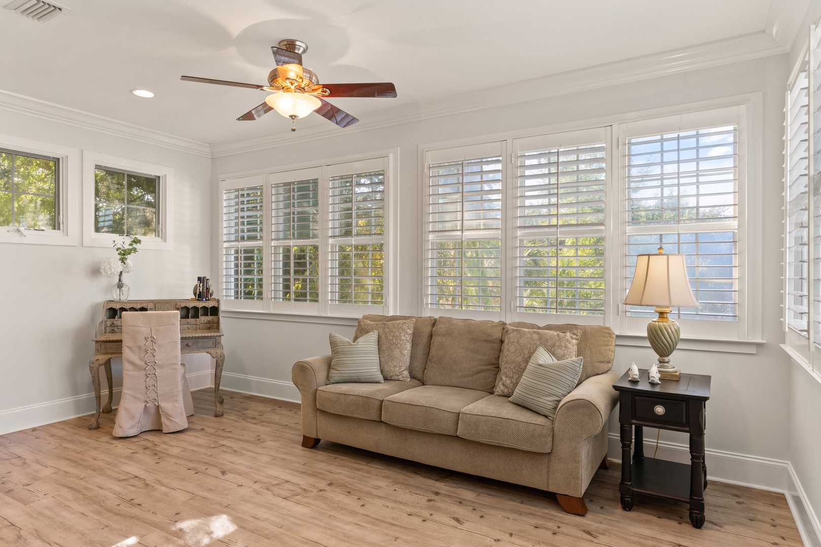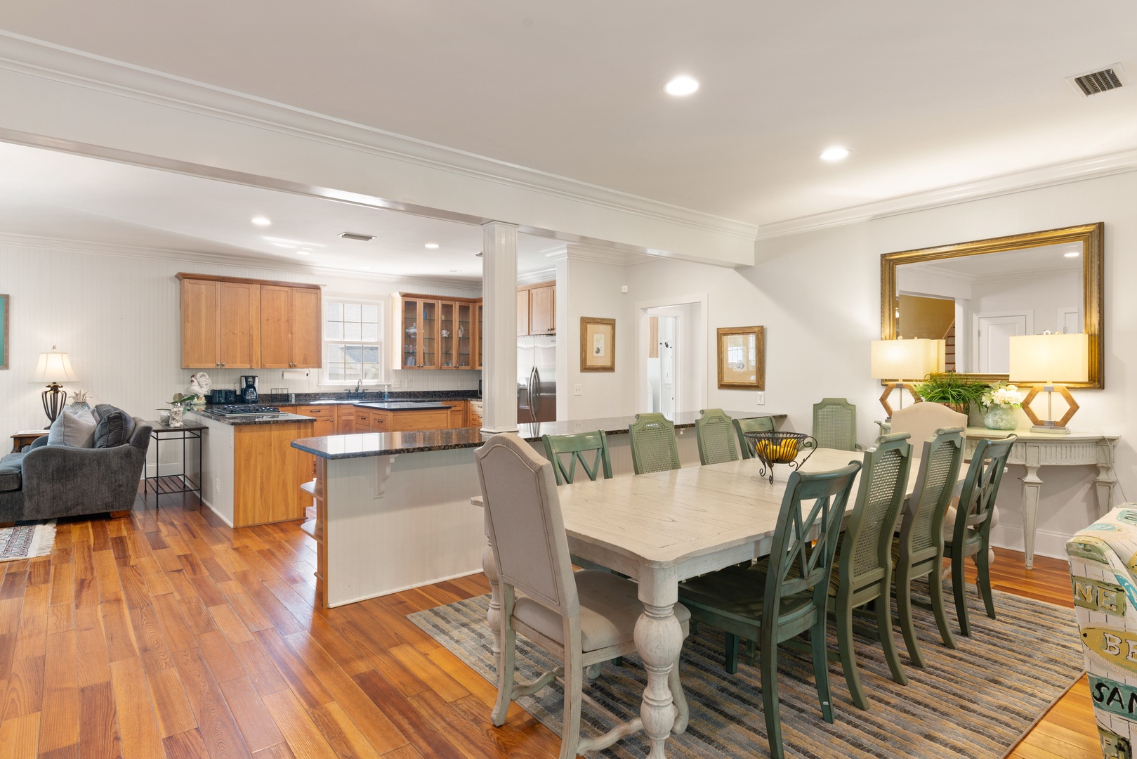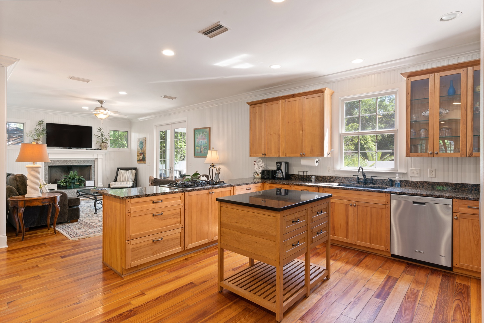 Outside, you can relax on the rocking chair front surrounded by the beauty of live oaks. If you prefer, you can chill out on the screened-in back porch overlooking the pool, or simply soak up the sun poolside. The beach entrances are within walking distance, or just a short drive to the Coast Guard Station beach entrance.