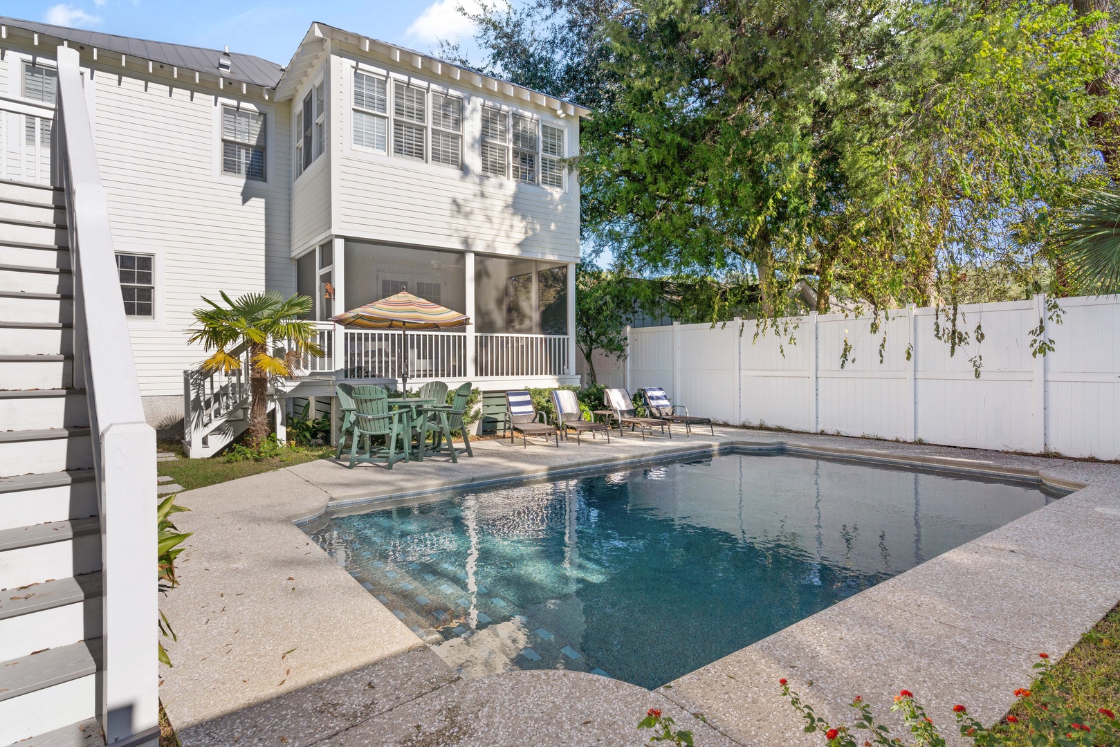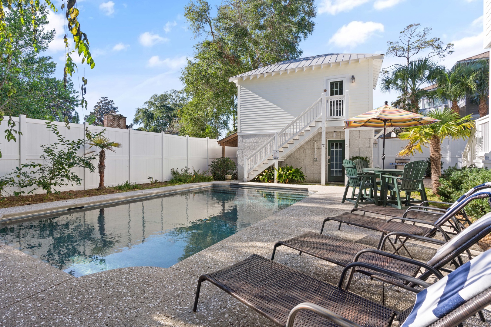"Don't Worry Beach Happy" is a private Southern Oasis located in St. Simons Island's charming East Beach Neighborhood. This stunning home combines classic southern charm with luxurious amenities to create the ultimate beach vacation experience. With the main house and guest house, it can comfortably accommodate up to 12 guests with a large 14’X 36’ pool.