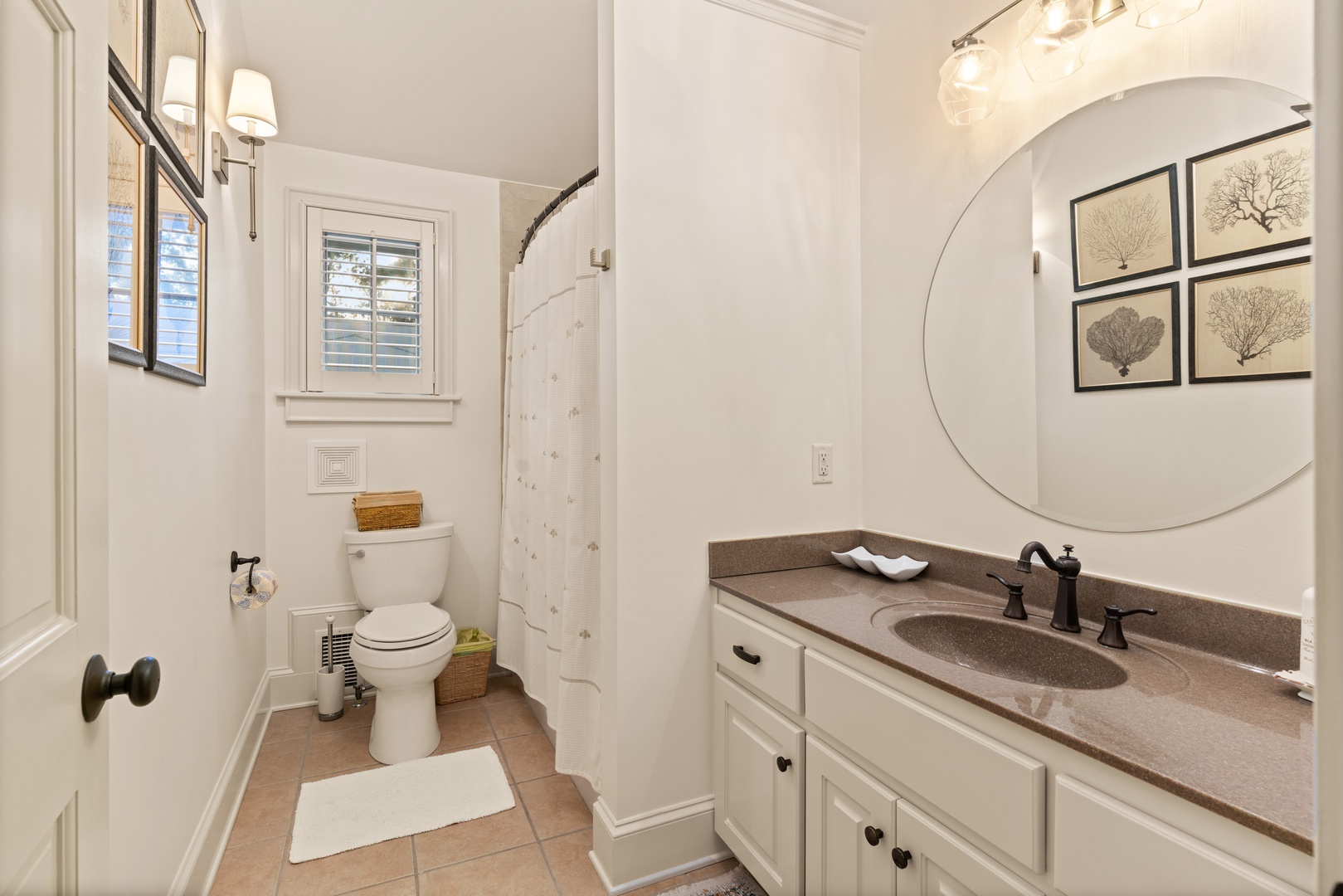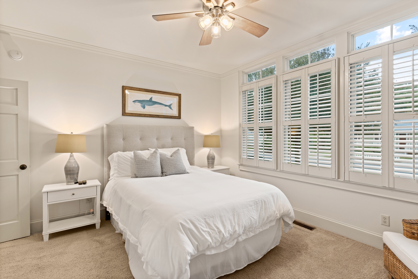 - Queen Suite: Main level, Queen bed, full bath across the hall with shower/tub combo