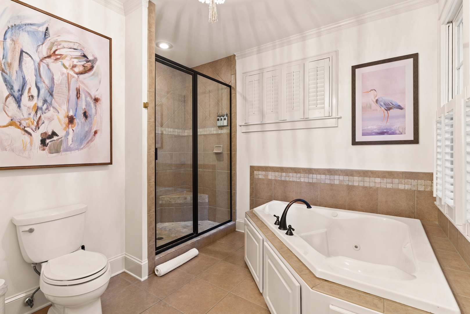 - Primary Suite: King bed on the 1st floor, en-suite bath with shower and jetted soaking tub