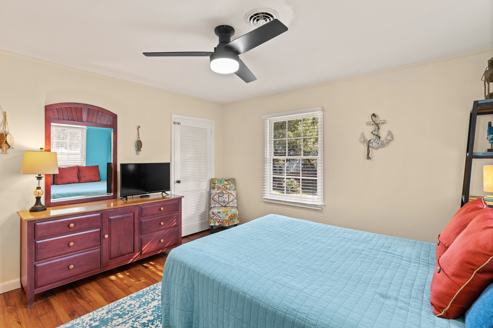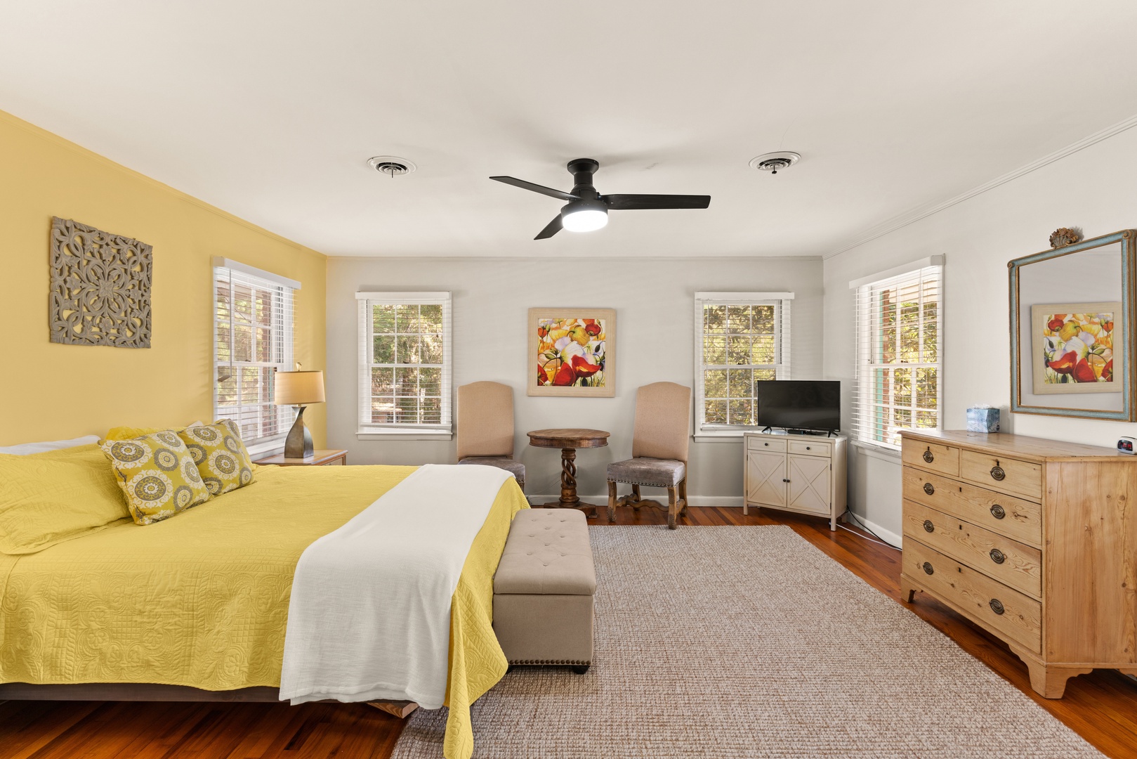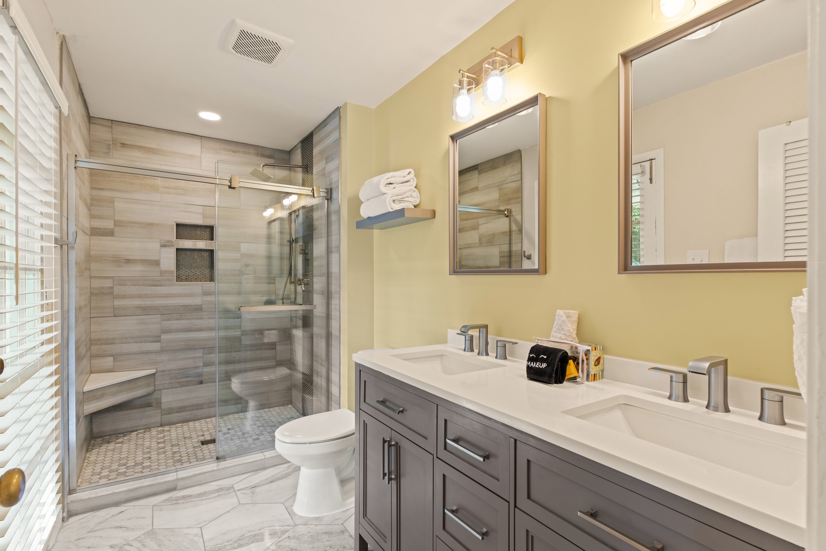 The master suite features a king bed, flat screen TV with premium cable, and renovated master bath with dual vanities and beautiful new marble shower.