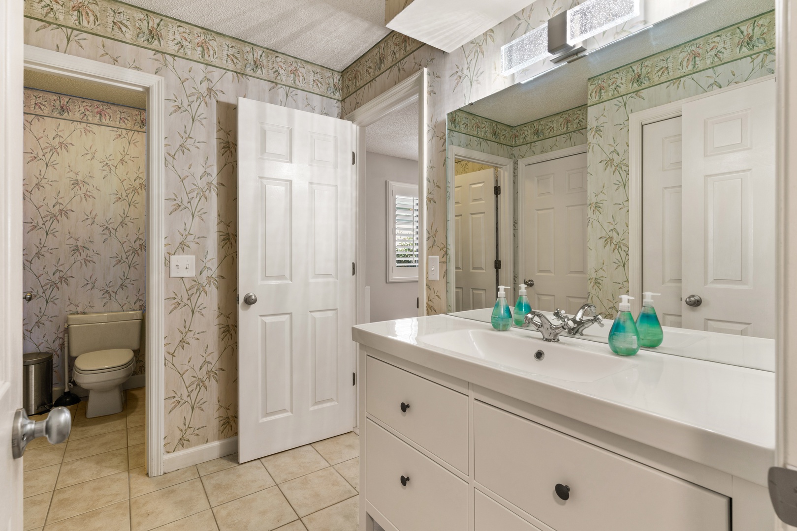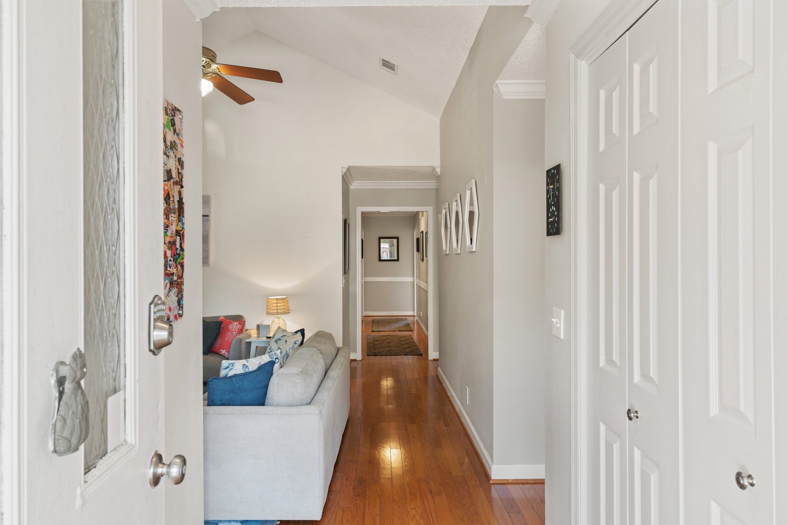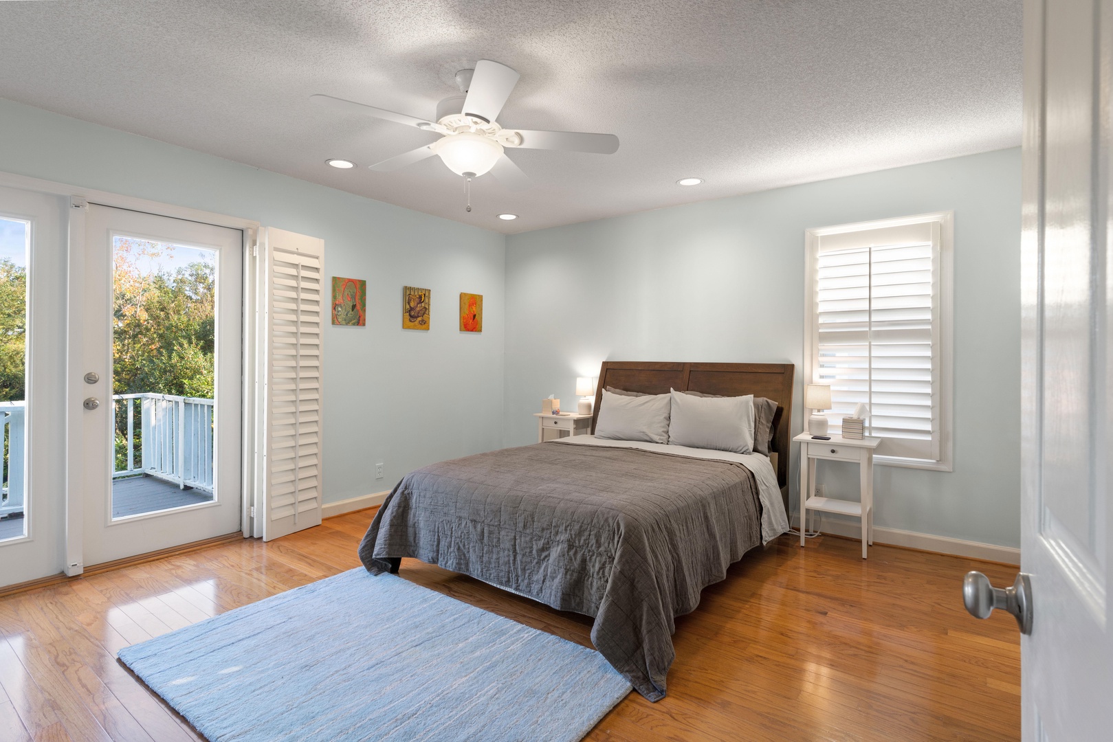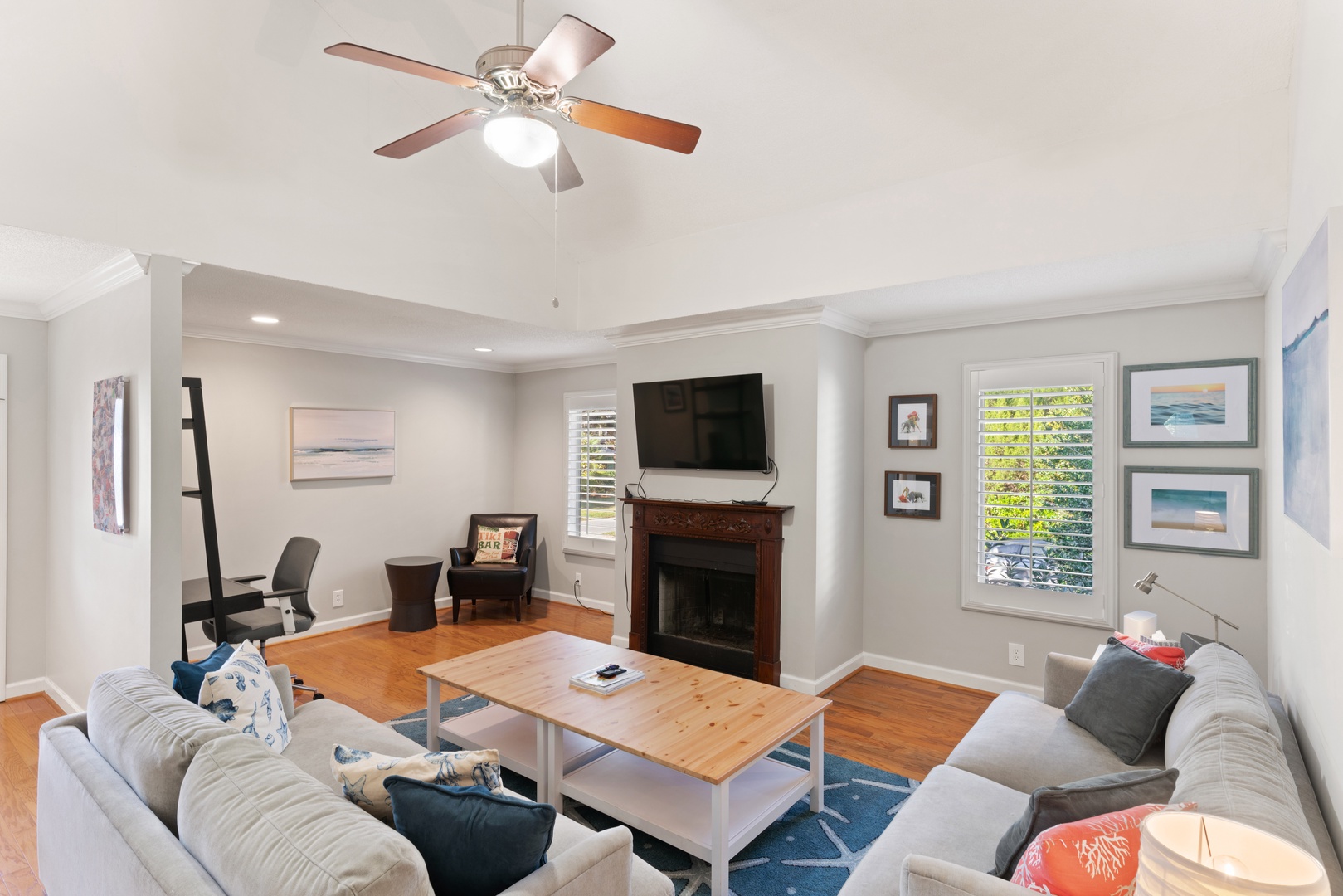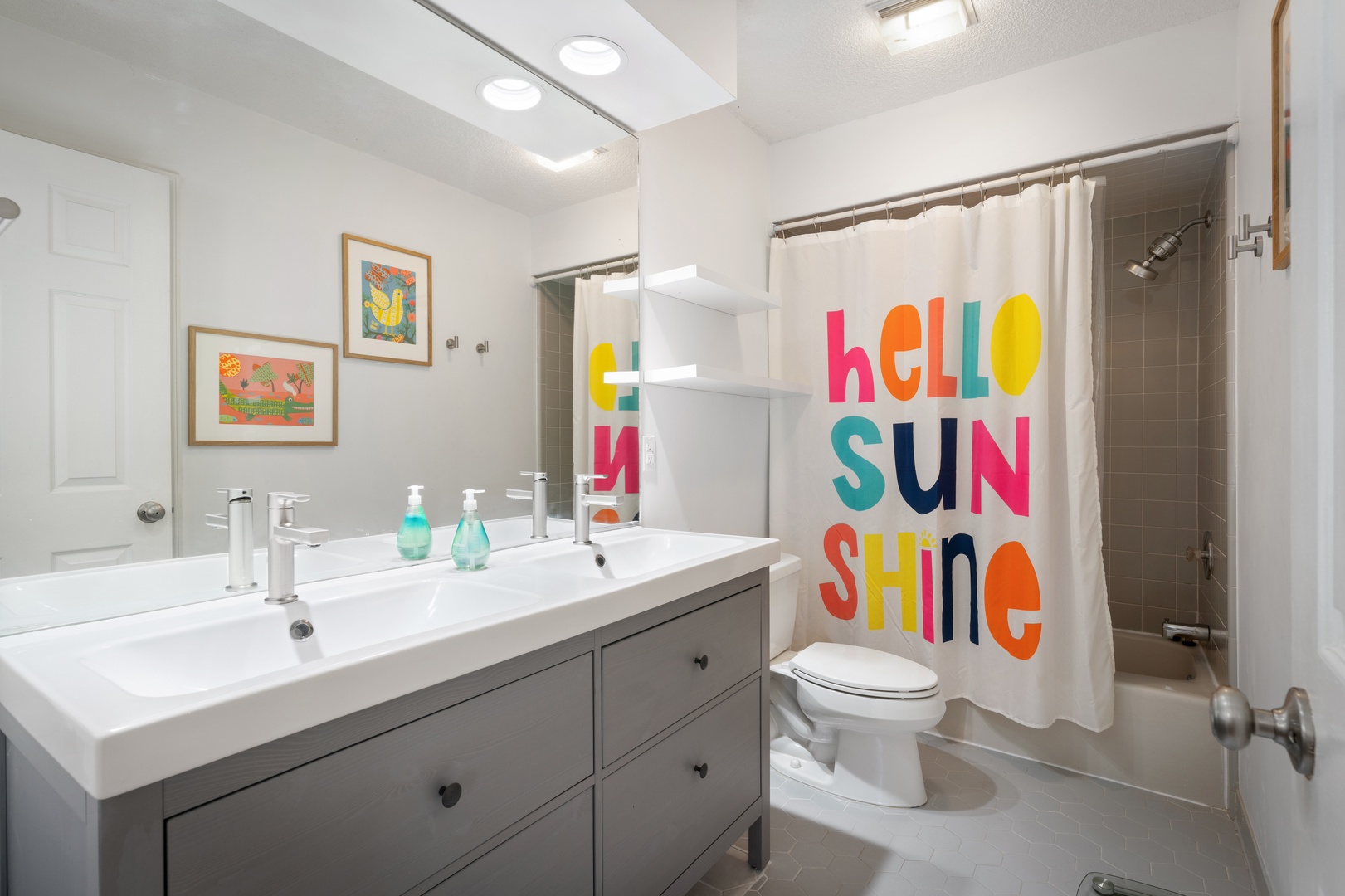 Down the hall are two guest bedrooms with queen beds, smart TVs and a shared hall bathroom with a shower/tub combo.