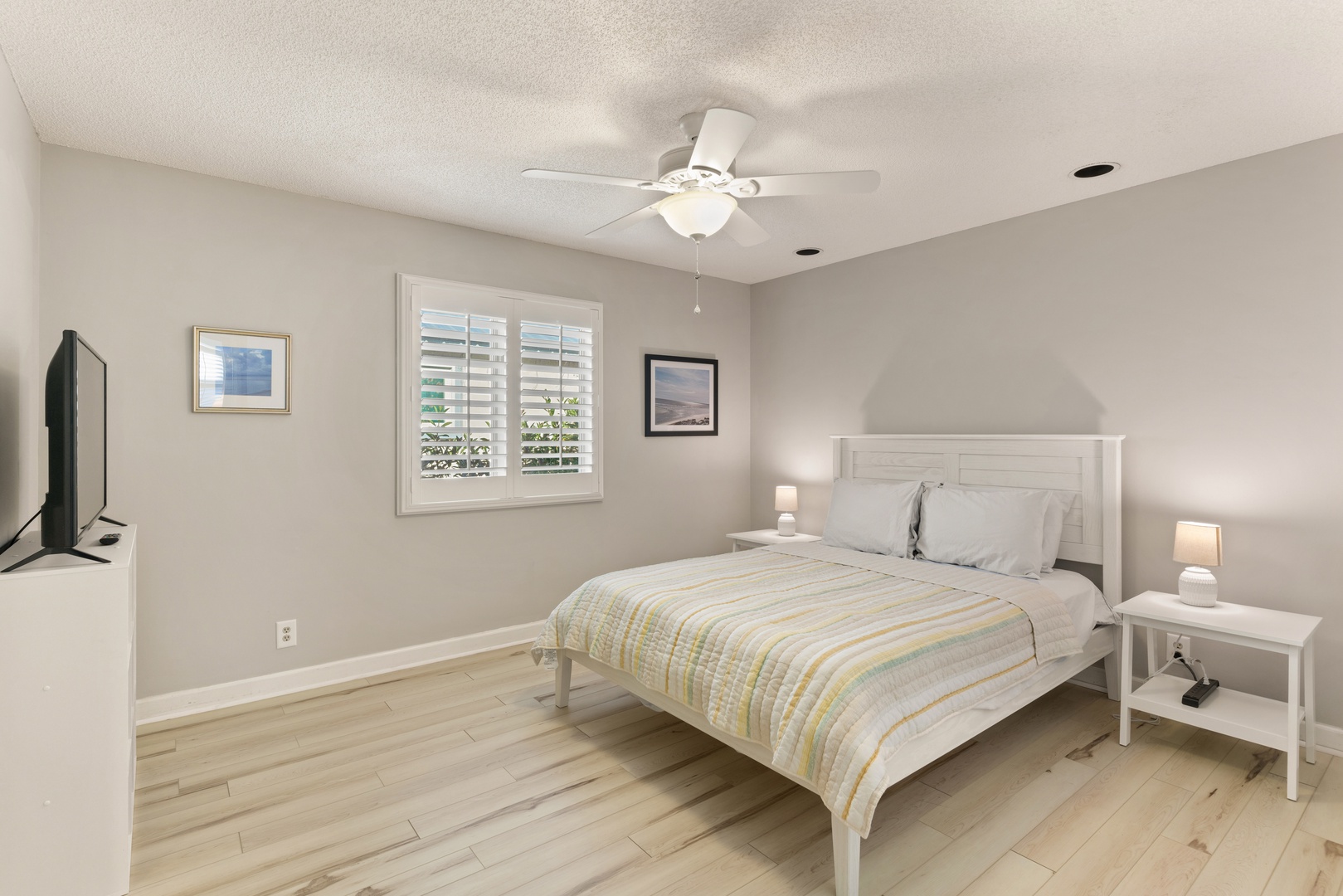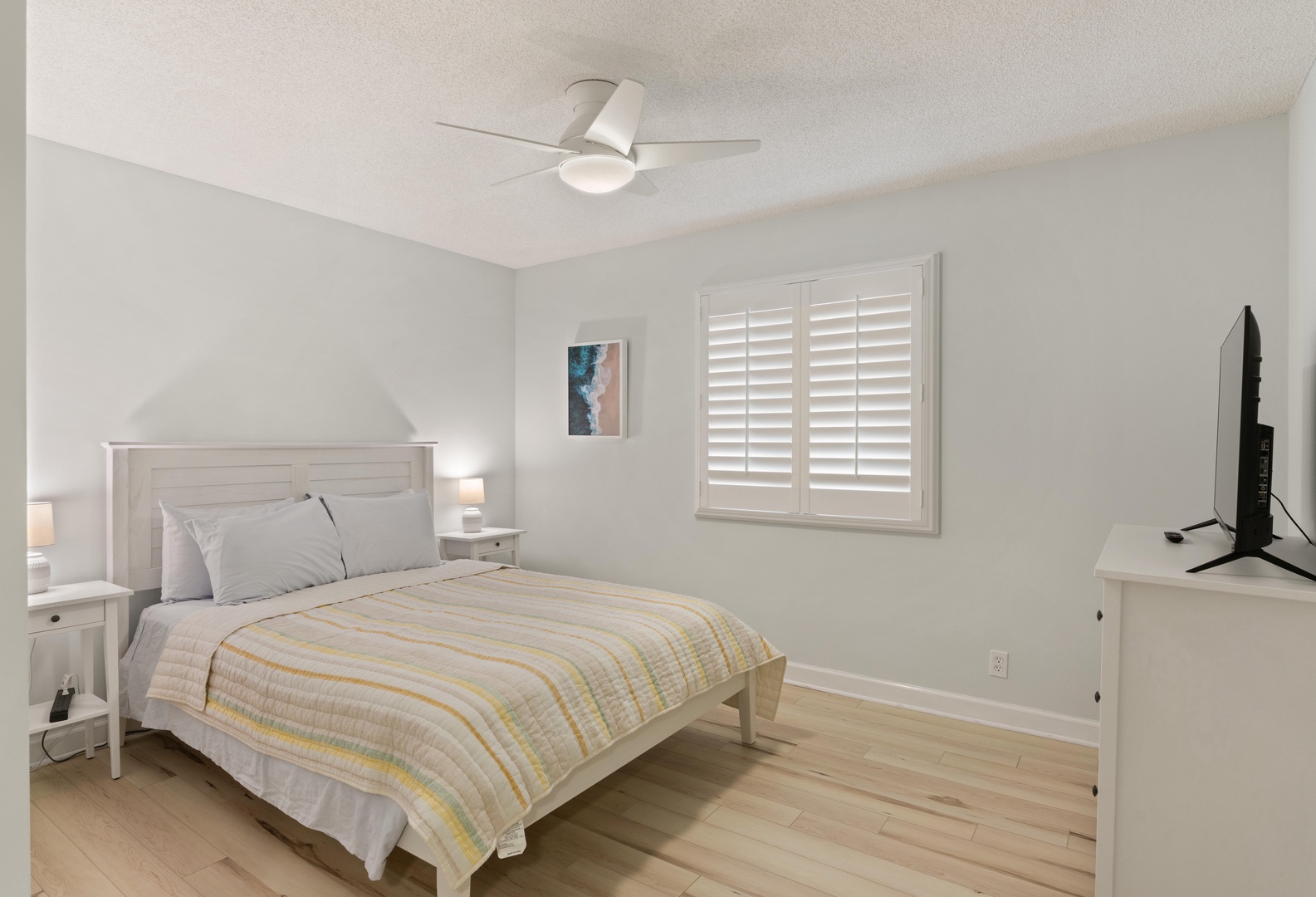 Primary bedroom has a queen bed with smart TV, adjoining bathroom with shower/tub combo.