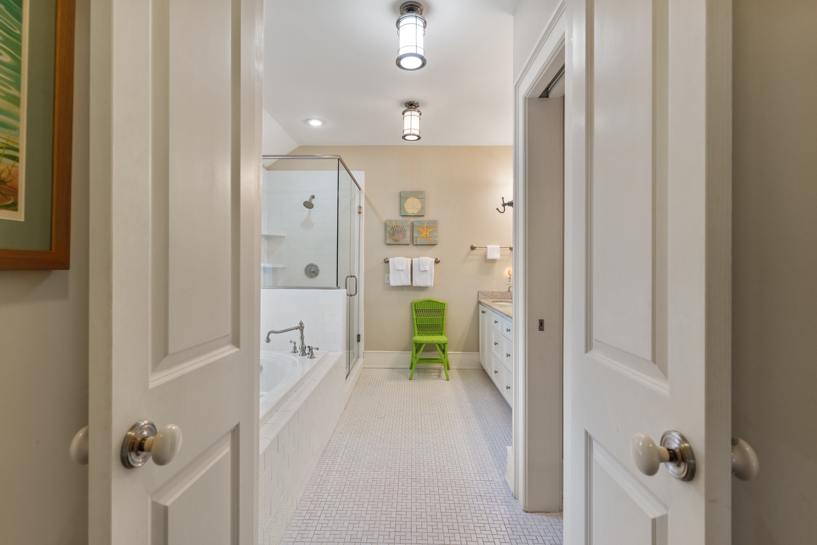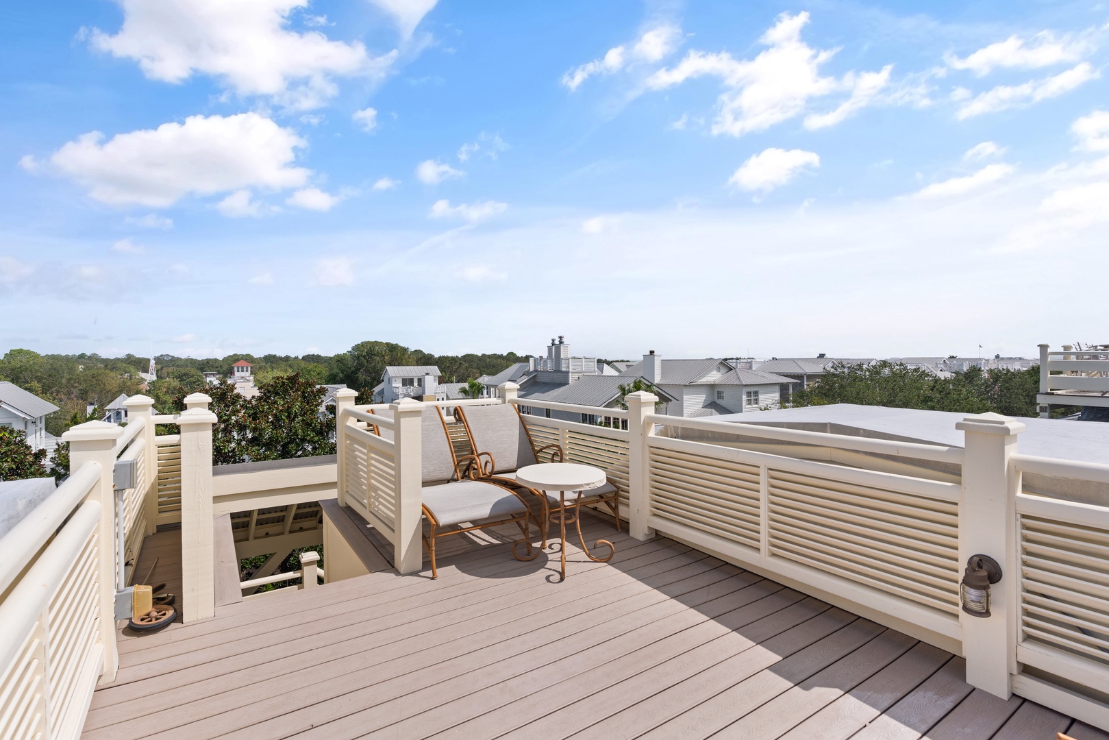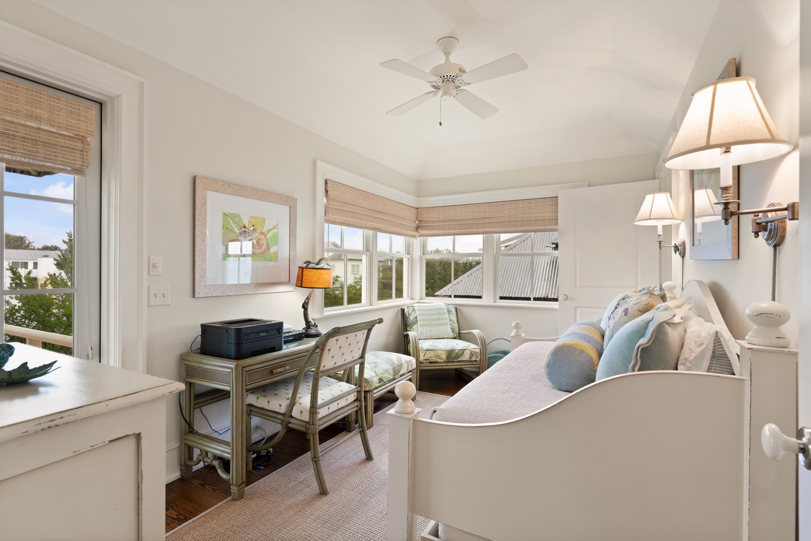 4th level – King Suite (sleeps 2), adjoining bathroom with separate water closet, shower, double vanity and tub. Adjoining the king suite is a sleeping room with daybed and trundle (sleeps 2), desk space and access to covered porch and rooftop deck.
