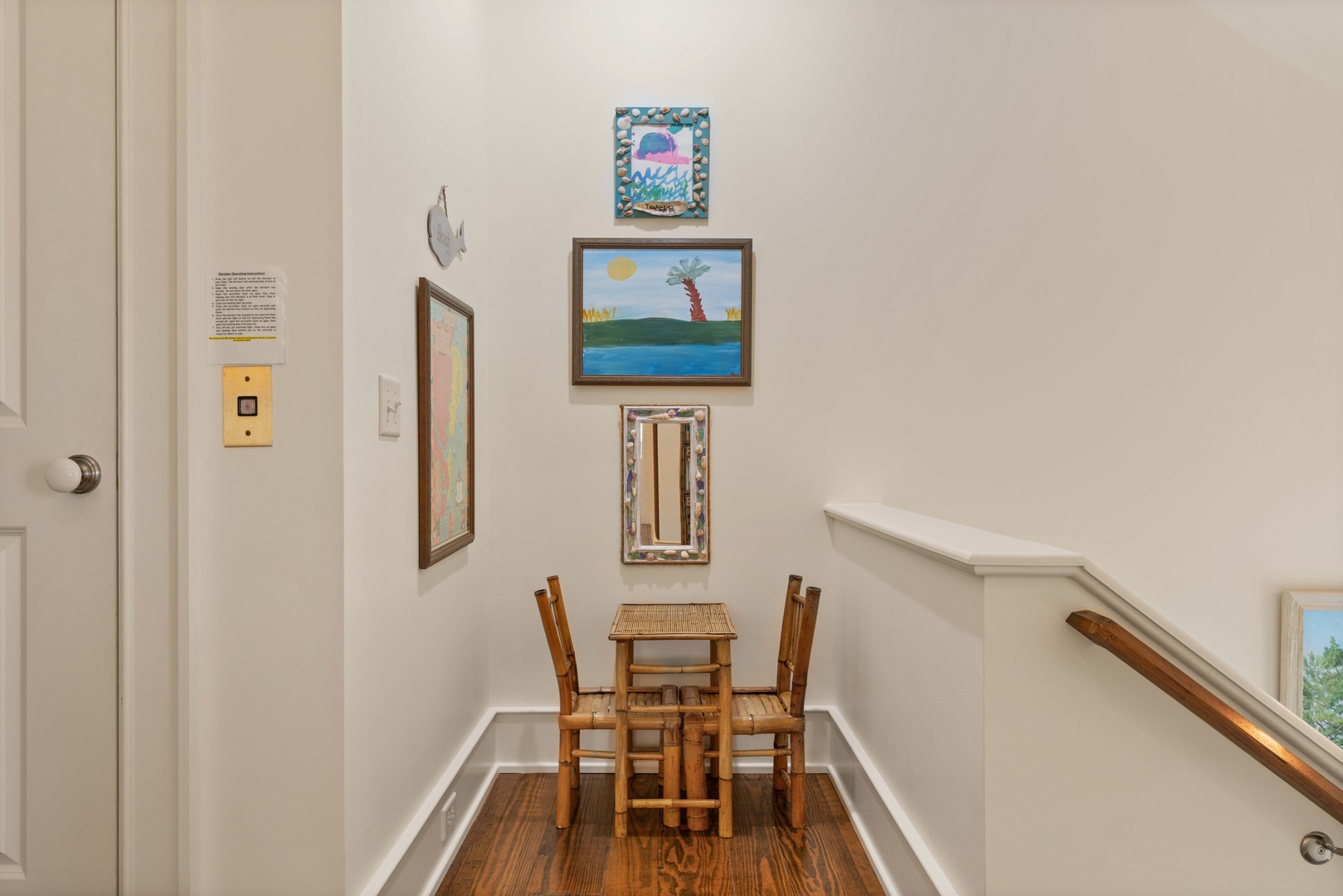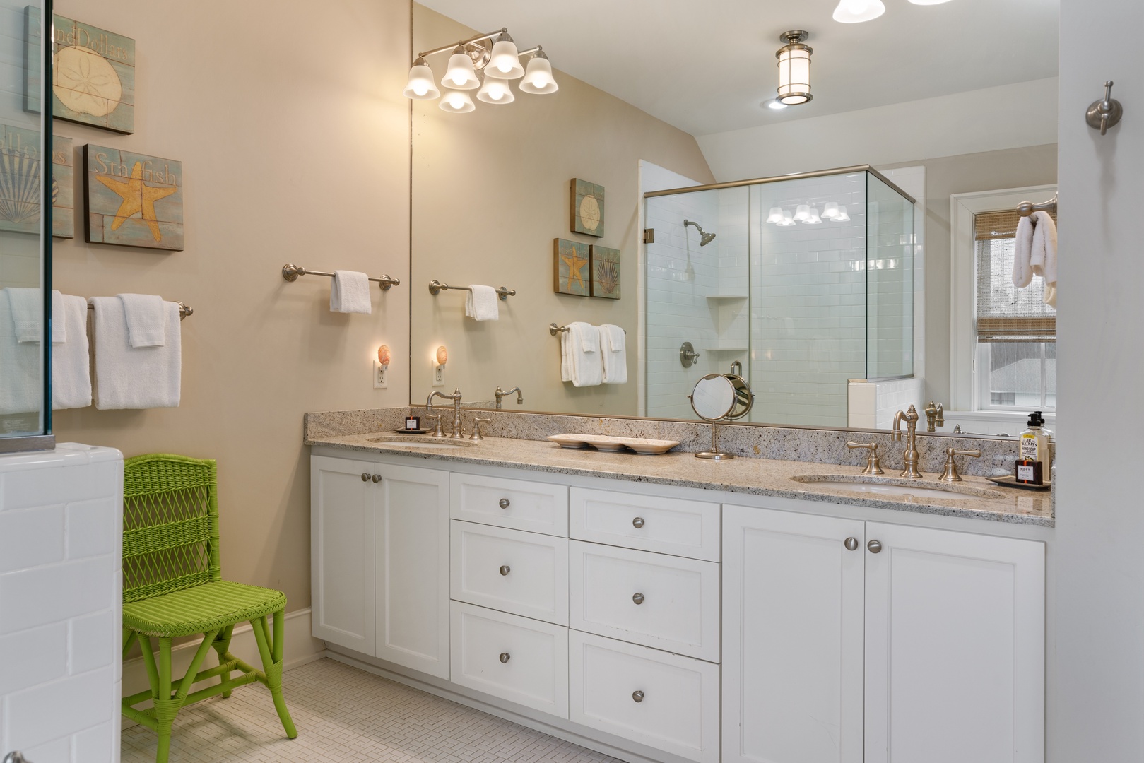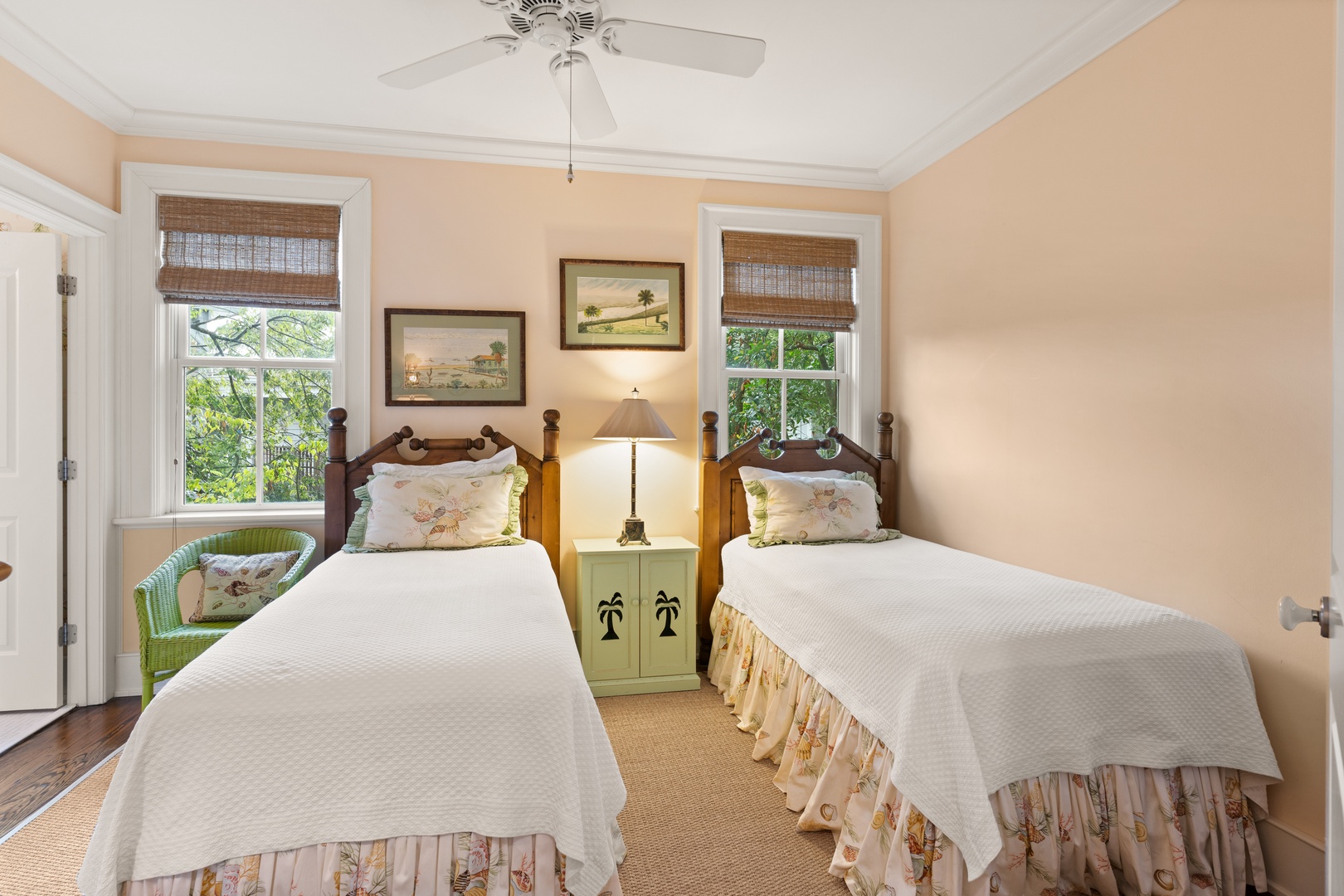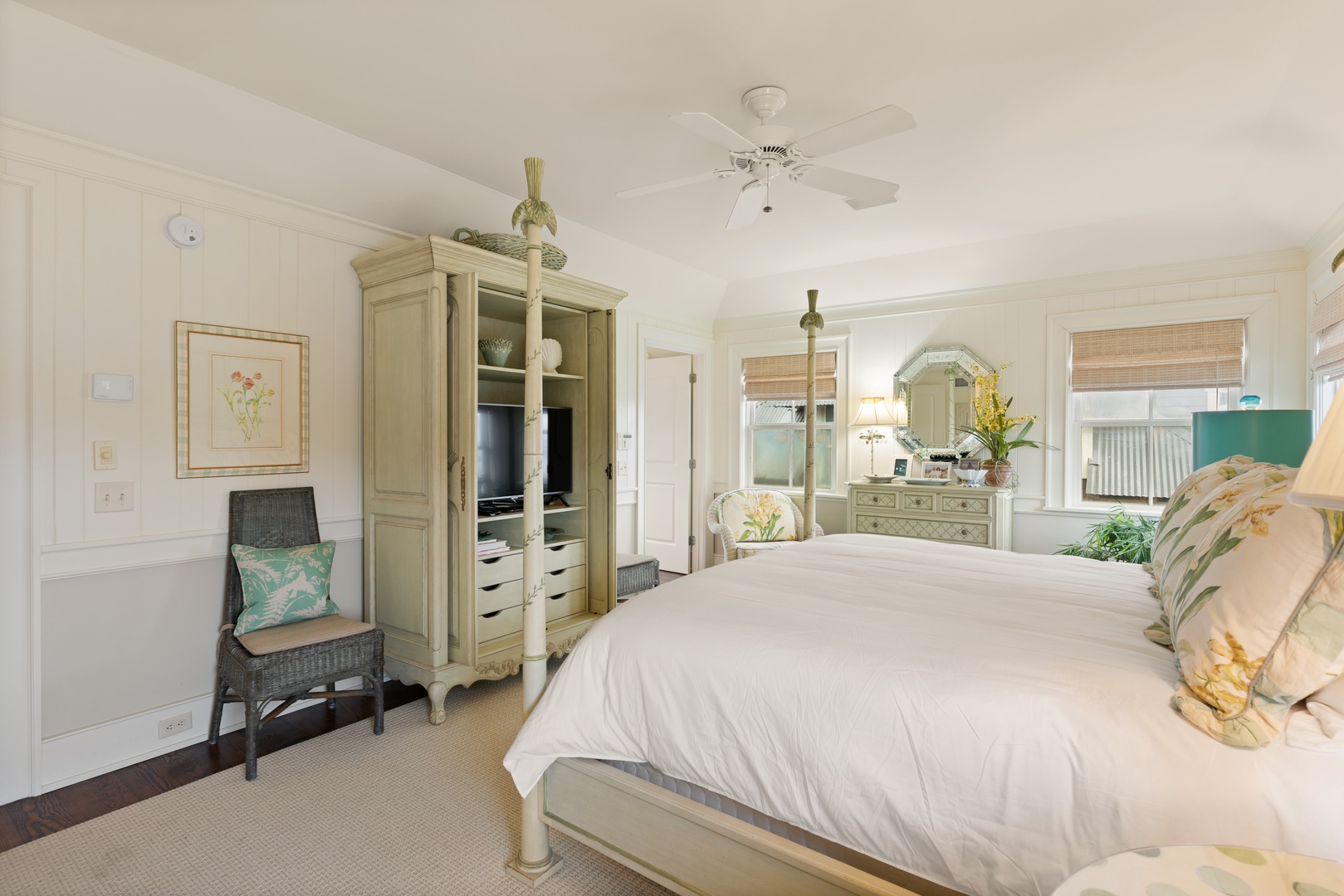 4th level – King Suite (sleeps 2), adjoining bathroom with separate water closet, shower, double vanity and tub. Adjoining the king suite is a sleeping room with daybed and trundle (sleeps 2), desk space and access to covered porch and rooftop deck.
