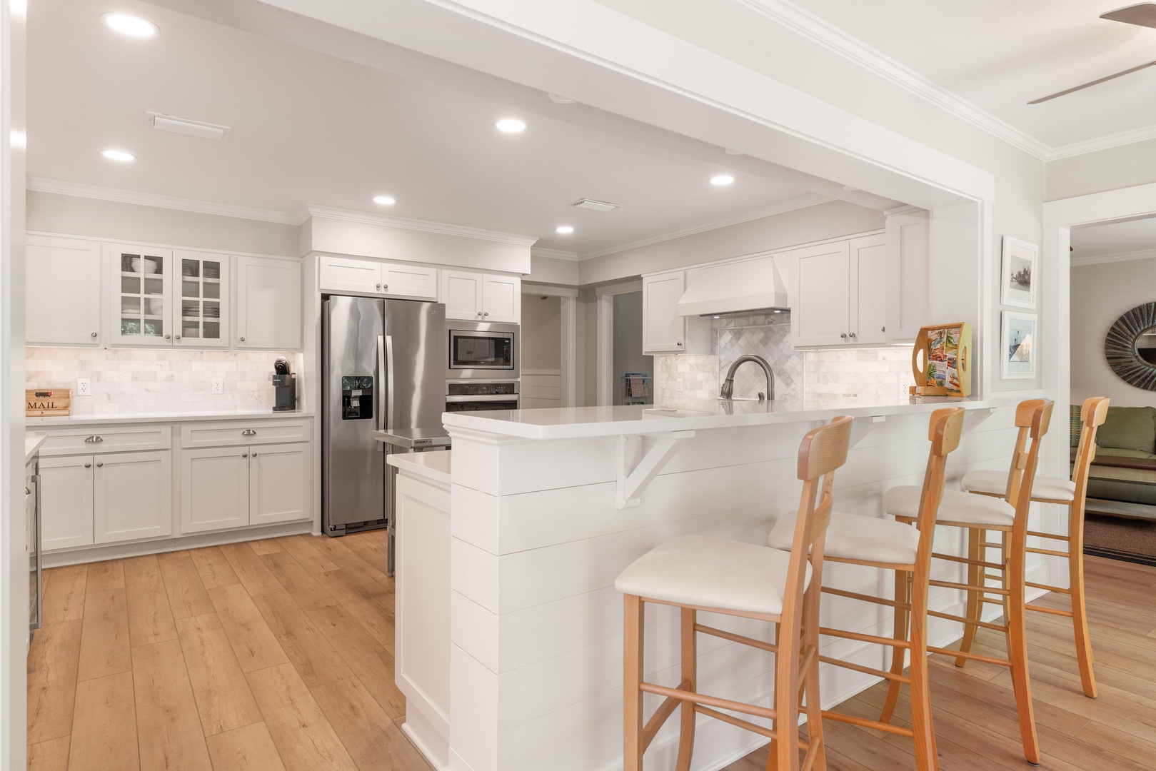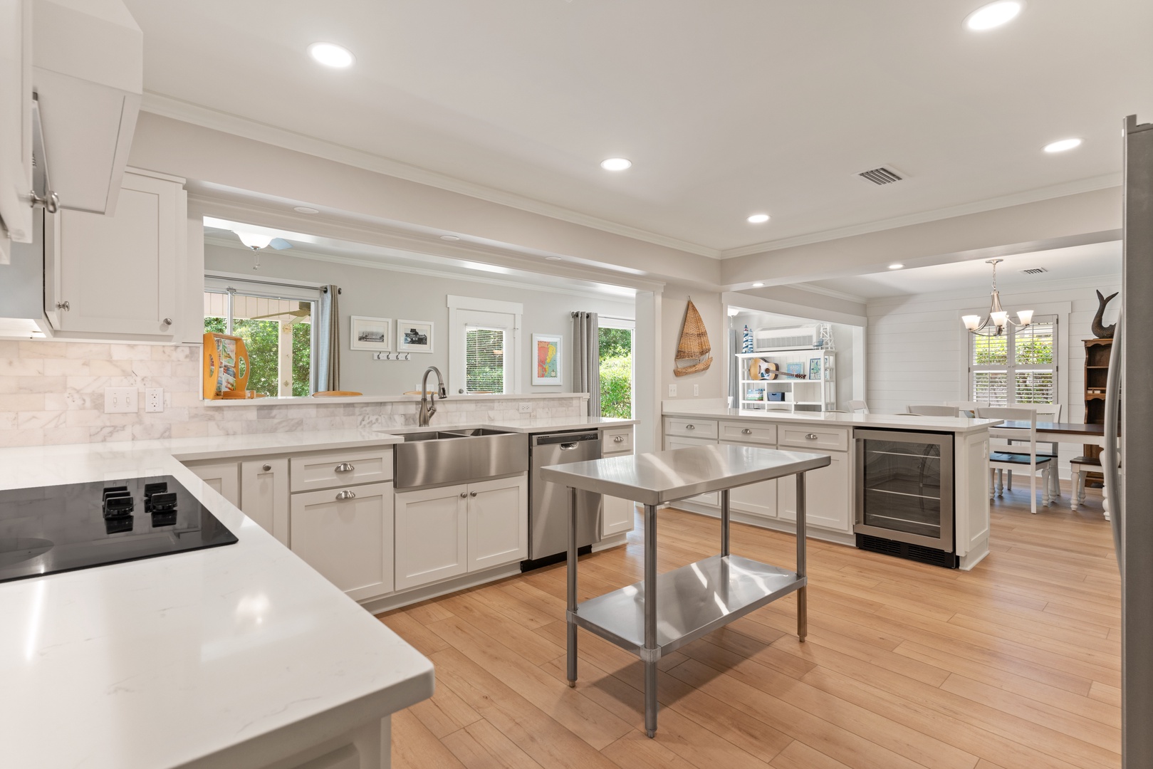 Upon entry, to the right is an open family room with large smart TV, dining room seating 8 guest, and a spacious kitchen with stainless steel appliances. Surrounding the kitchen is a low bar with 3 stools and a high bar with 4 stools. Just off the back of the kitchen is a separate den area with TV and a laundry room at the back entry.