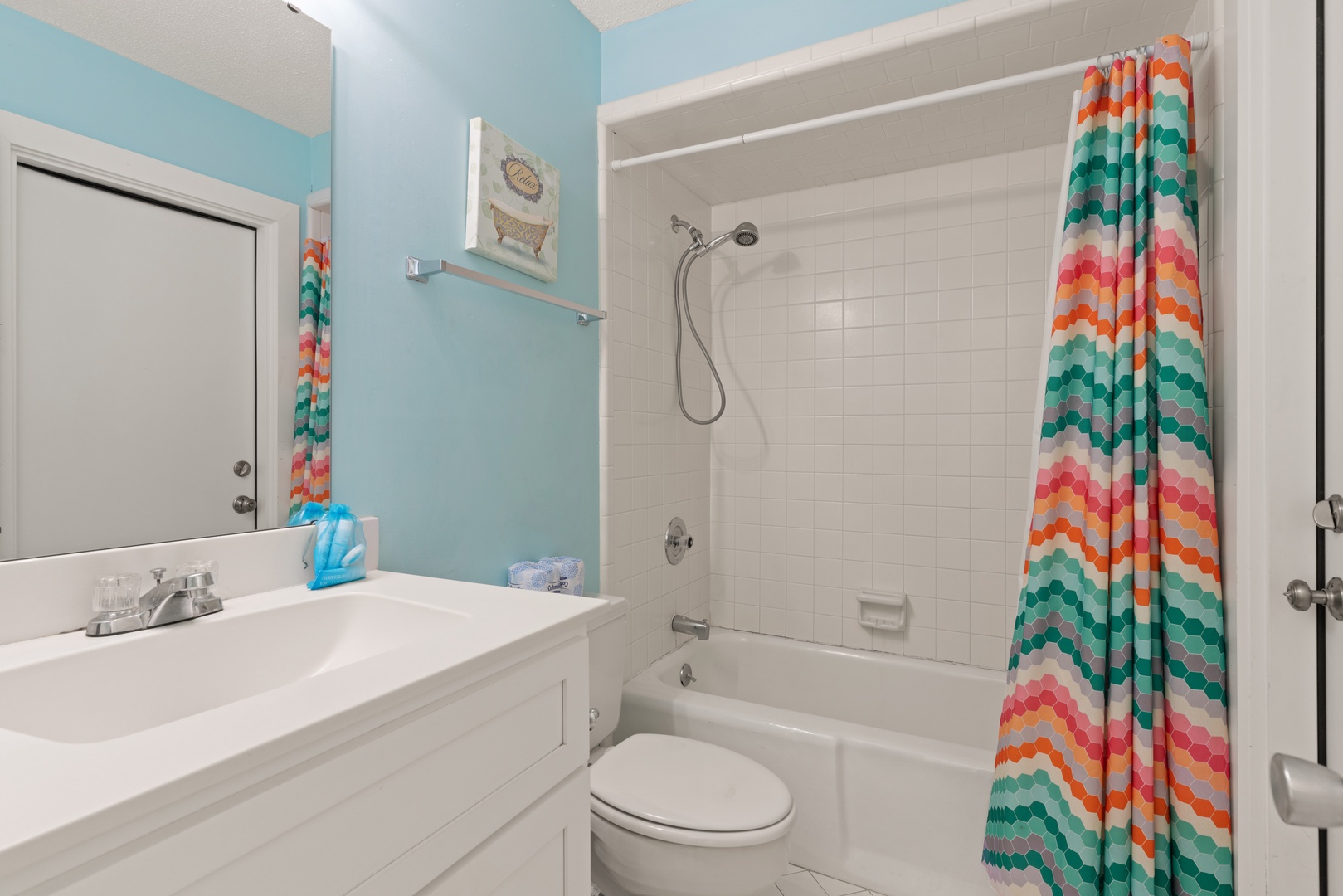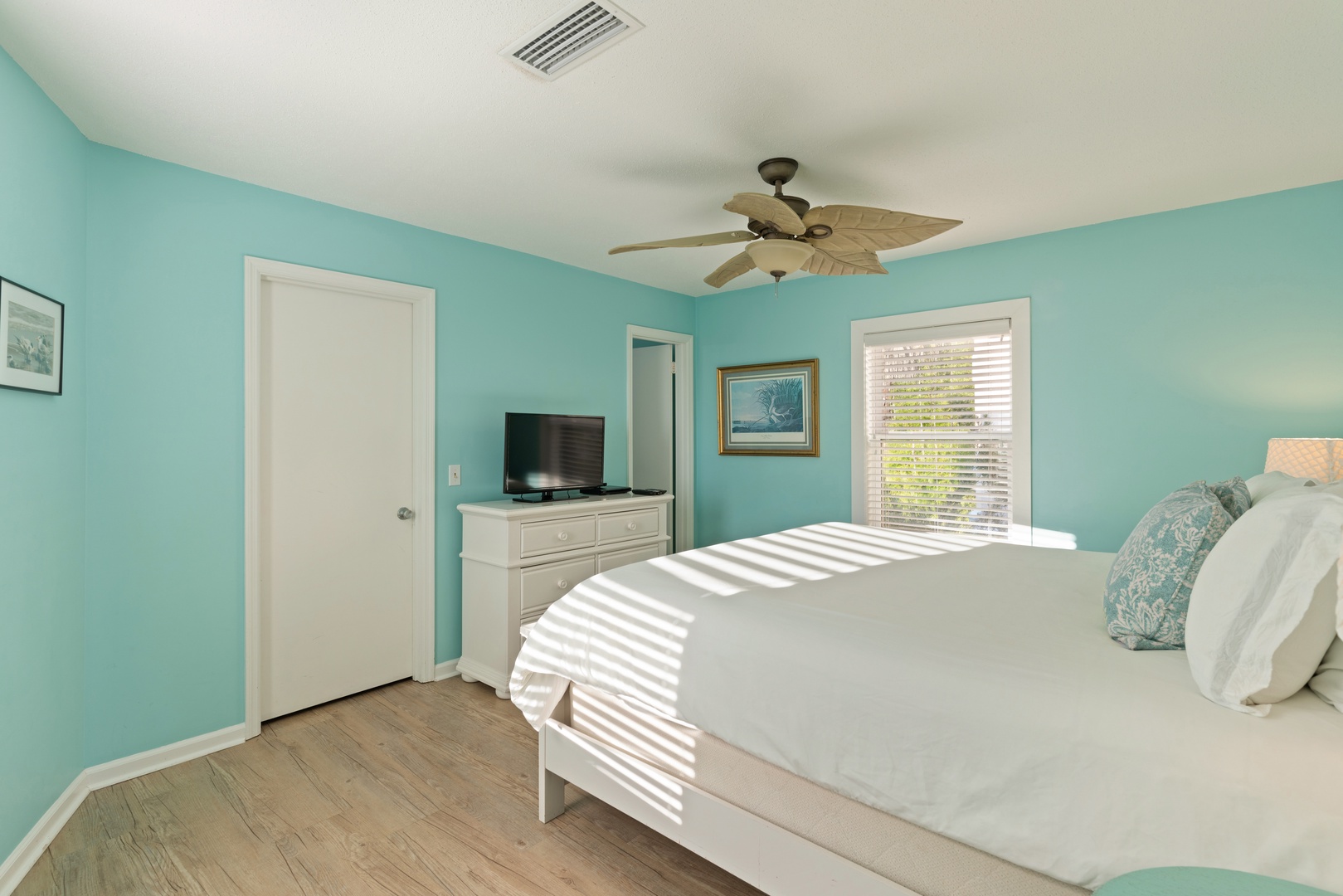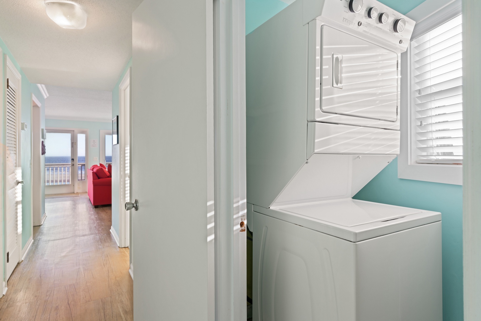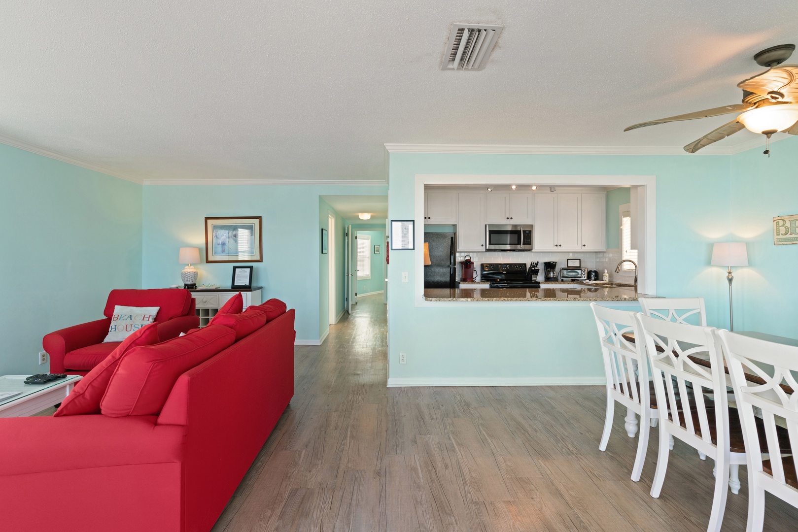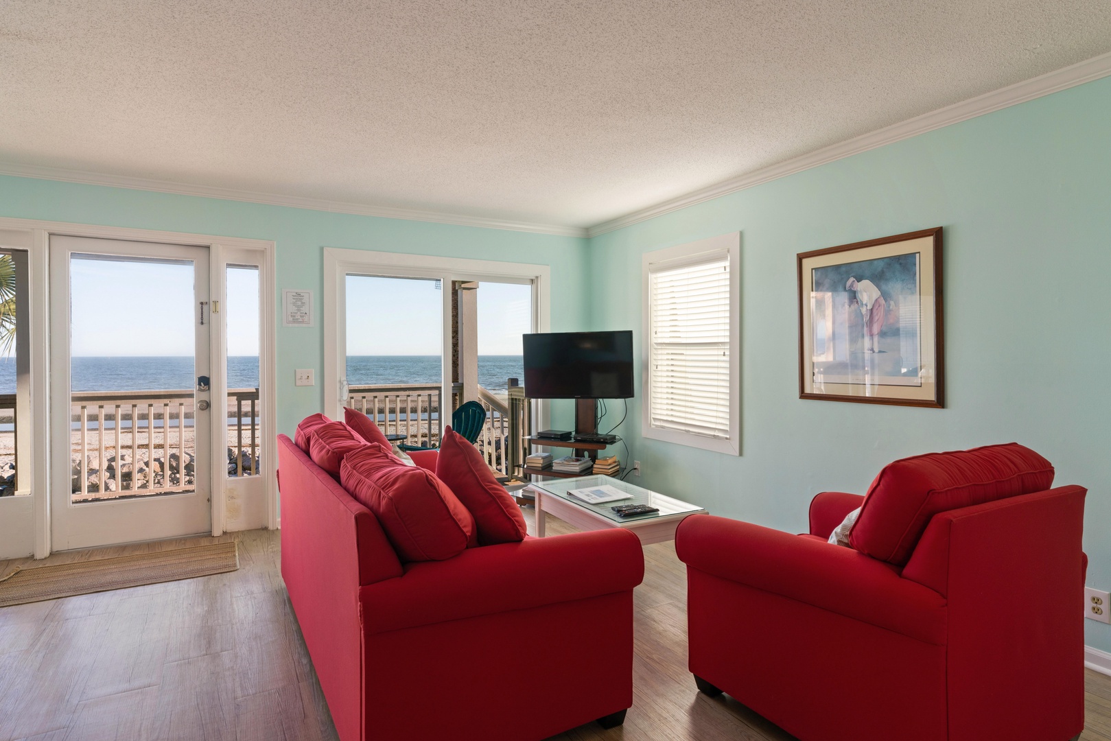Each unit features two bedrooms with comfortably appointed king beds and an open dining room/living room with a sofa sleeper with unobstructed ocean views . A queen-sized air mattress is also available. Two bathrooms feature a tub with shower and walk-in shower, respectively. Renovations to the kitchen, baths, flooring, windows, walls, etc., include comfortable furnishings, all tile and wood flooring, both air conditioning and ceiling fans, and a laundry room. We have a flat screen TV in both the living room and primary bedroom.