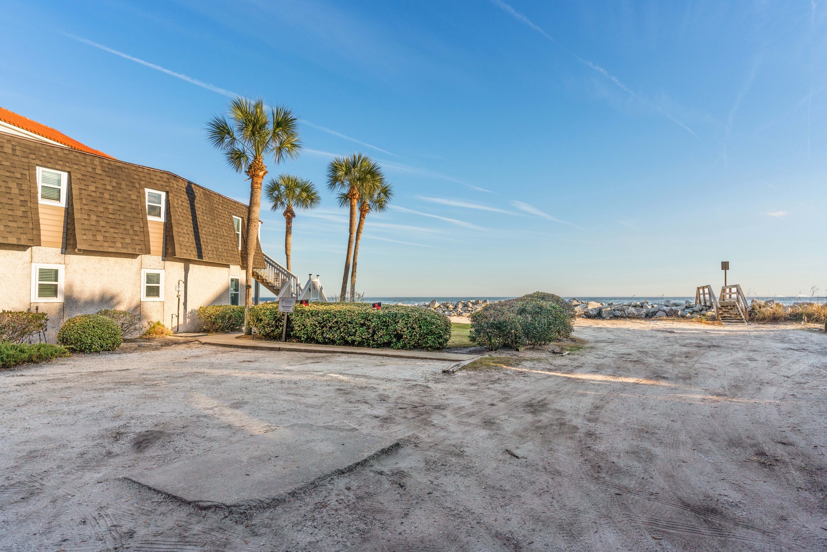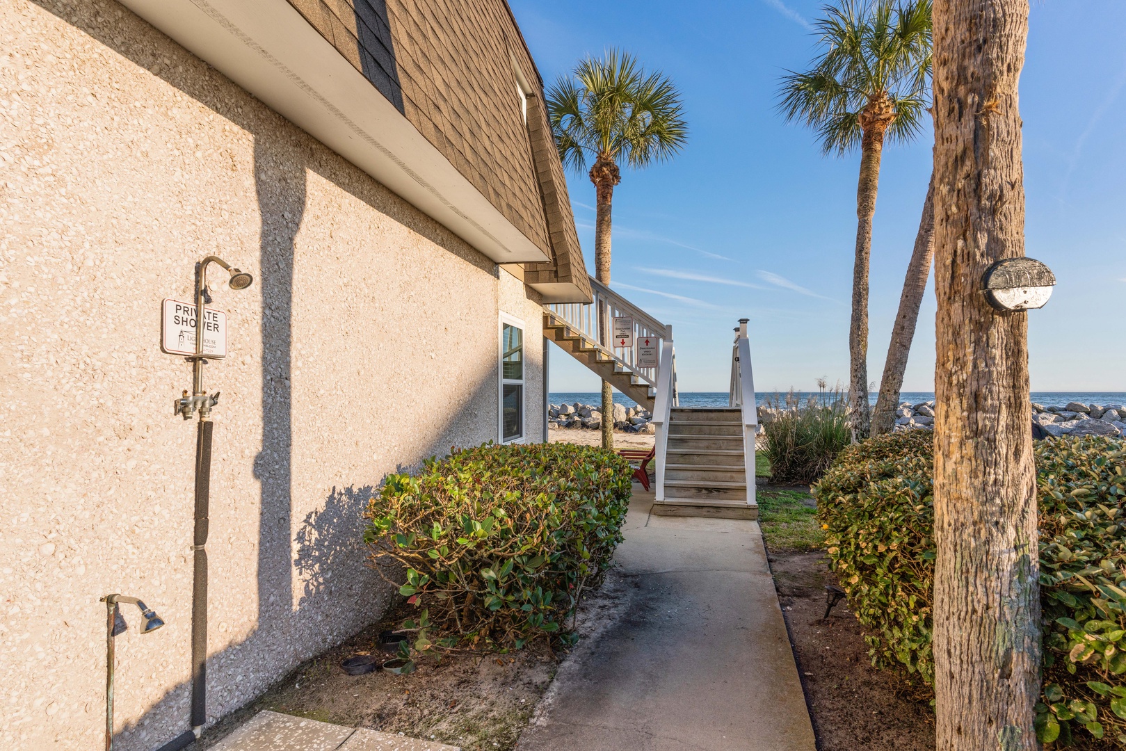 SEACLUSION is the upper floor of a unique two-unit oceanfront vacation property on St. Simons Island, accessible via an outdoor stairway to the upper deck.
