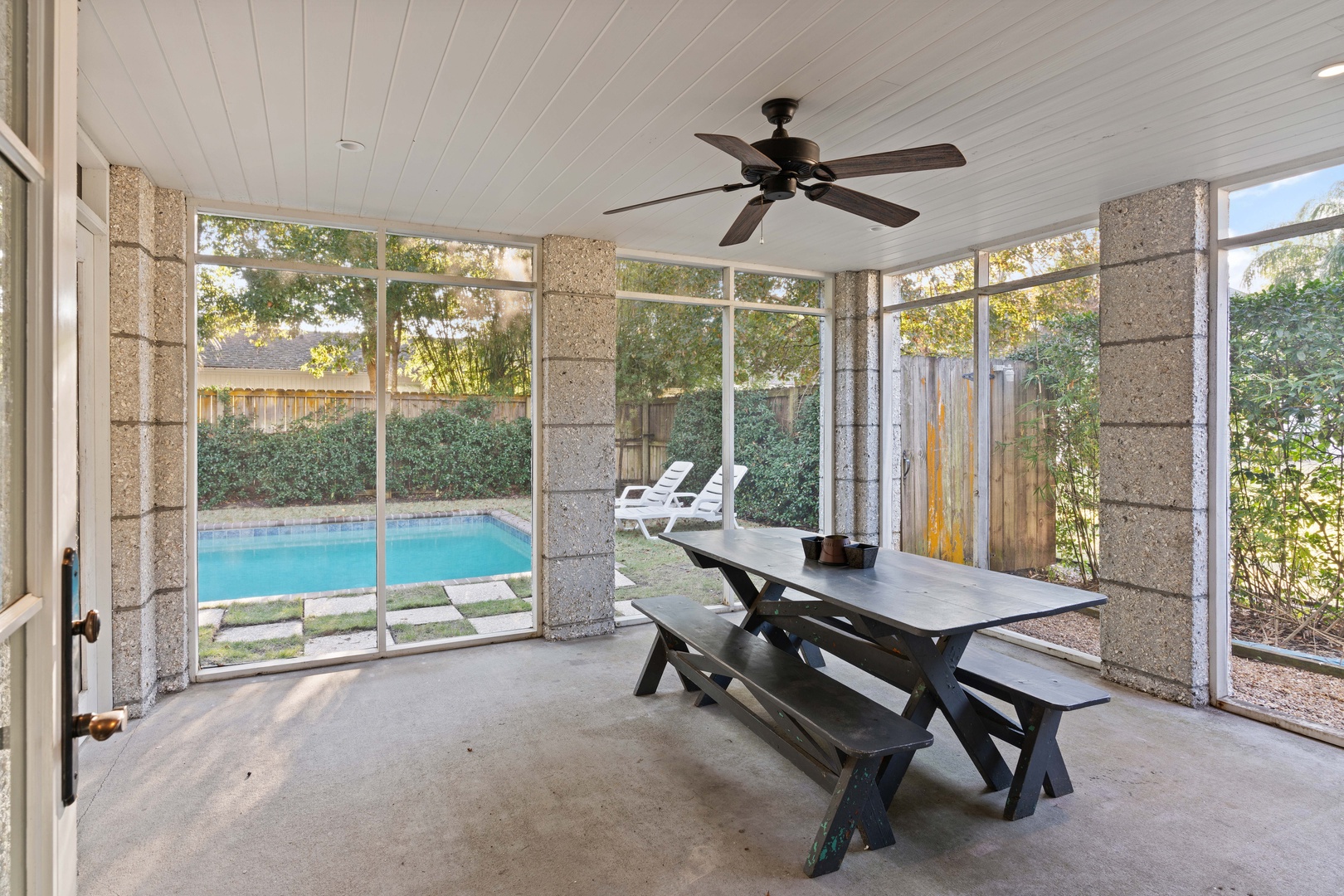 Down to the ground level, you will either exit out to the garage (which you can use for parking) or the screened in porch with a picnic table overlooking the pool and back yard. Back yard is fenced.