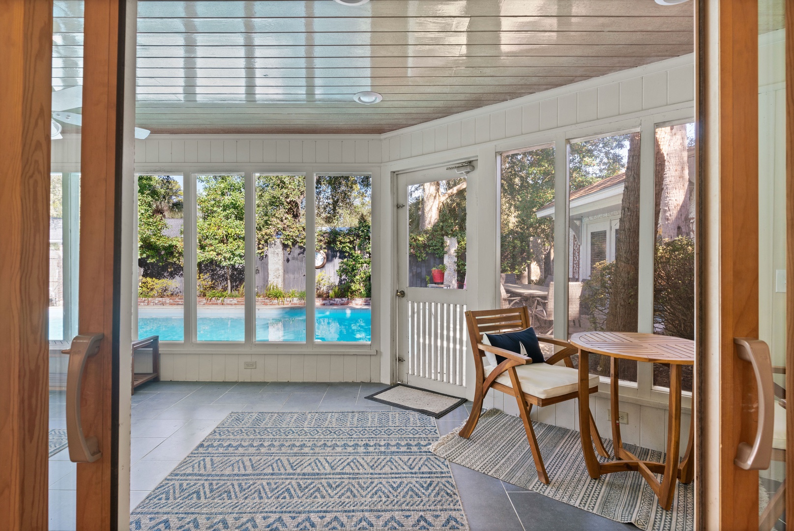 Off the family room is an enclosed sunroom overlooking the 33 X 16 pool.