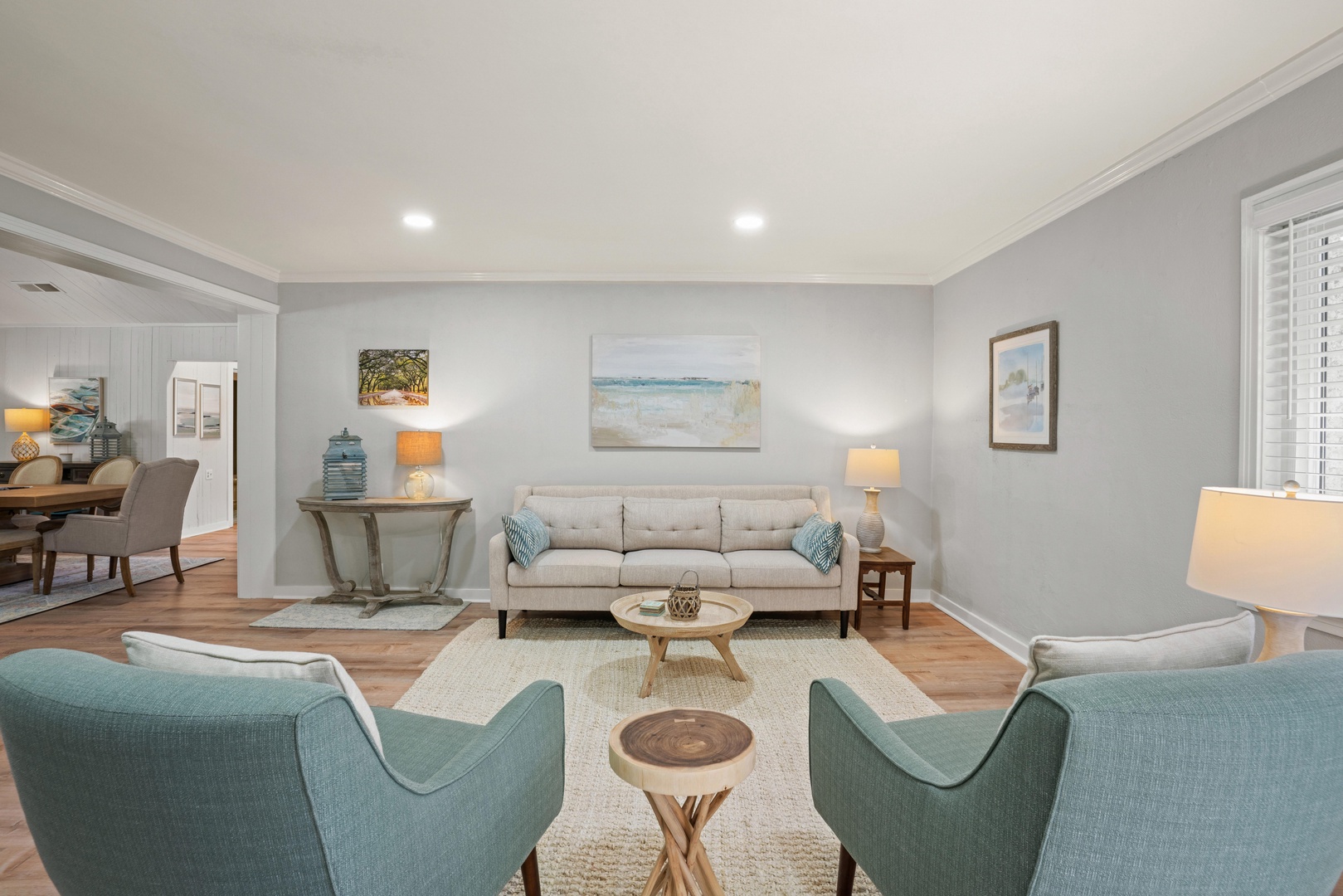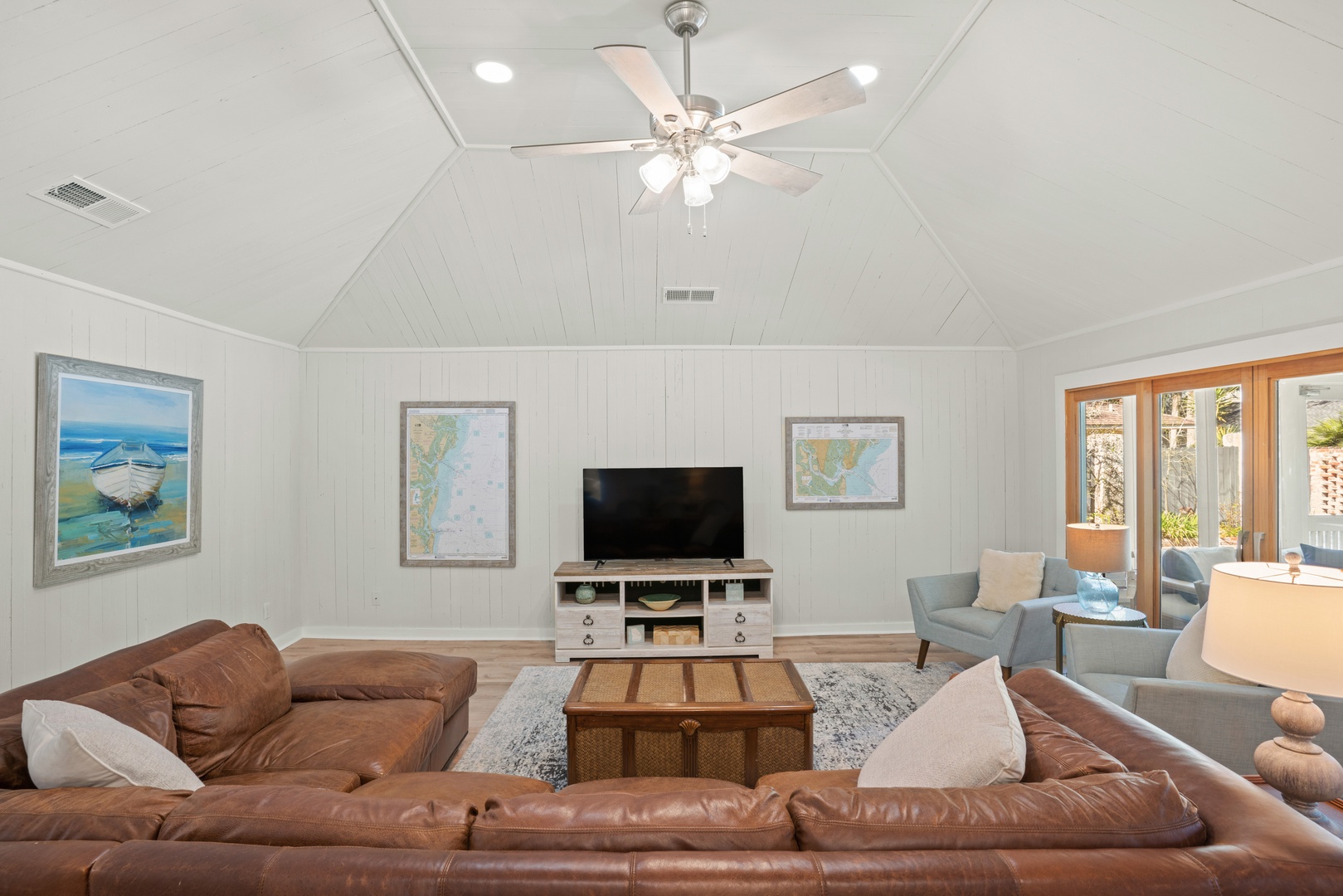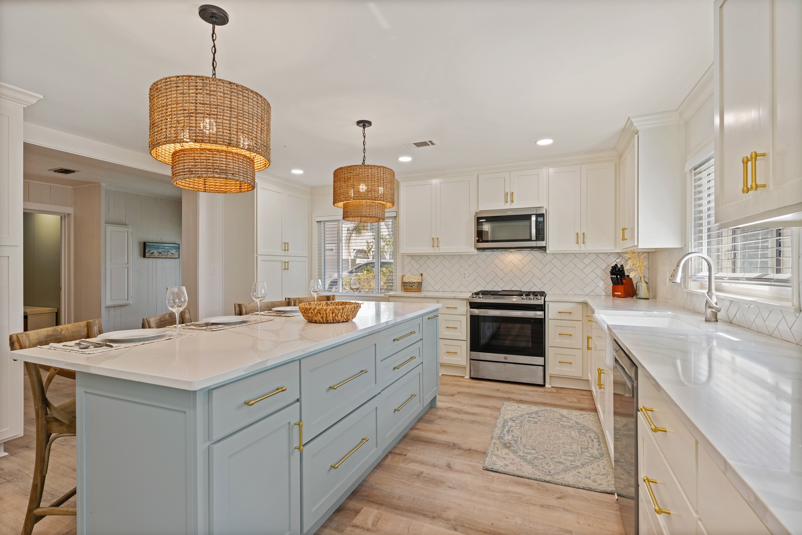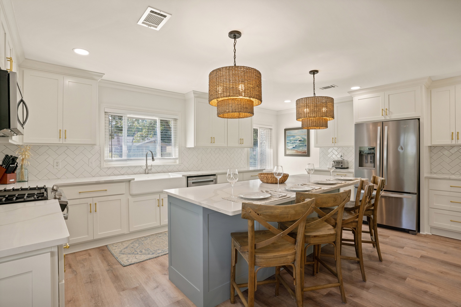 The living spaces are well-appointed and equipped with modern amenities like a fully equipped remodeled kitchen in 2022 with high-end appliances, air conditioning to keep you cool on hot days, and high-speed Wi-Fi to keep you connected.