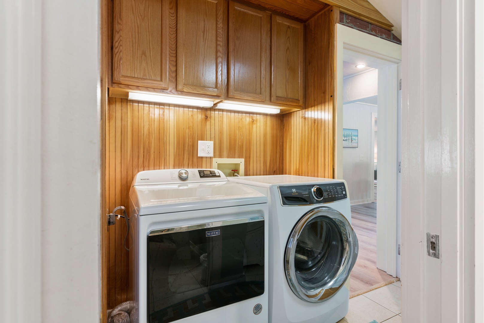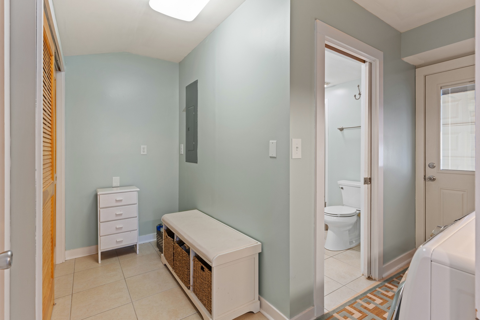 Just off the dining room is a bathroom with a shower and a laundry room area.