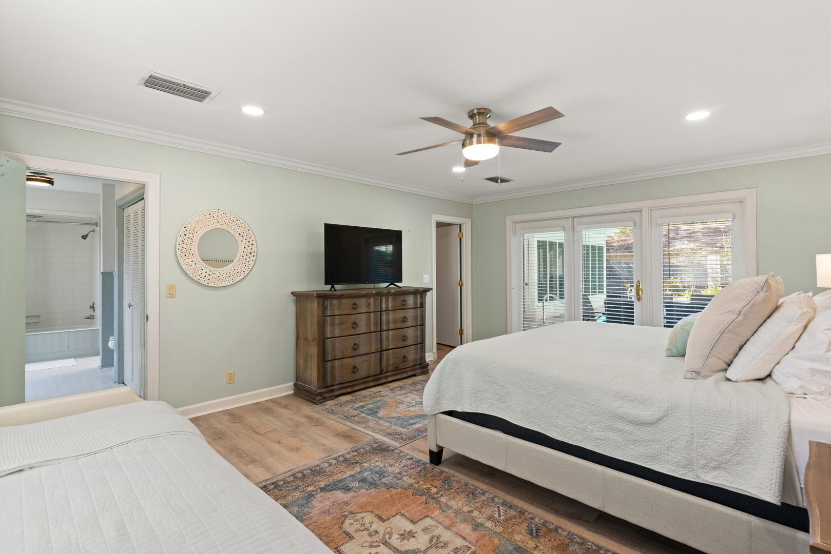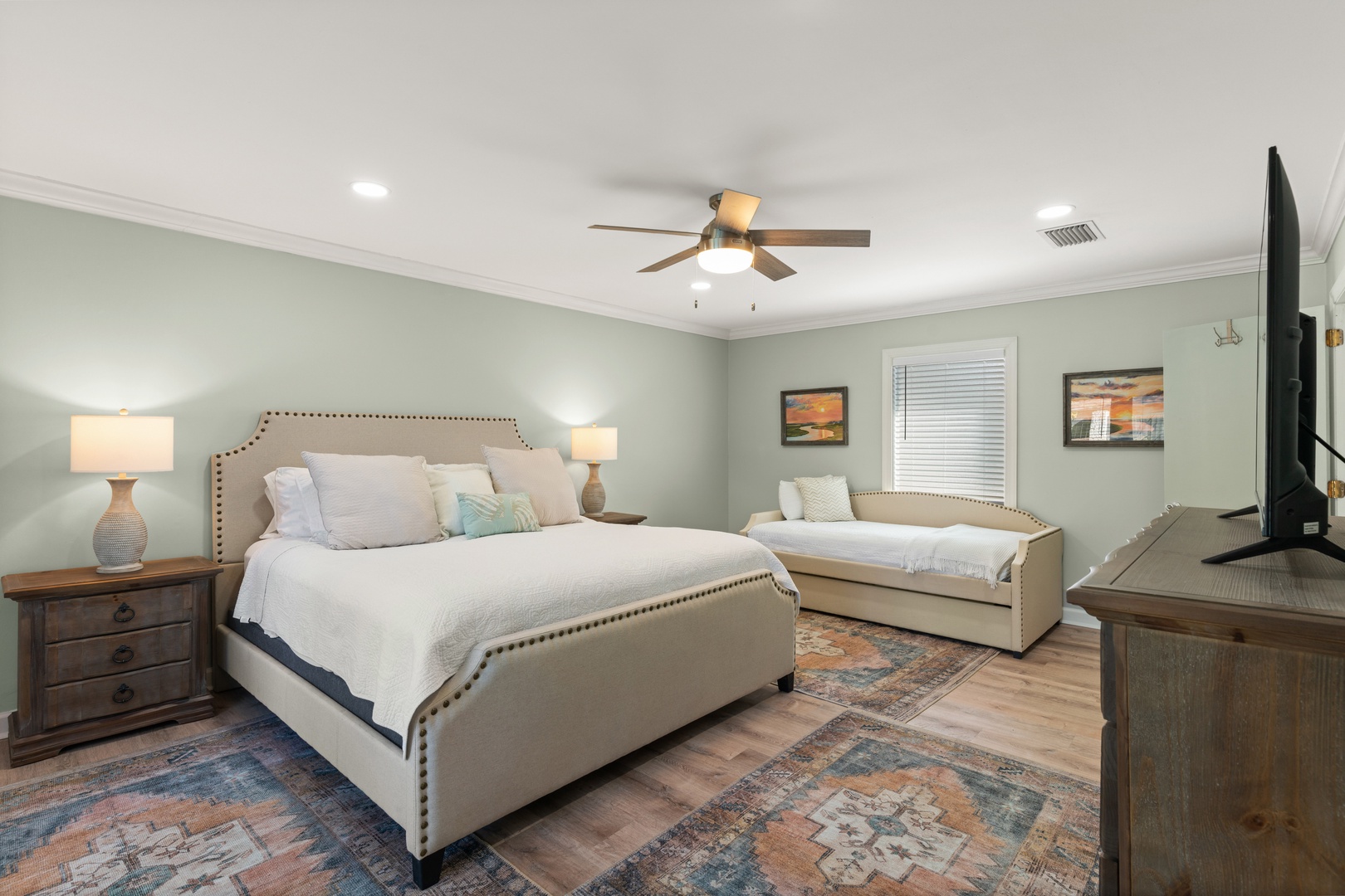 The primary bedroom has a king bed (sleeps 2), a daybed, adjoins bathroom with combination tub and shower.