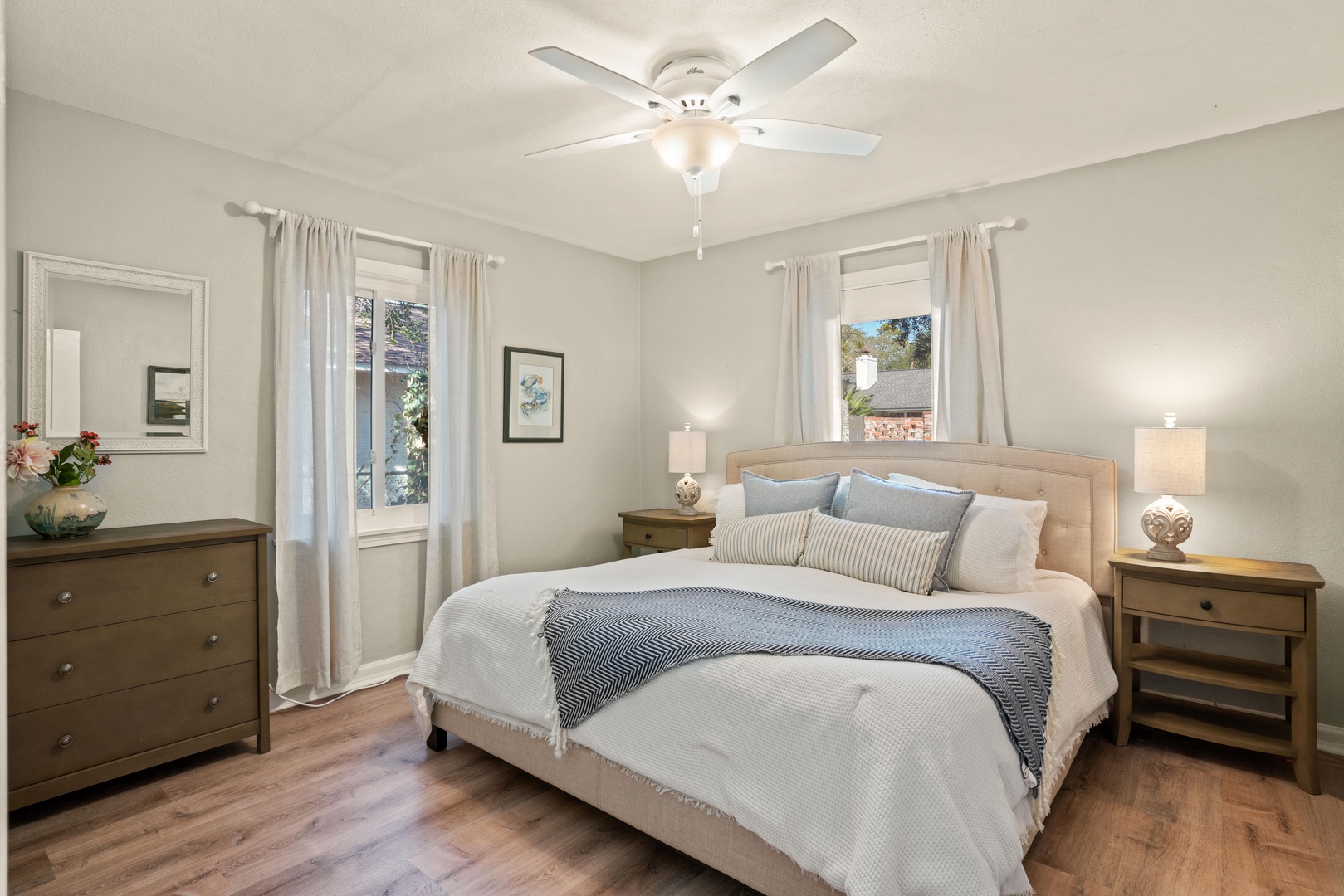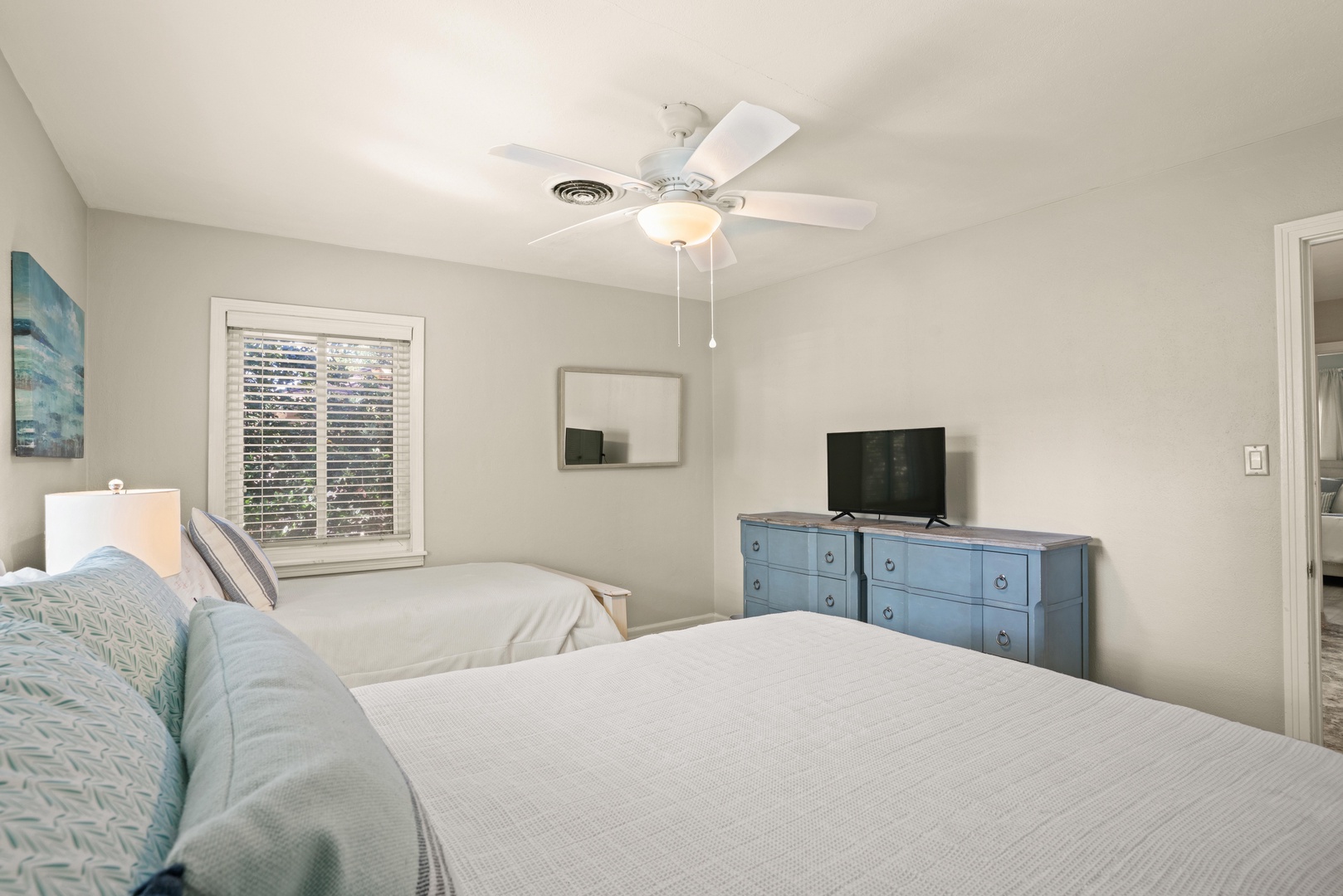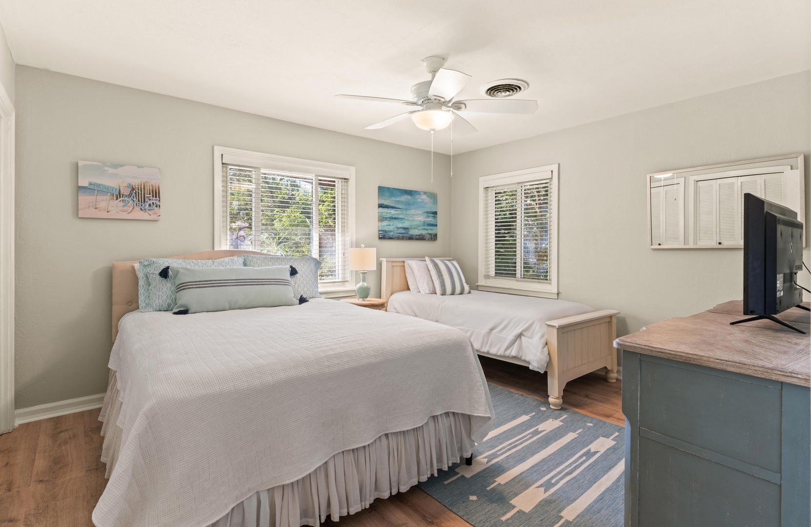 The opposite of the house are two guest rooms. One with a king bed (sleeps 2) and the other has a queen and single bed with a trundle (sleeps 4).