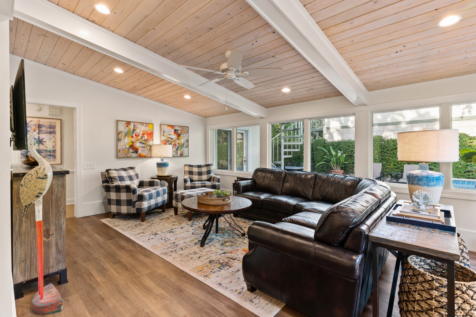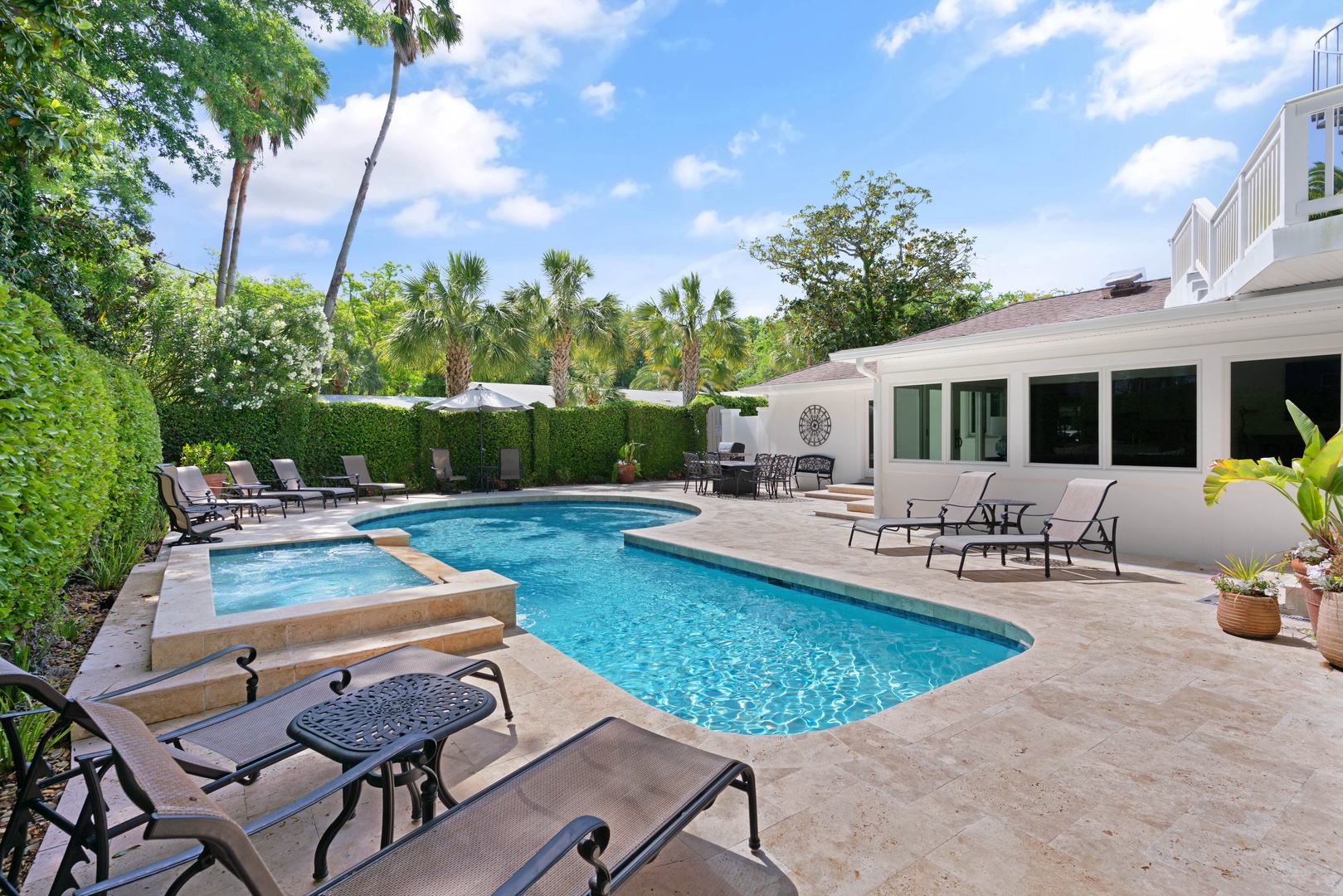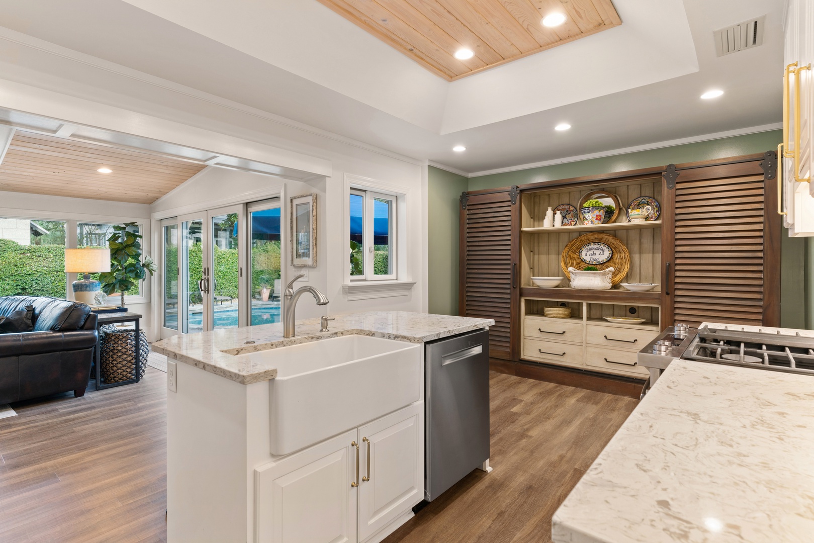 Kitchen opens to sunroom/den with views of the private pool.