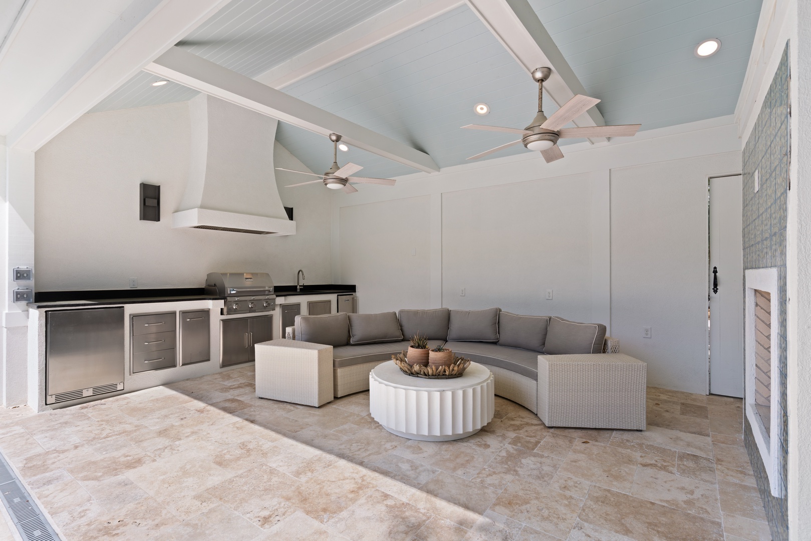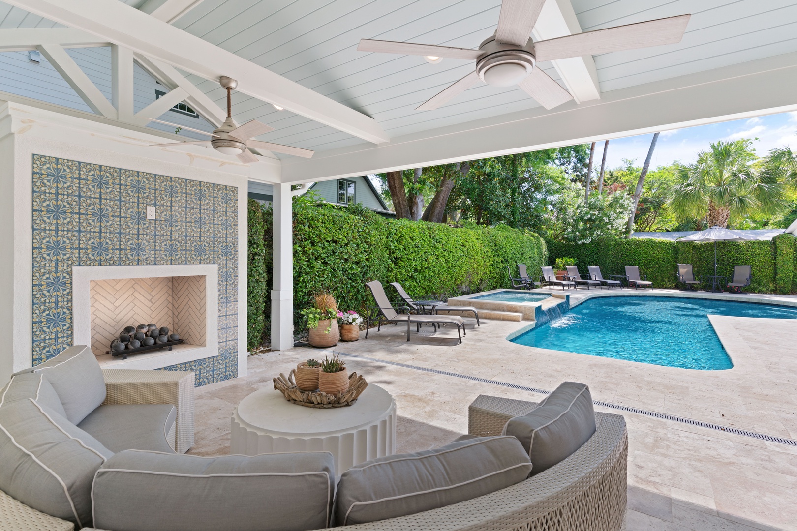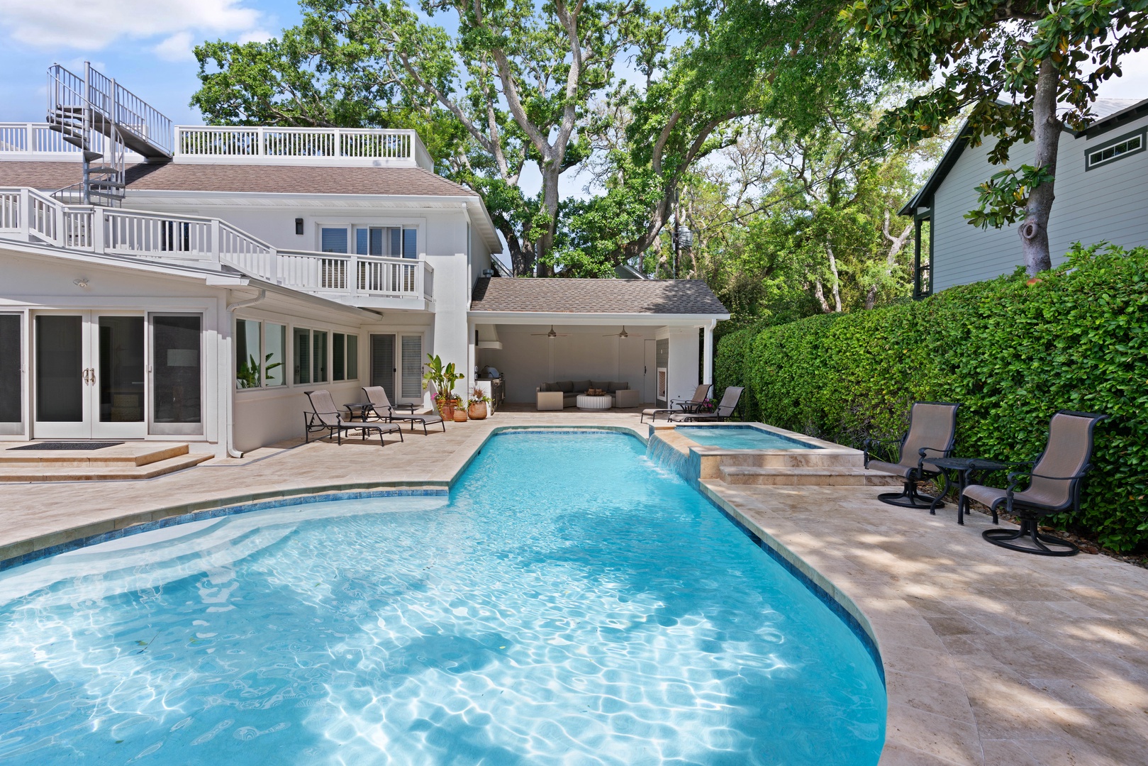 Kitchen opens to sunroom/den with views of the private pool.