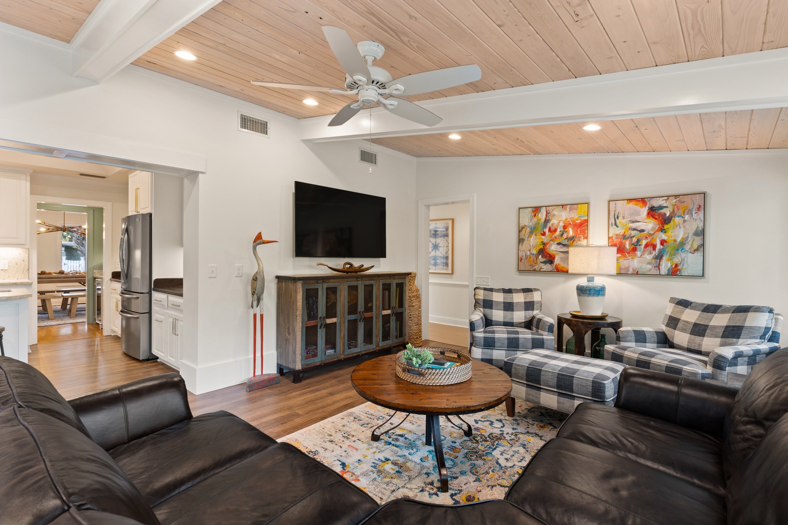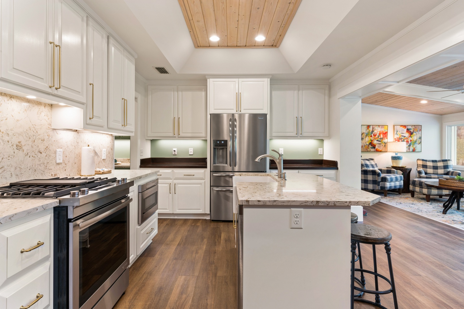 A few steps out of the living room you enter the open concept kitchen, with a gas stove, single serve Keurig, and plenty of utensils, pots and pans for use during your stay.