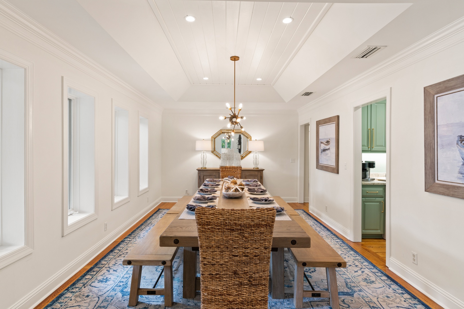 Two steps up on the front porch. Enter into Living area to your right (TV) and to the left is a large dining room which will seat your 10-guests with room to spare.