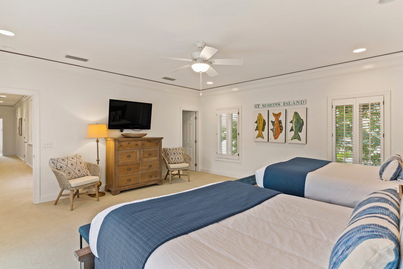 Bedroom 3 – 2 Queen Beds, TV, access to outside upper porch with staircase down to lower pool area