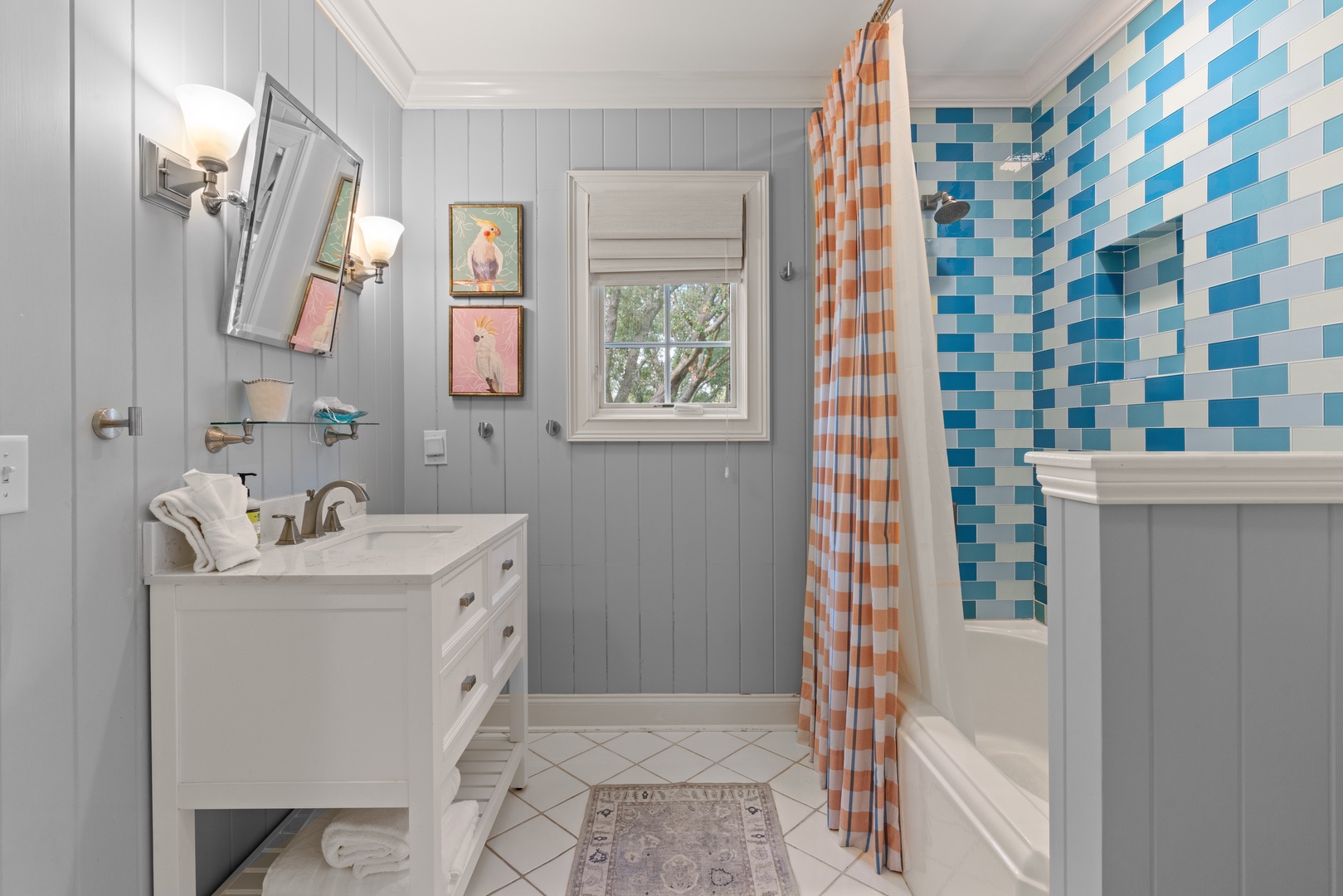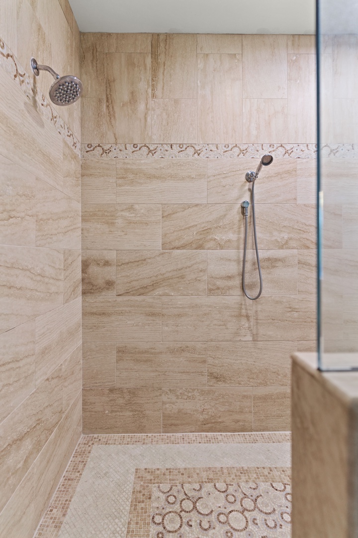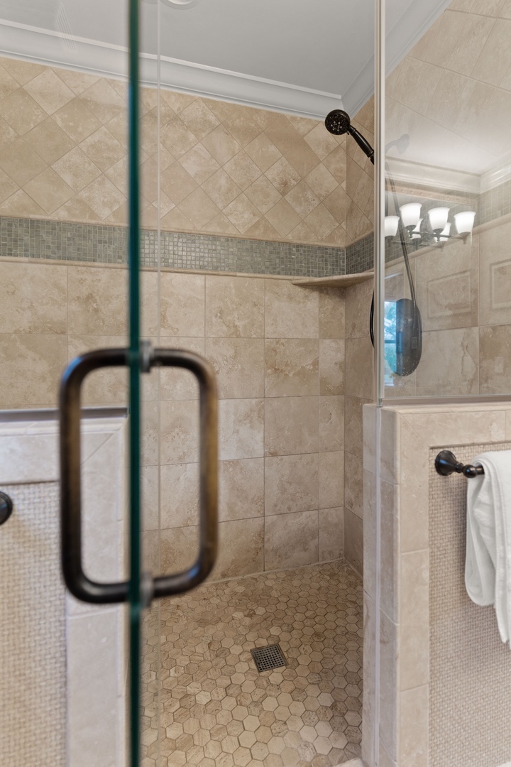 Upstairs has a guest bedroom with a queen bed, guest bedroom with a King bed and a hall bathroom with combo tub/shower. At the end of the hall is a king bedroom suite and en suite bathroom.