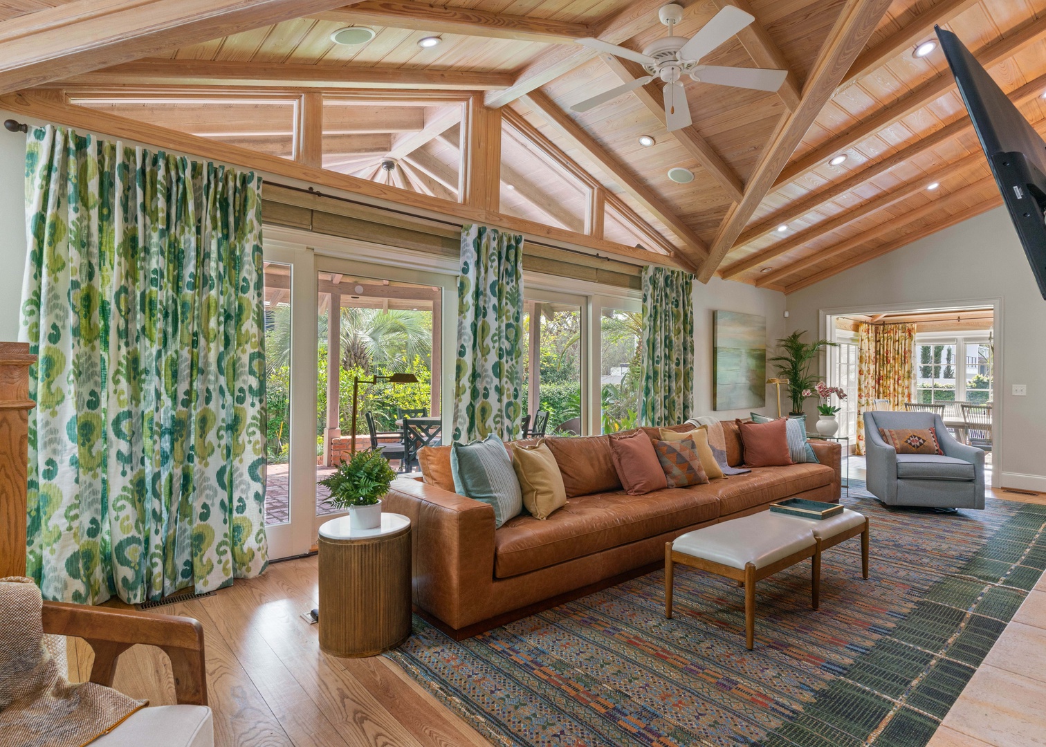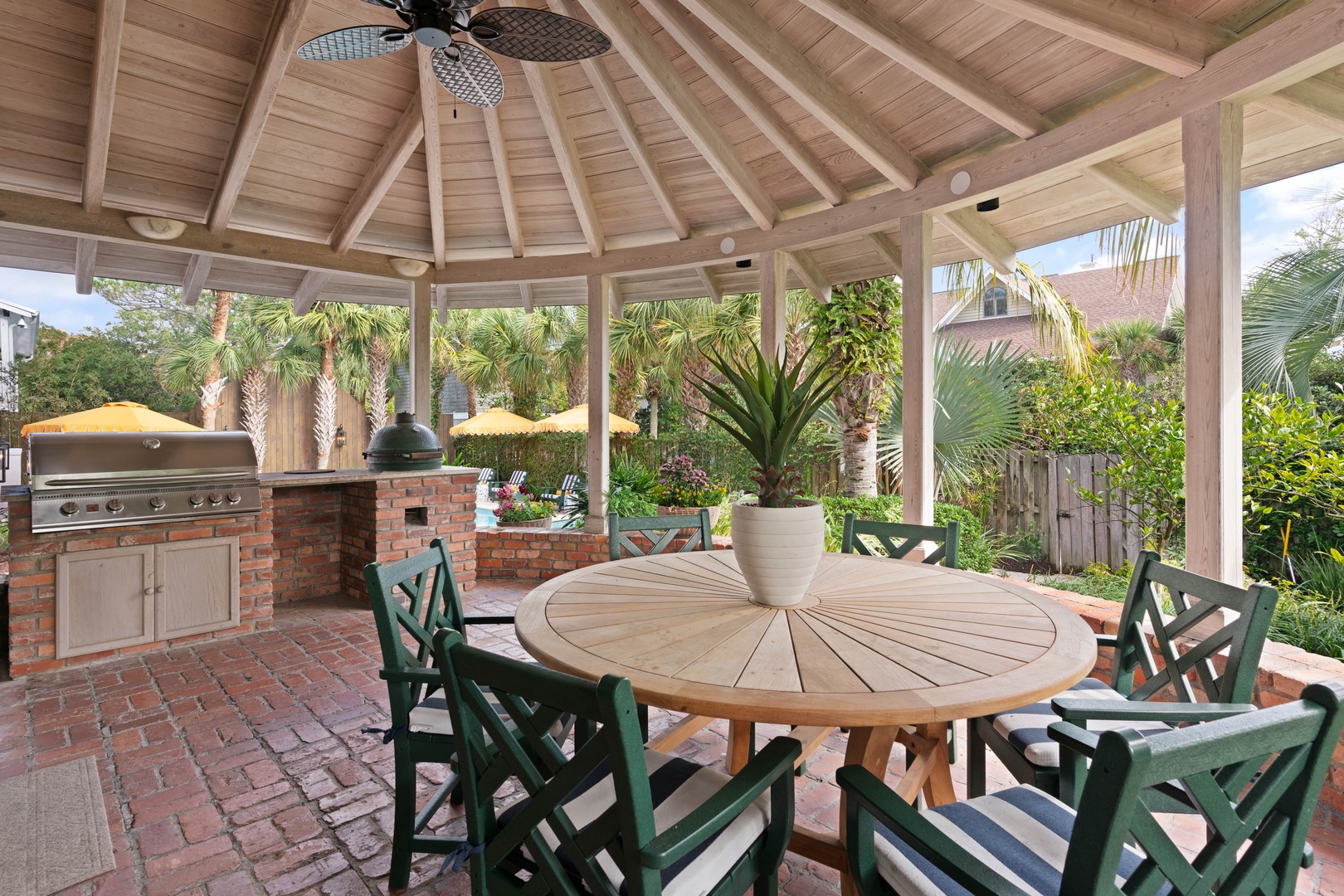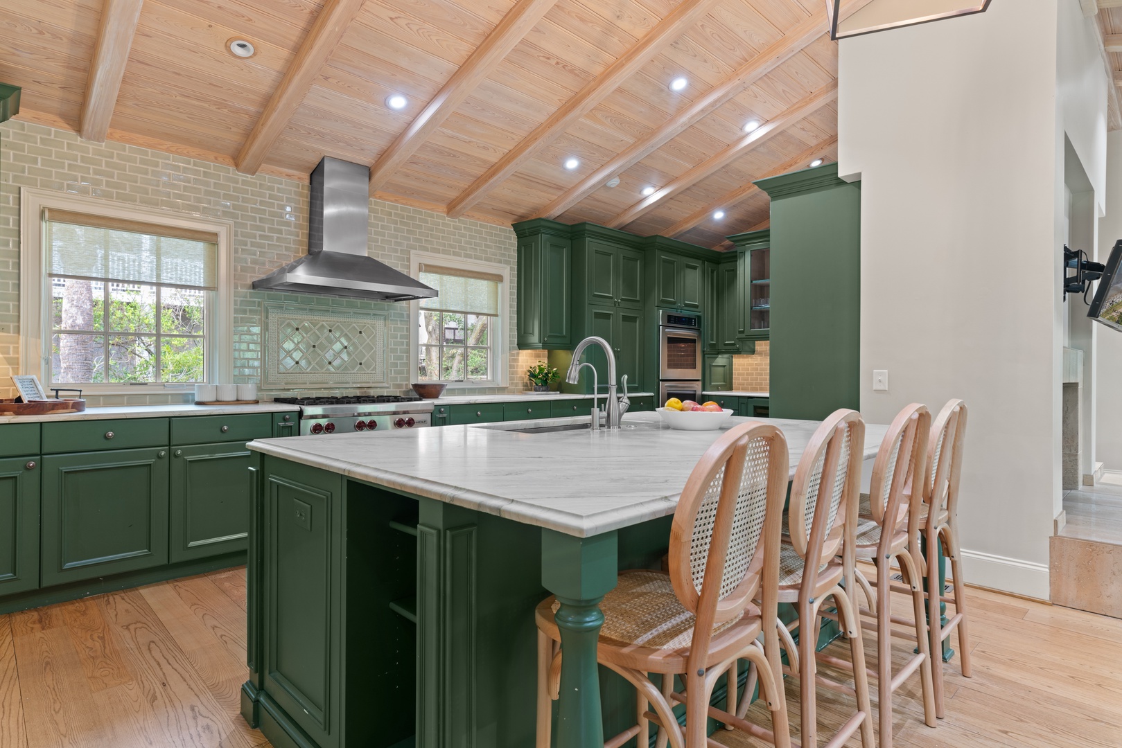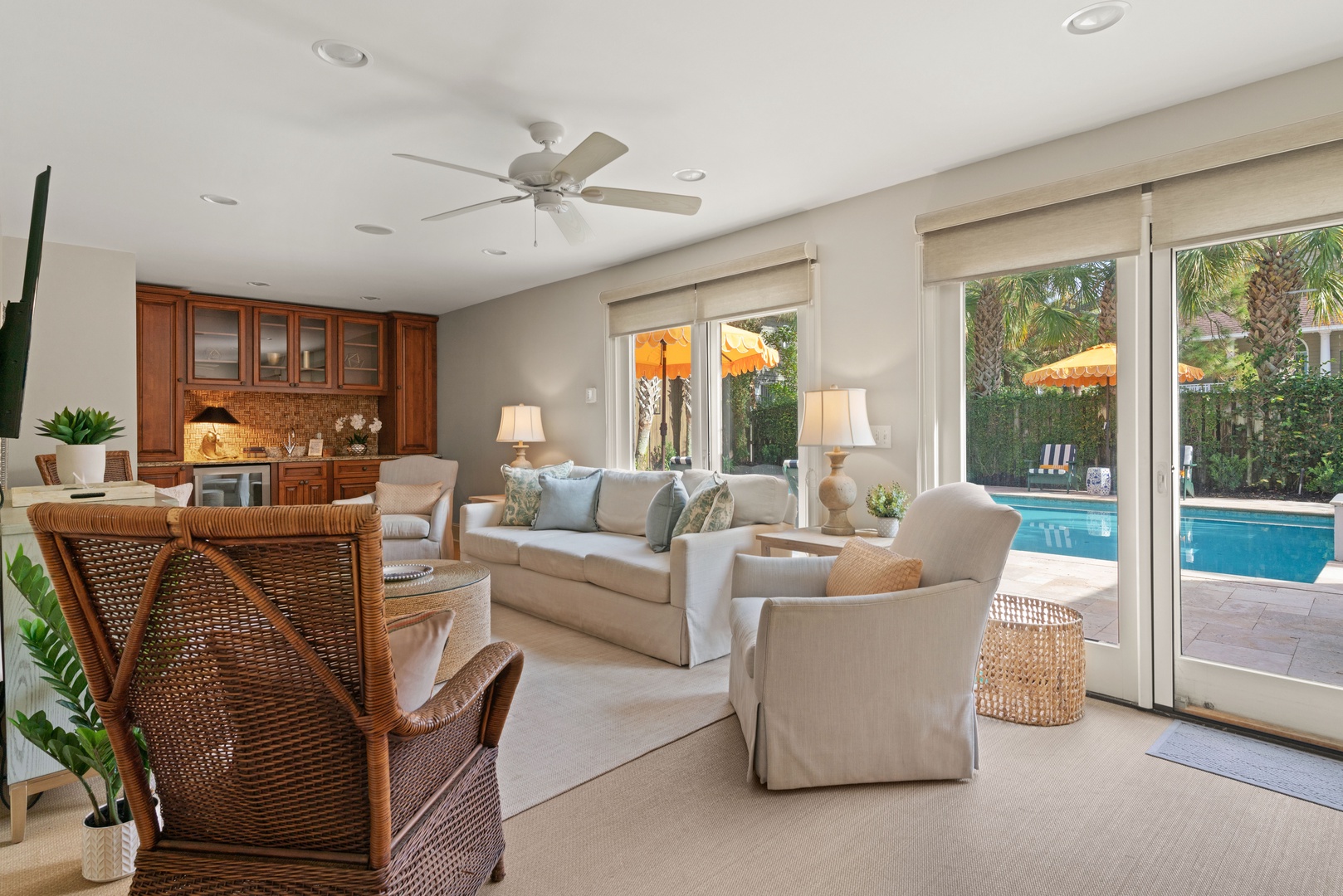 The main level serves as the living area with a large chef's style kitchen, Wolf 6 burner gas stove, Sub Zero Refrigerator, Microwave, Ninja, and fully equipped kitchen. The kitchen is open to a family room and separate dining room. There is access to the covered lanai with a Natural Gas Grill and a Green Egg Cooker.