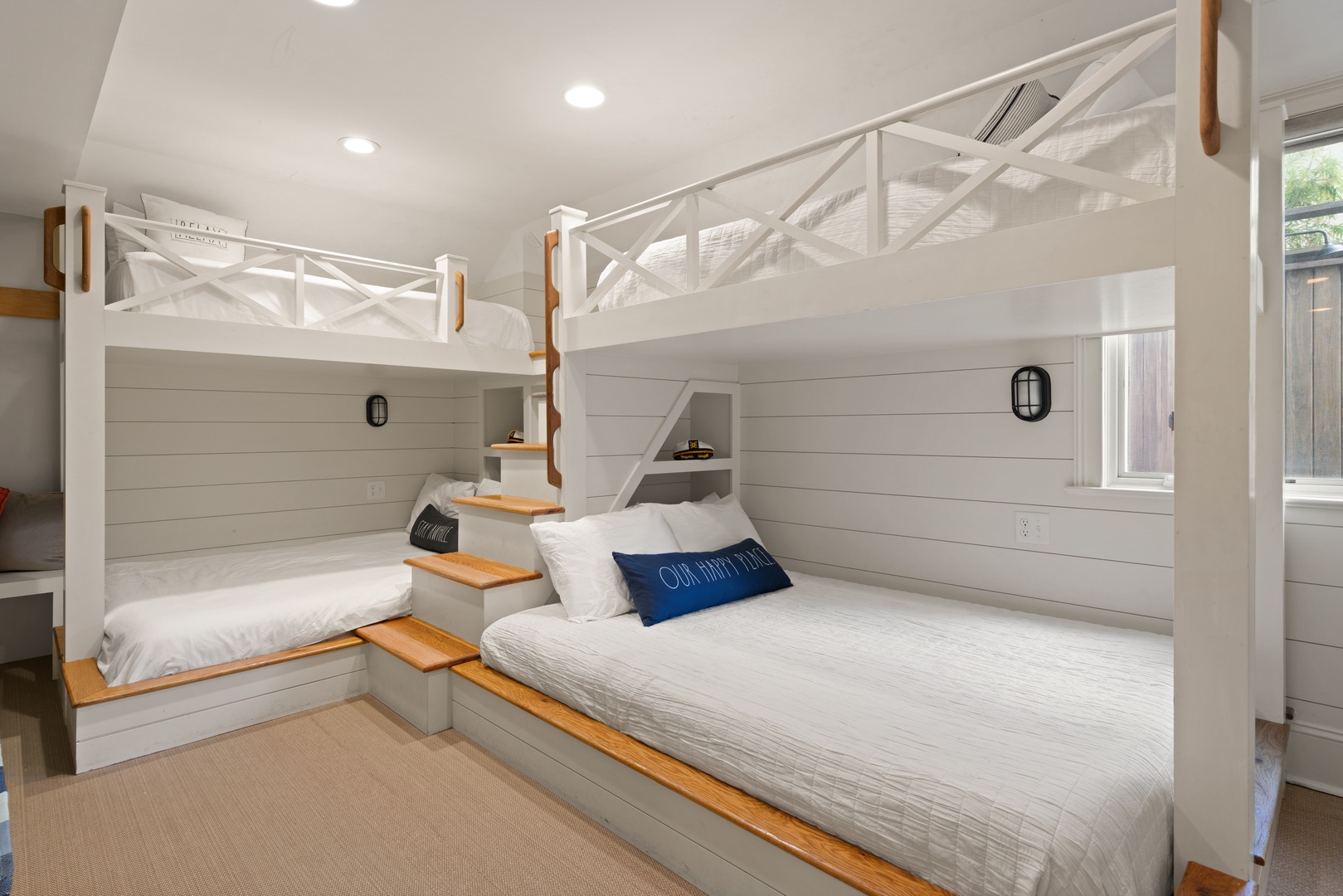 The ground features our new bunk room with 2 Twin XL Single beds and 2 Queen beds on the lower bunks, there is a full bath and a half bath off the family room.