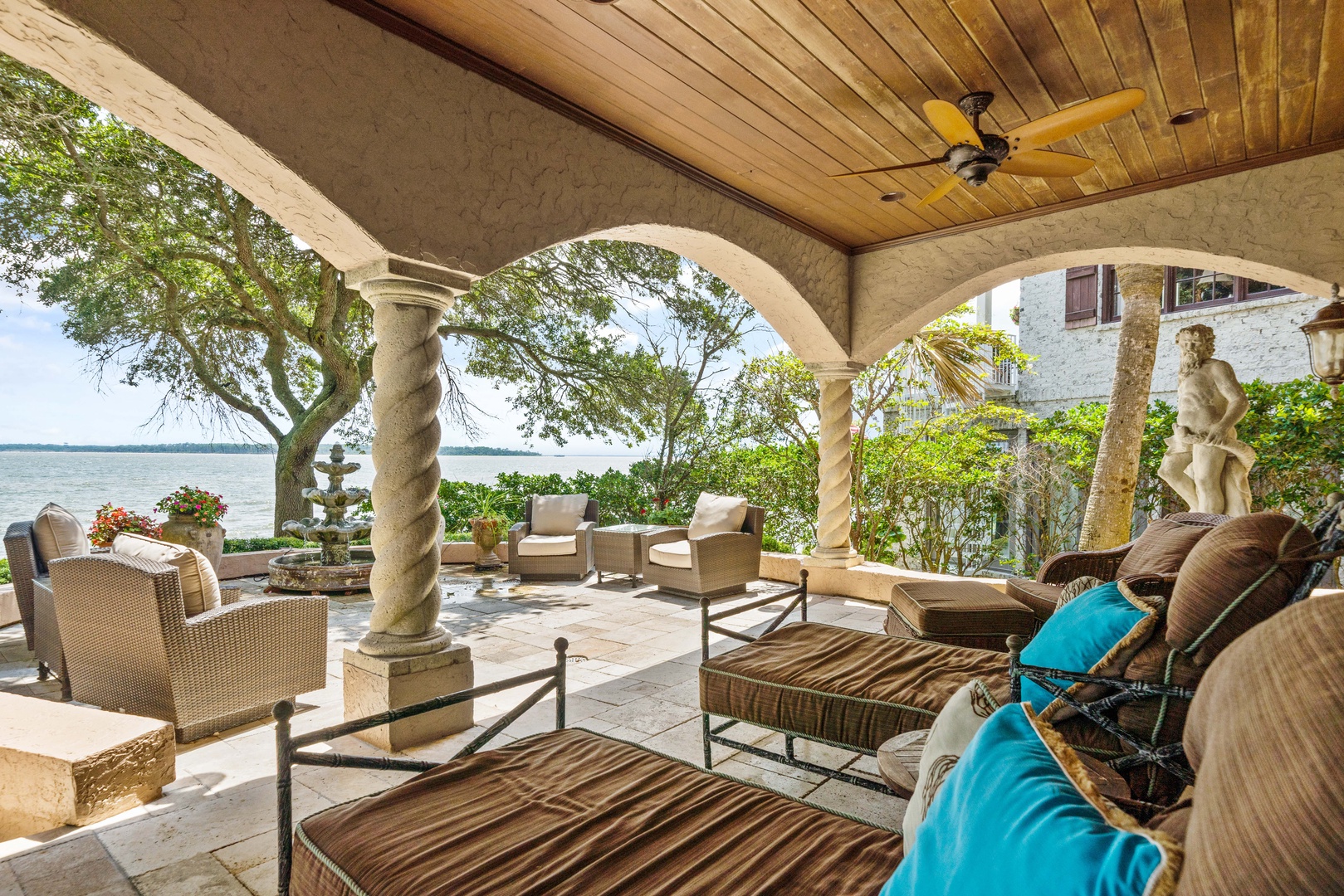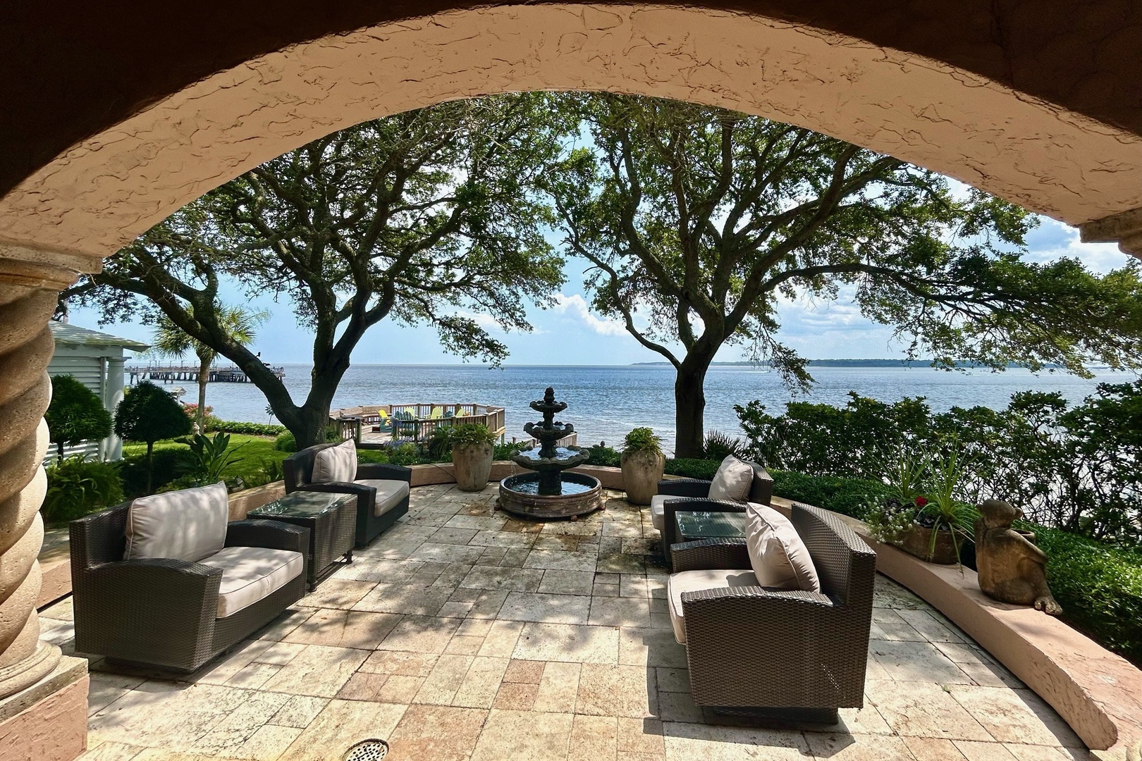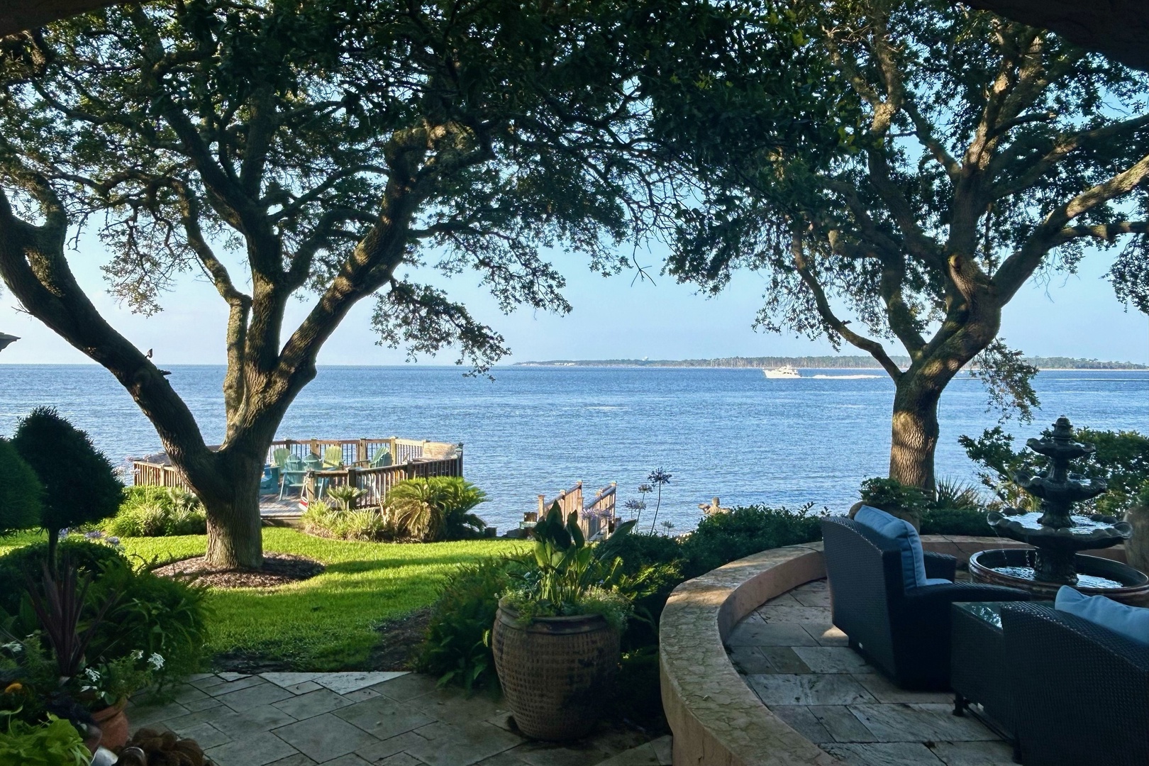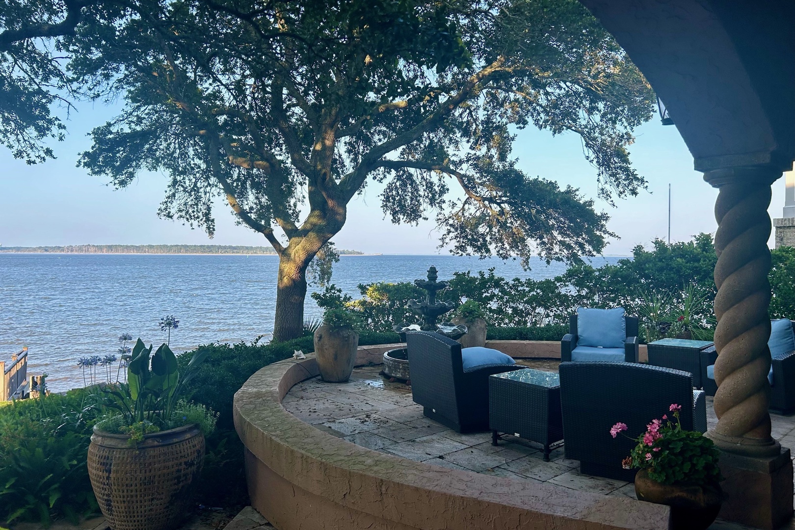 Step onto the spacious liana and be captivated by the panoramic vistas of the Atlantic Ocean, St. Simons Sound and Jekyll Island. This serene outdoor space is perfect for morning coffee or evening cocktails, where you'll enjoy the gentle sounds of the fountain and the waves breaking on the shoreline. Shaded beneath majestic live oak trees, discover a tranquil seating area that invites you to unwind and savor the Island’s natural beauty. The breathtaking sunset over the Sydney Lanier Bridge, across the Sound, will be the capstone of your day.