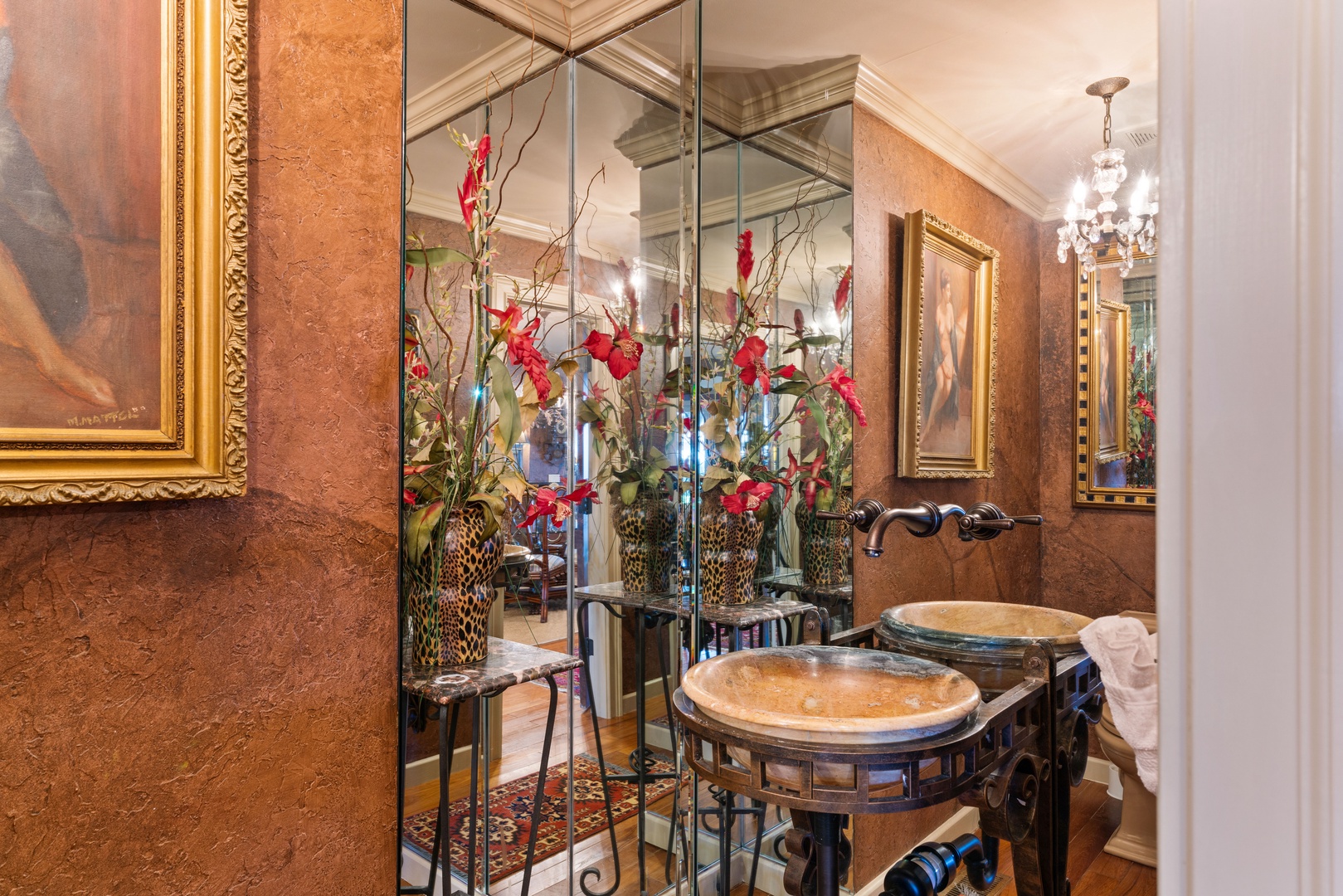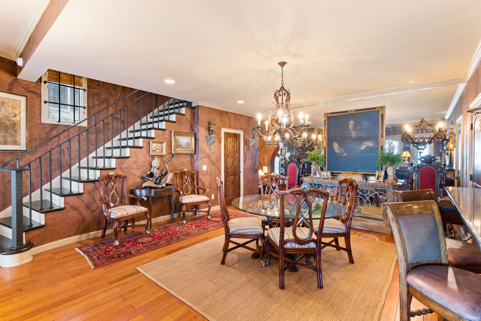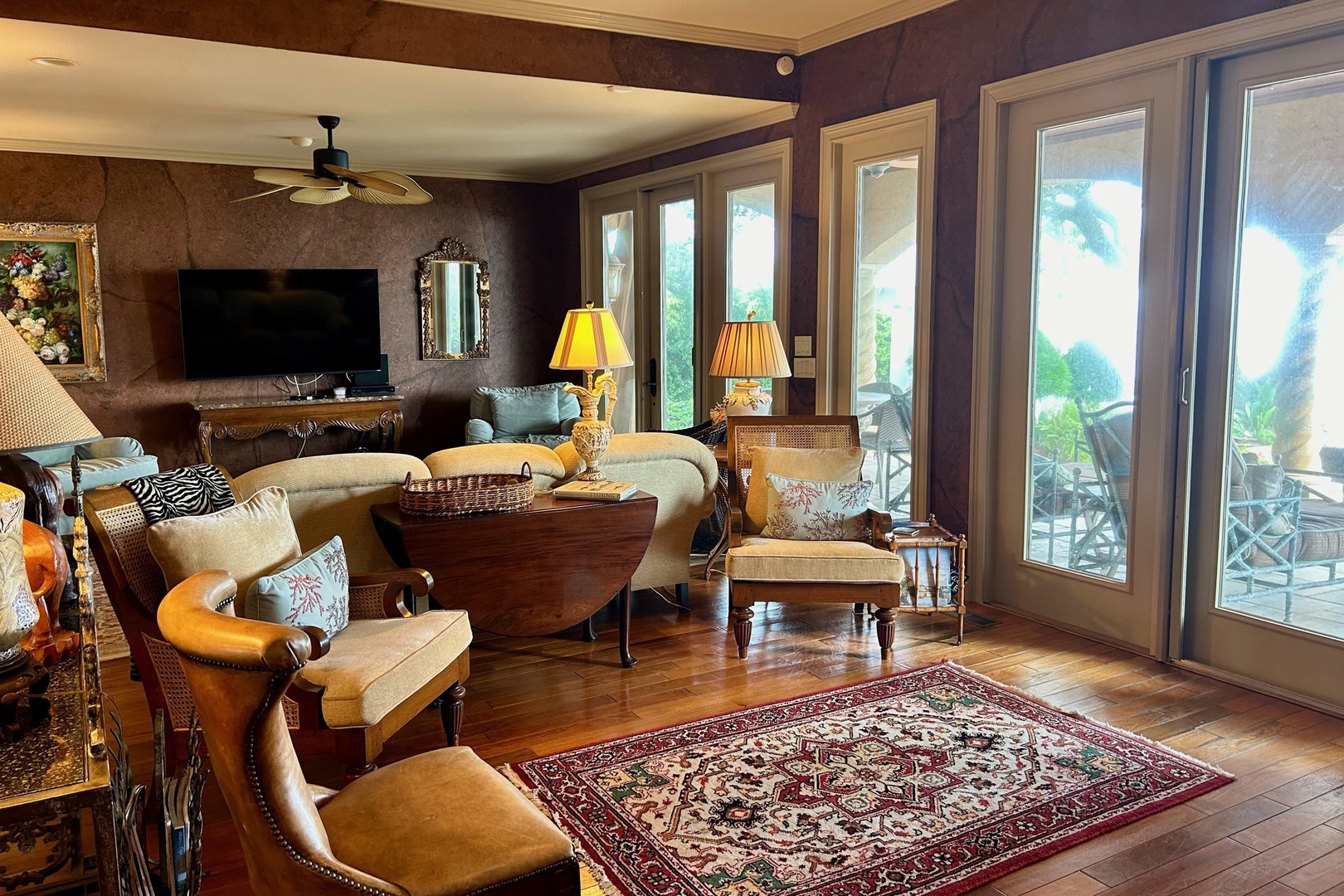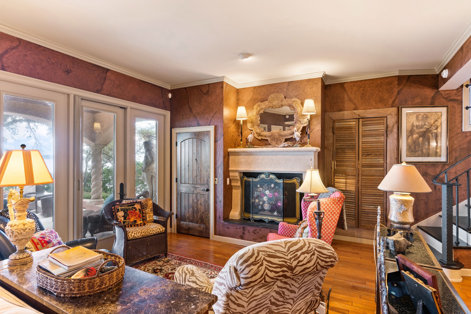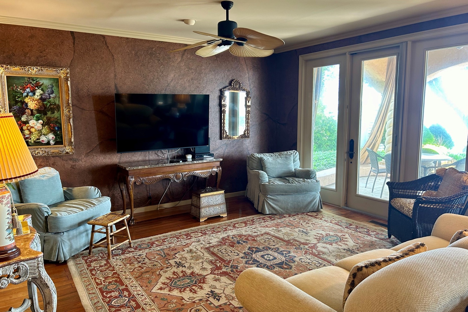 Through the custom wood and leaded glass entranceway you'll enter a small foyer with a writing desk, closet and life-size statue. Up three steps you will be in the formal dining room and open floorplan family/TV room and fireplace/conversation area. To the side is a powder room. From this main living space you'll enjoy a wall of glass opening to the covered liana and amazing views of the water and Jekyll Island. The modern TV (80") and lightning- fast internet (100mbps) will serve all your streaming and tech needs.