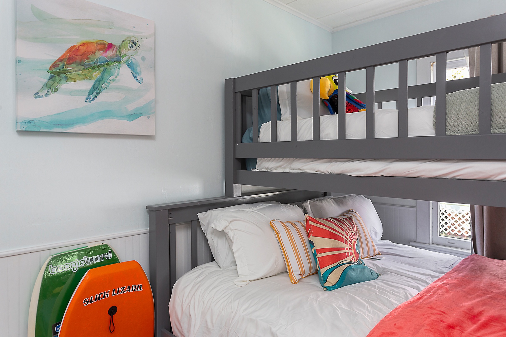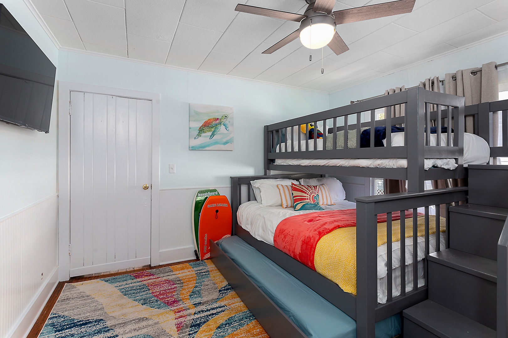 Bunk Room: Custom built-in big ole' bunk bed - queen bed on the bottom, climb the stairs to a twin, and pull out the hidden twin trundle as needed to sleep 4 comfortably. Again, comfy bedding, and the same technology as the master - big Smart TV, plenty of channels, premium audio system. The bunk room is also close to the bathroom.