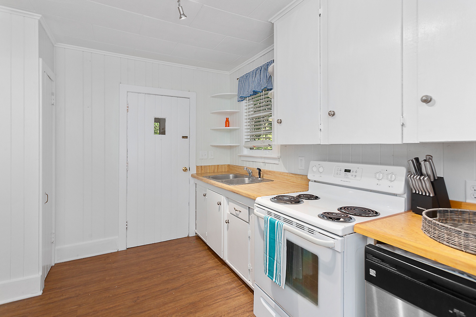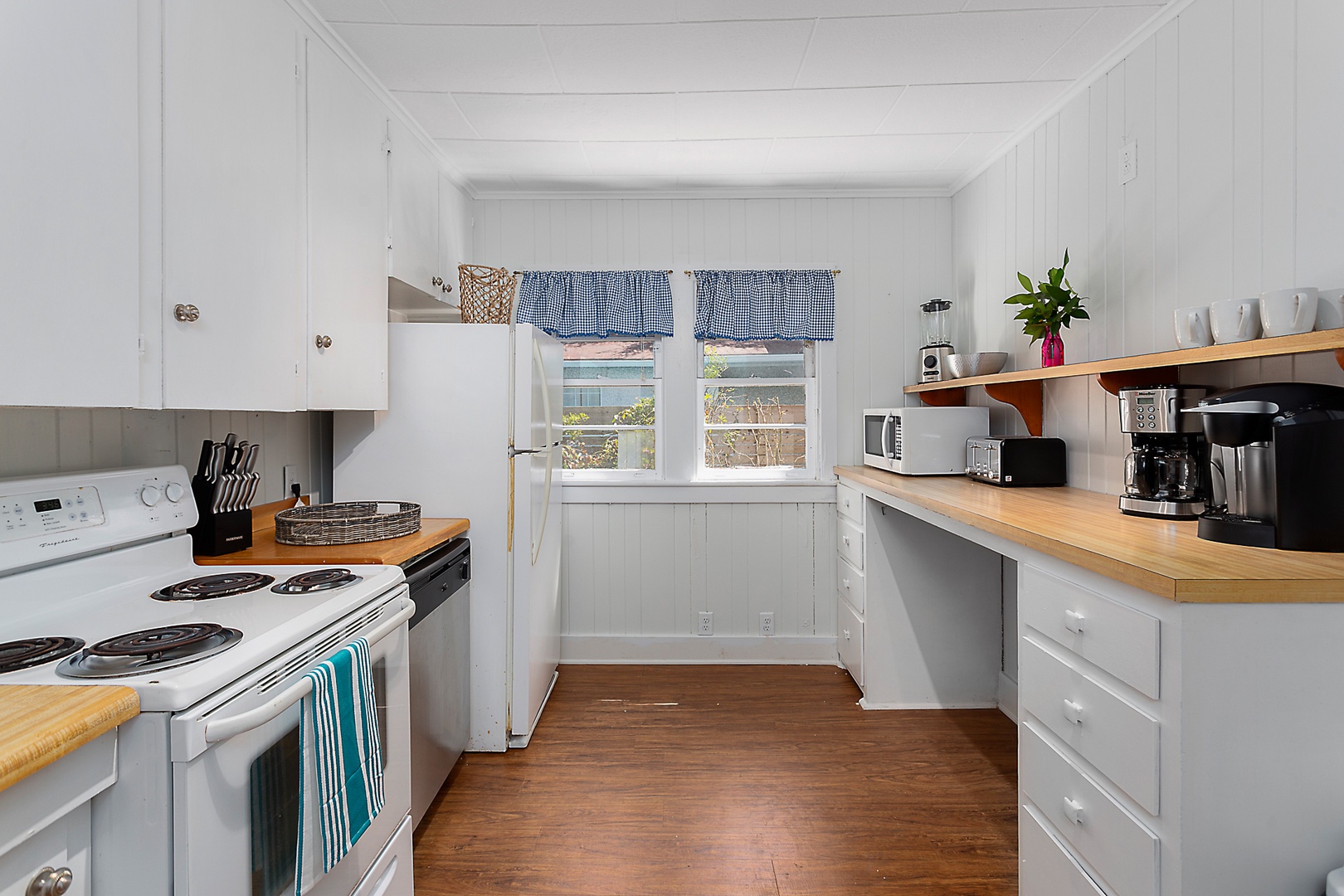 House - we have 2 comfy bedrooms and one basic bath. Honestly the kitchen, bath and laundry are nothing to write home about - but you'll find all are neat as a pin. More details of kitchen stock is below.