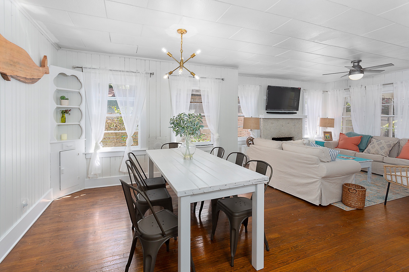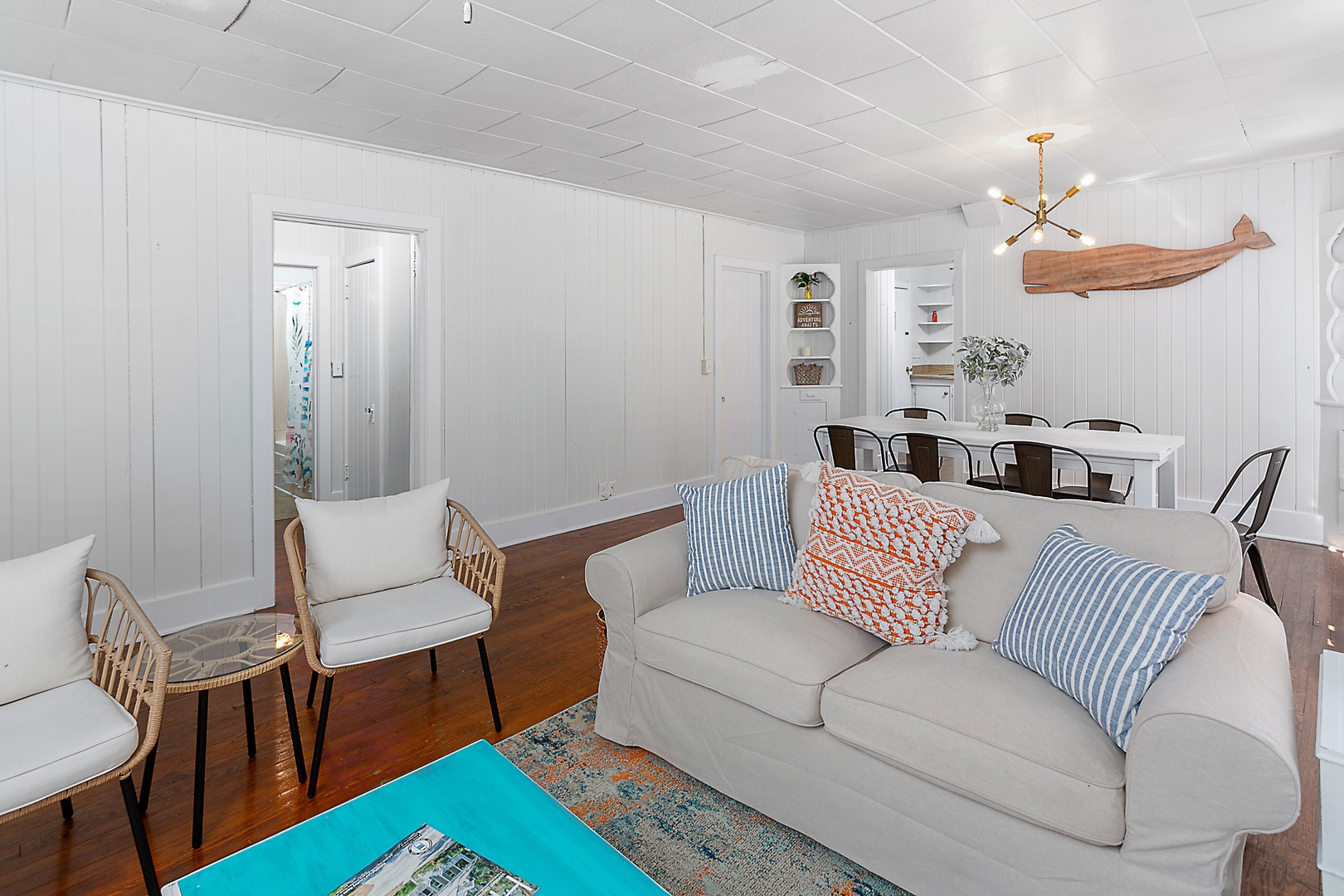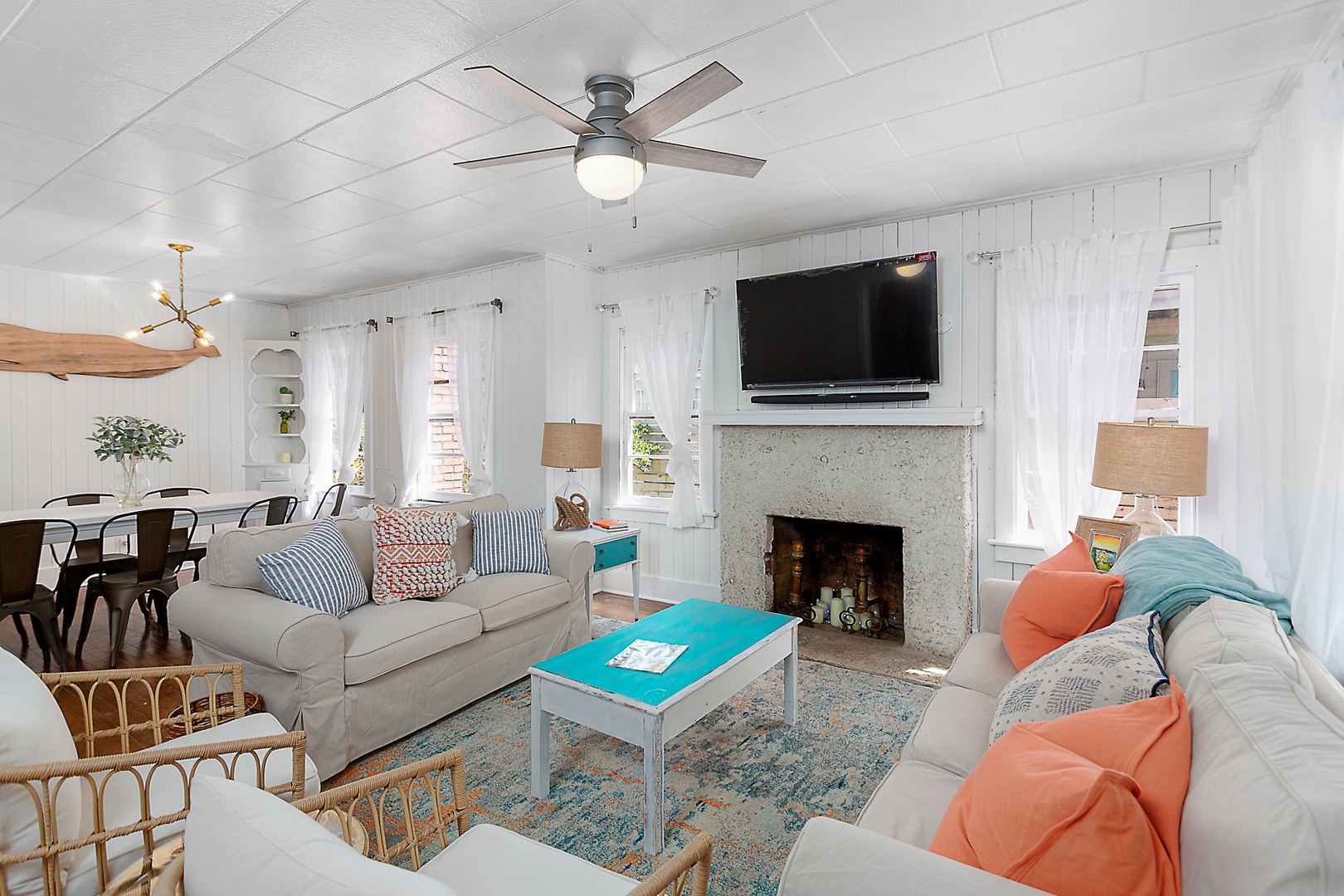 Living and Dining Room: Open concept living and dining room. Here again, big smart TV, plenty of channels, premium audio system, and sounds of the ocean at high tide.