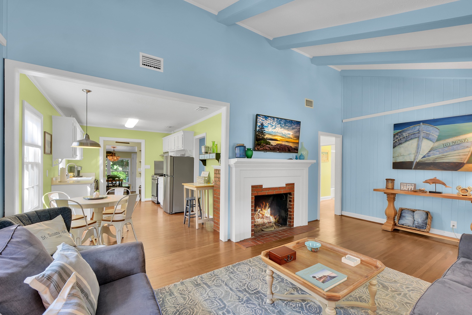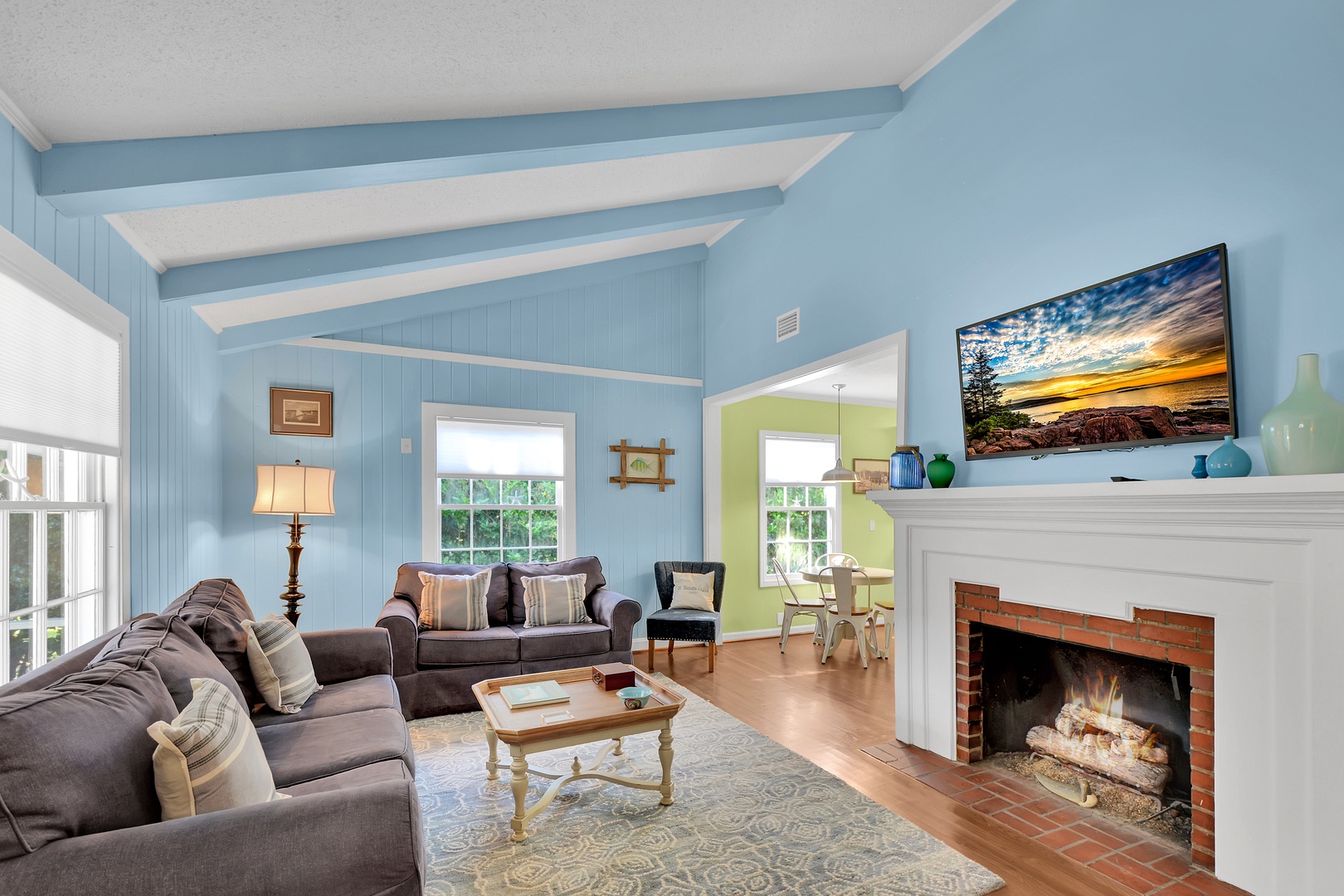 Upon entering the front door, you will find lovely hardwood floors, a 48” TV and vaulted ceiling. This living area has a sofa and loveseat which is open to the dining area and kitchen. The fireplace pictured is nonfunctional and must not be used.