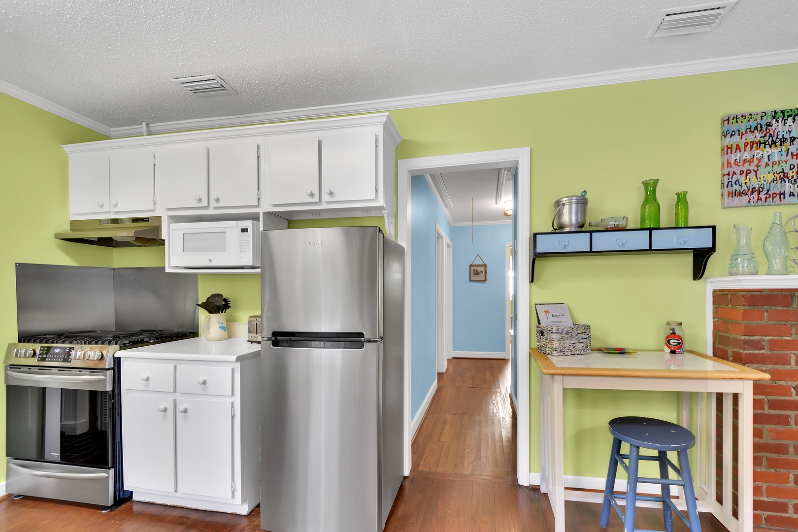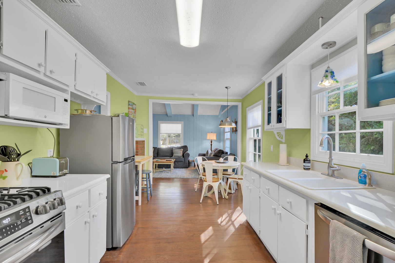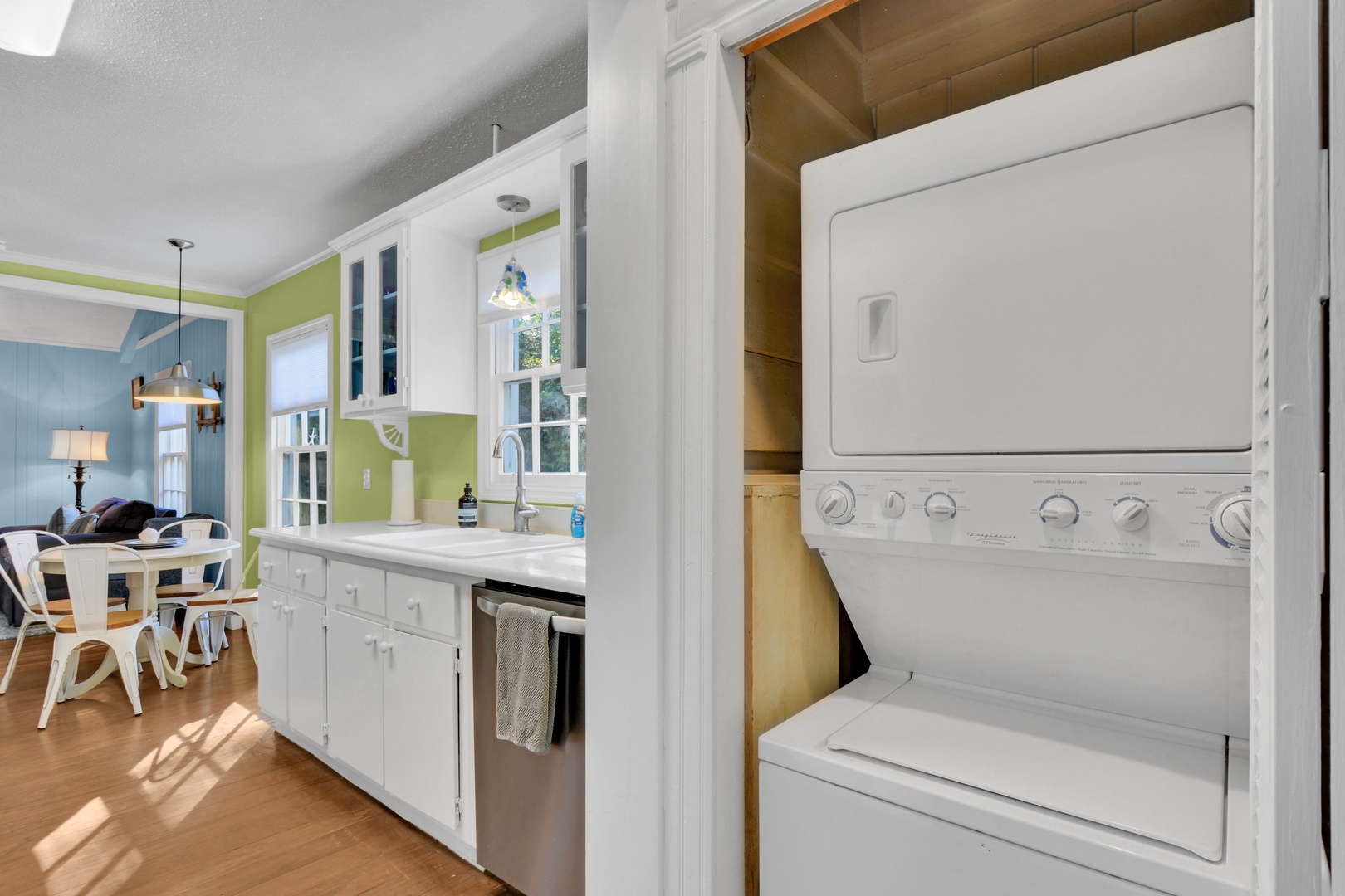 In the galley style kitchen is an eating table with 4 chairs, a Keurig coffee maker, completely stocked kitchenware, microwave, toaster, refrigerator and dishwasher. A step down into the butler's pantry you will find a stackable washer/dryer.