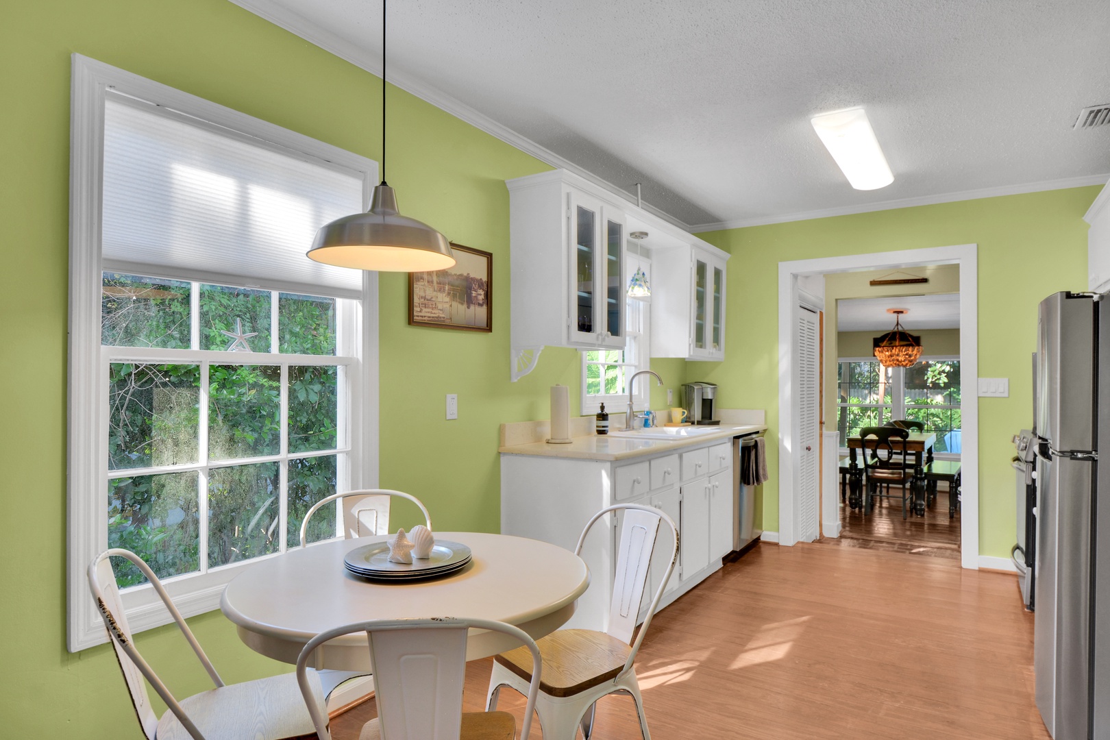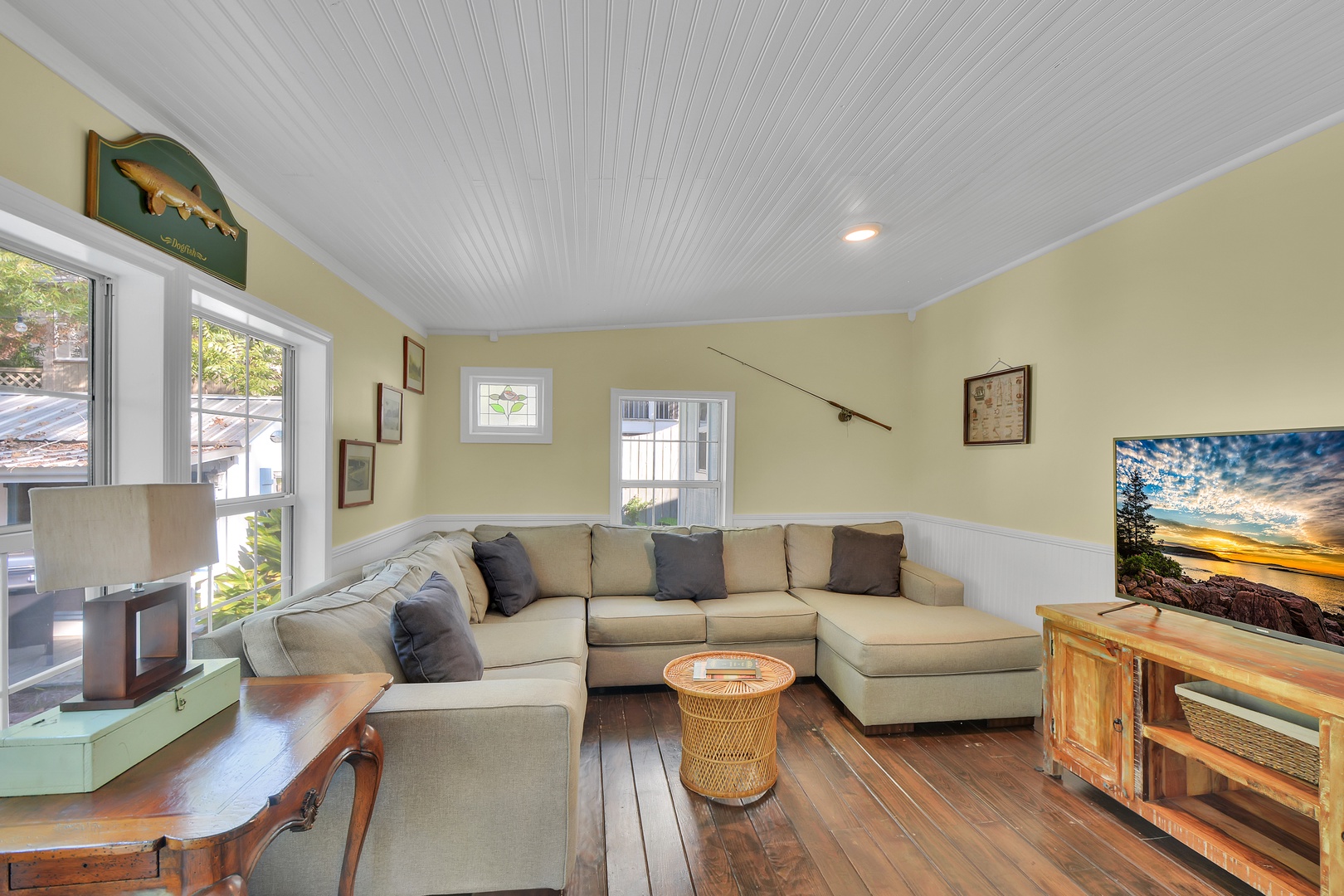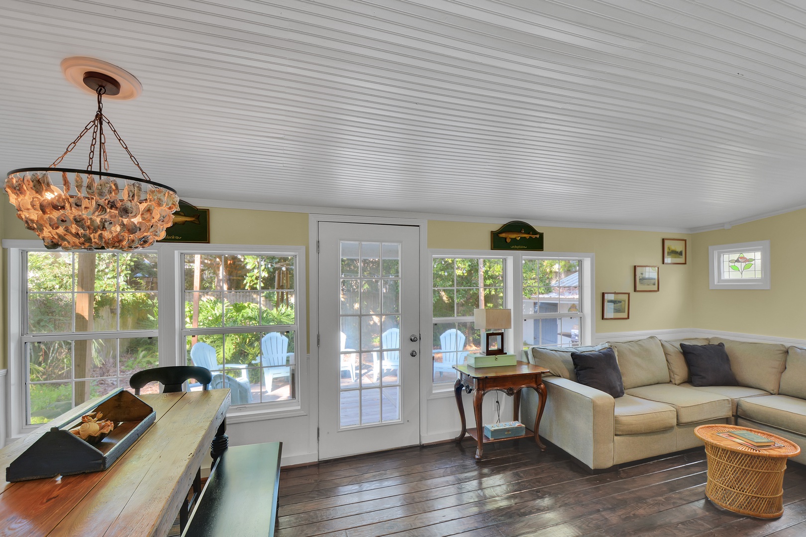 The back family room has a large harvest table under a unique oyster shell chandelier with bench seating. This room also has a sectional sofa with a 50” TV.