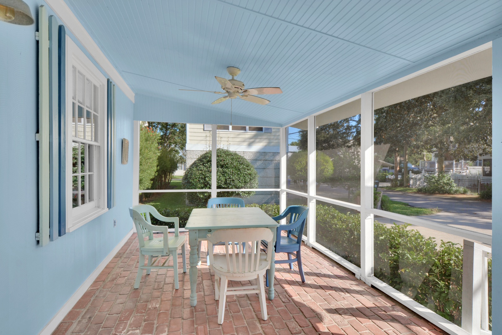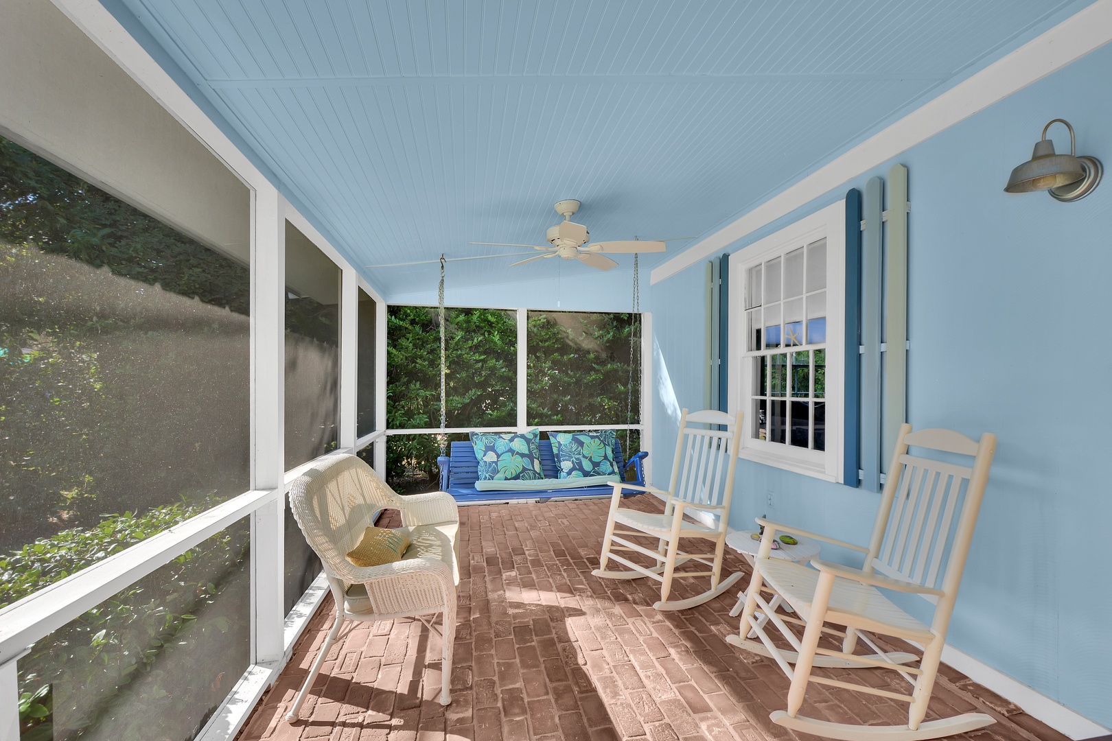 Relaxing areas include a large screened in front porch, open back porch with fenced in back yard, a seating area in the front of the home with a TV and family room in the back of the home with TV.