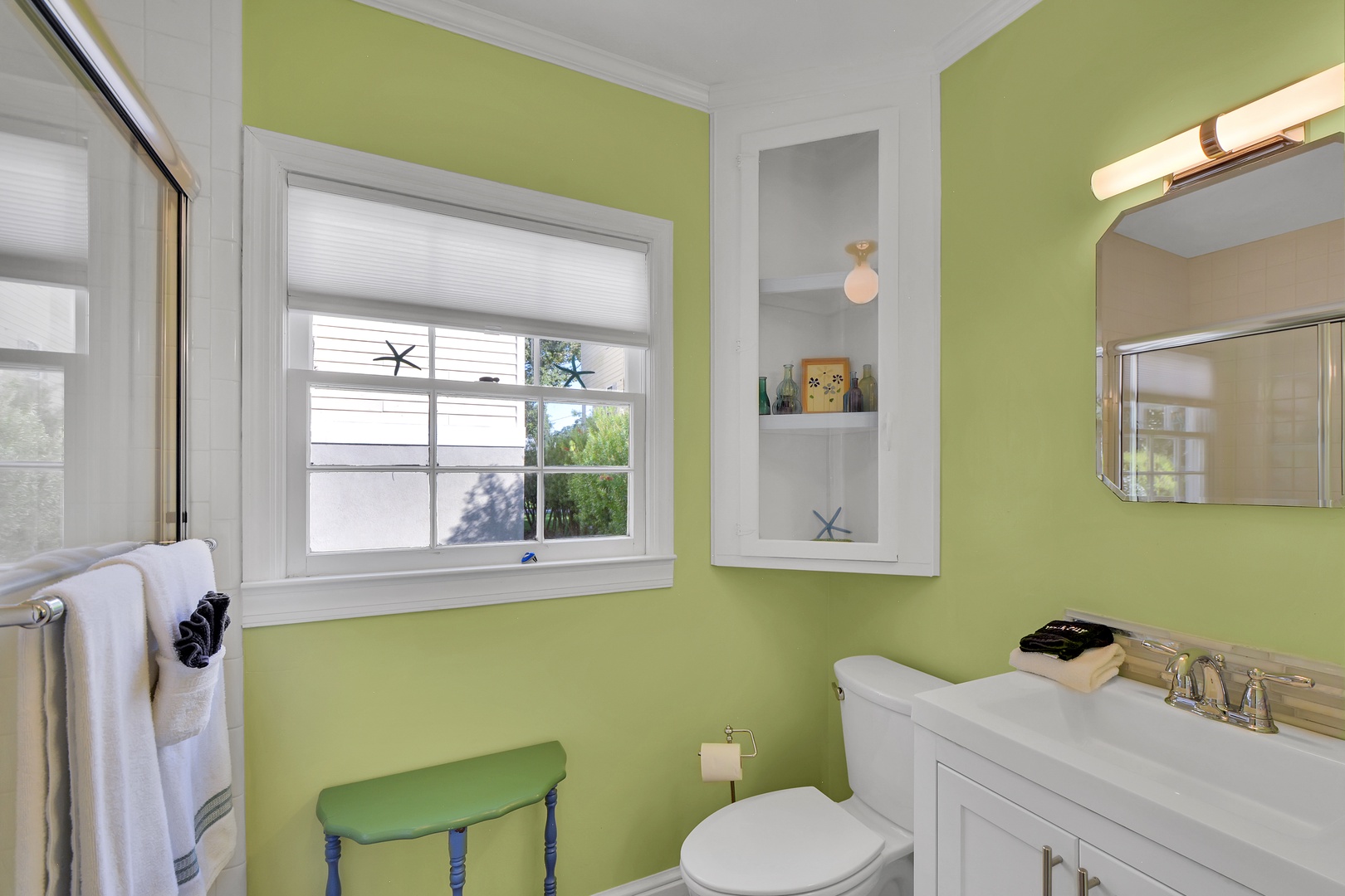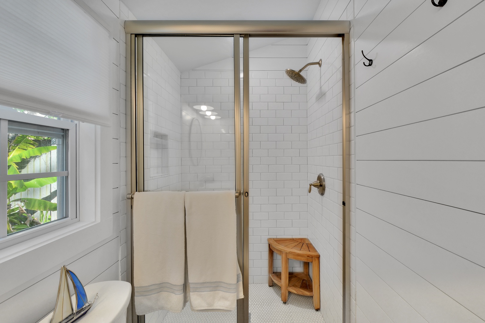 The sleeping-side of the cottage has a built-in desk, bookshelves, guest bath, step-in shower, with glass-sliding door.