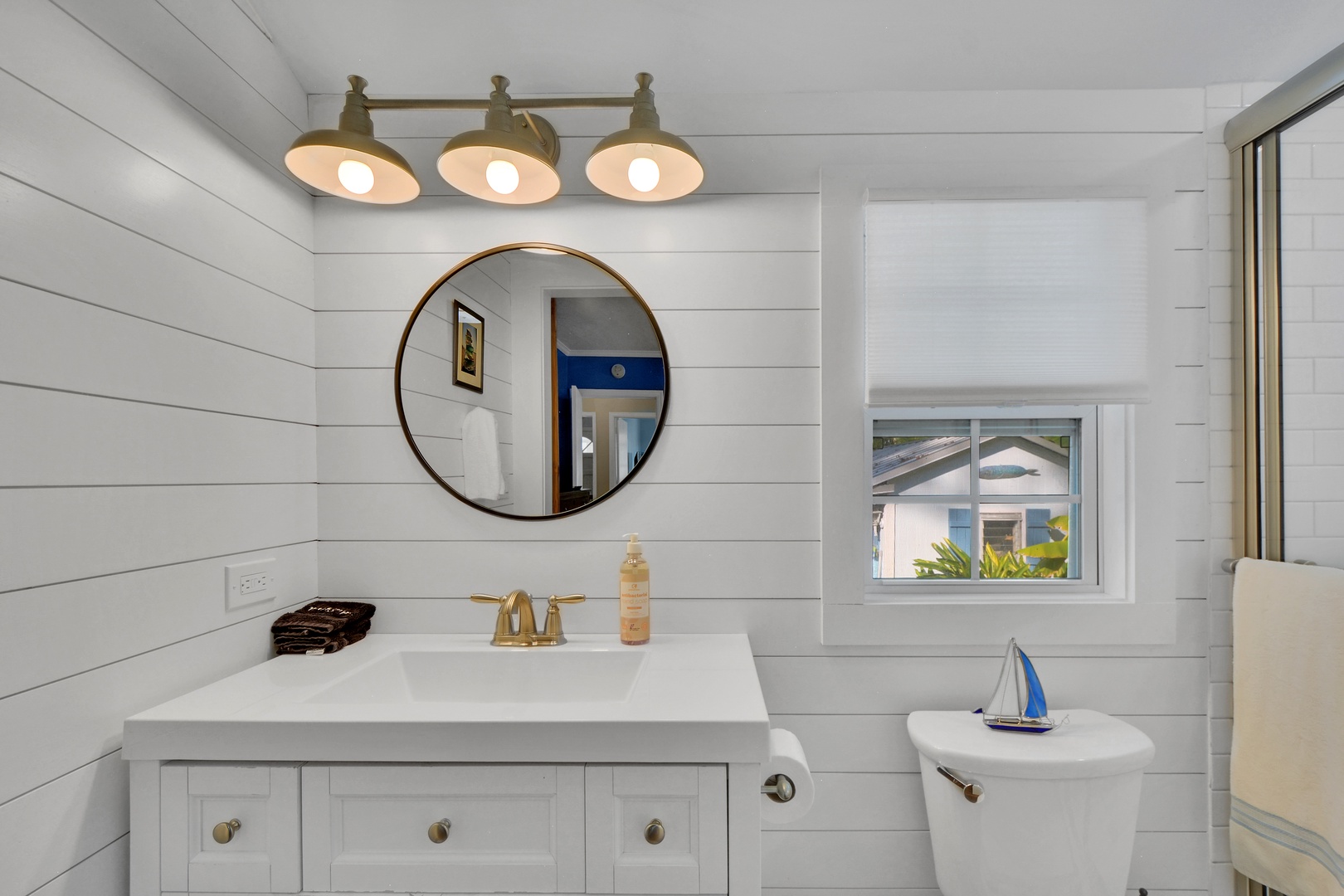 Blue Room – Primary Suite, Queen Bed 32” TV, ensuite bath with barn door entry, shower and single sink